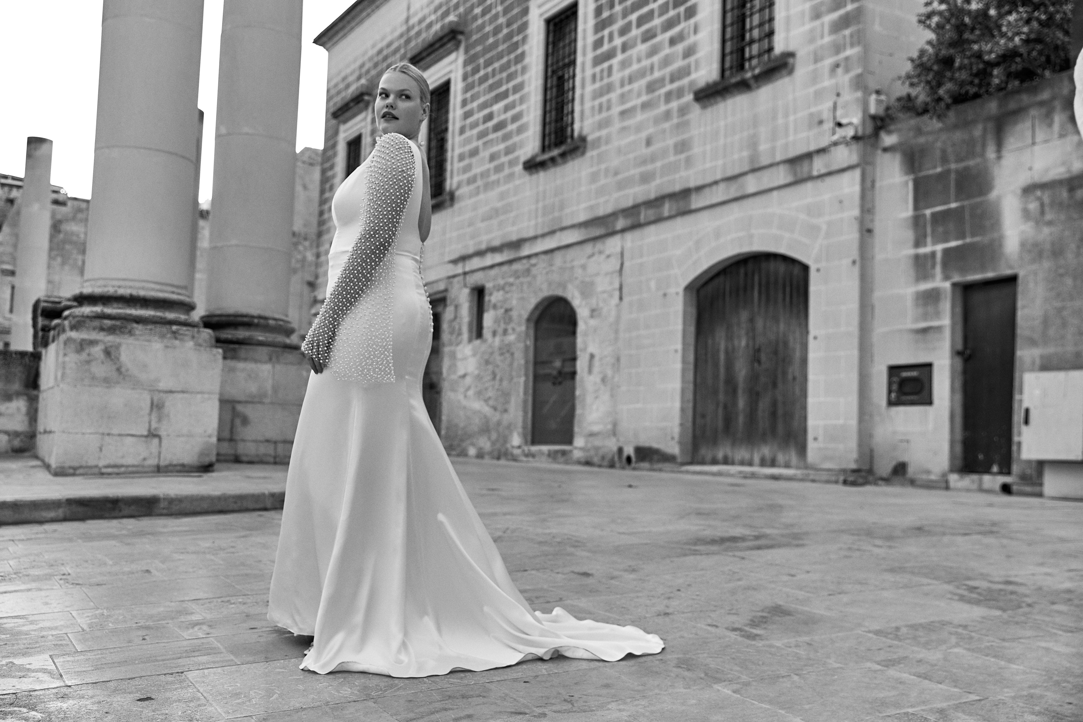 The 2024 Collection is completed by a number of customizable elements – such as our long pearl cape, pleated cuff sleeves, ruched creppone cuff and bell sleeves, and pearl bell sleeves – so you can realize your own unique vision of bridal perfection (or take your own artistic license, if you will).
