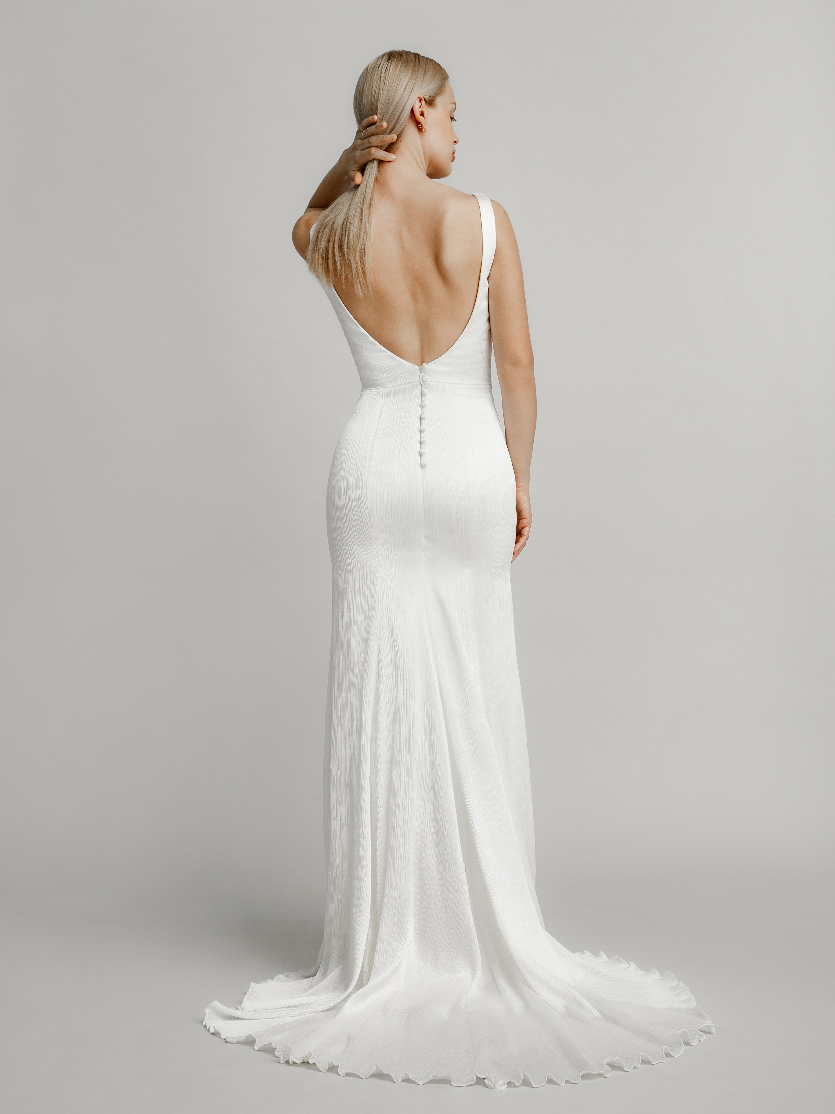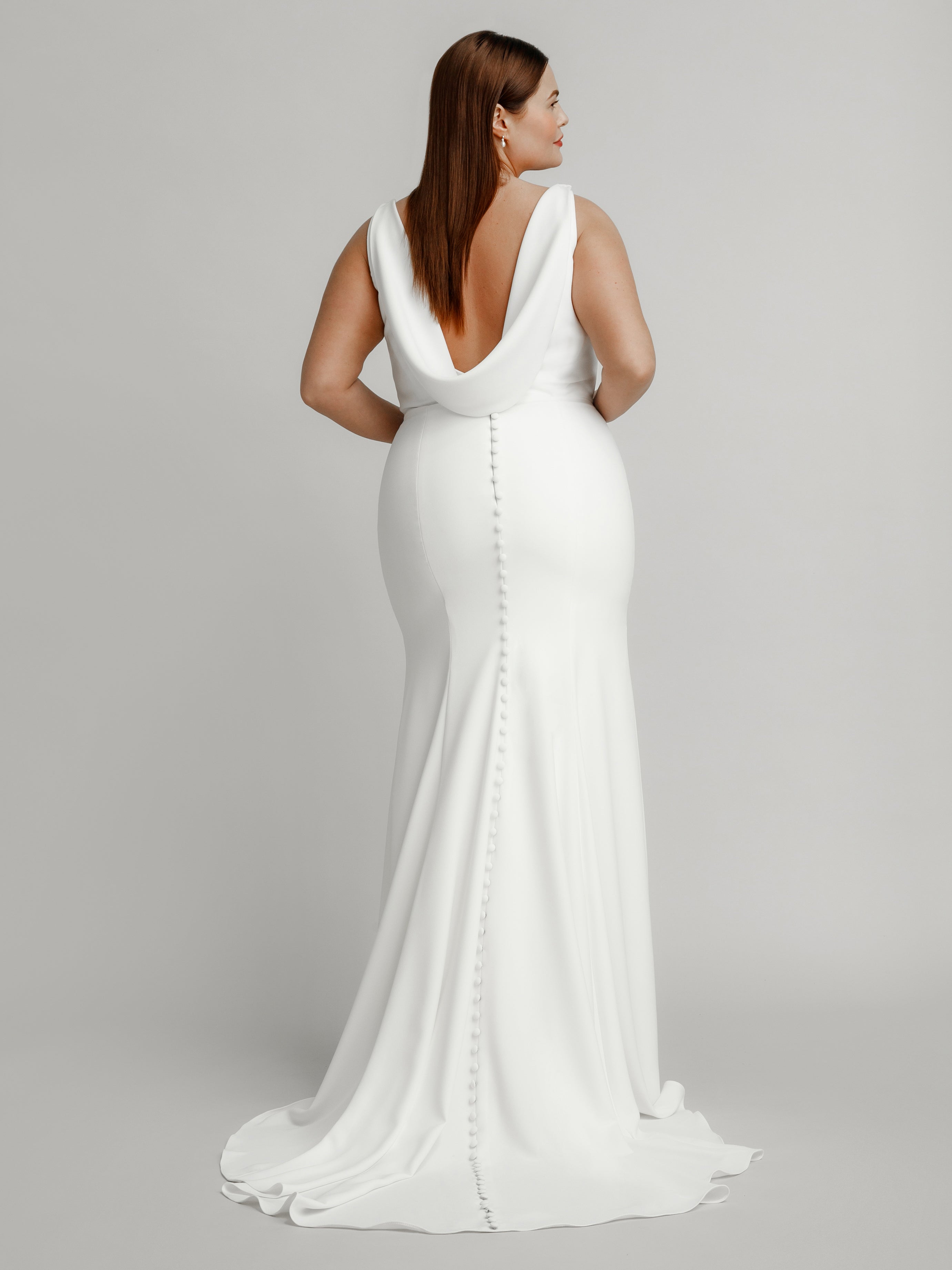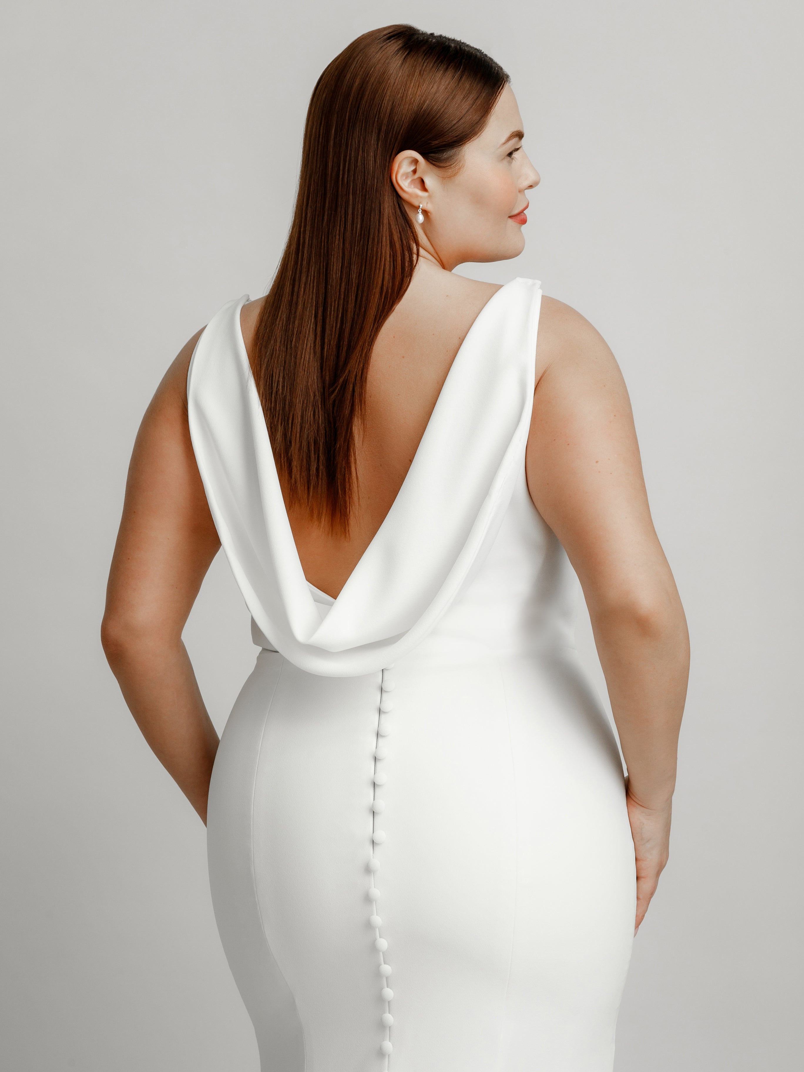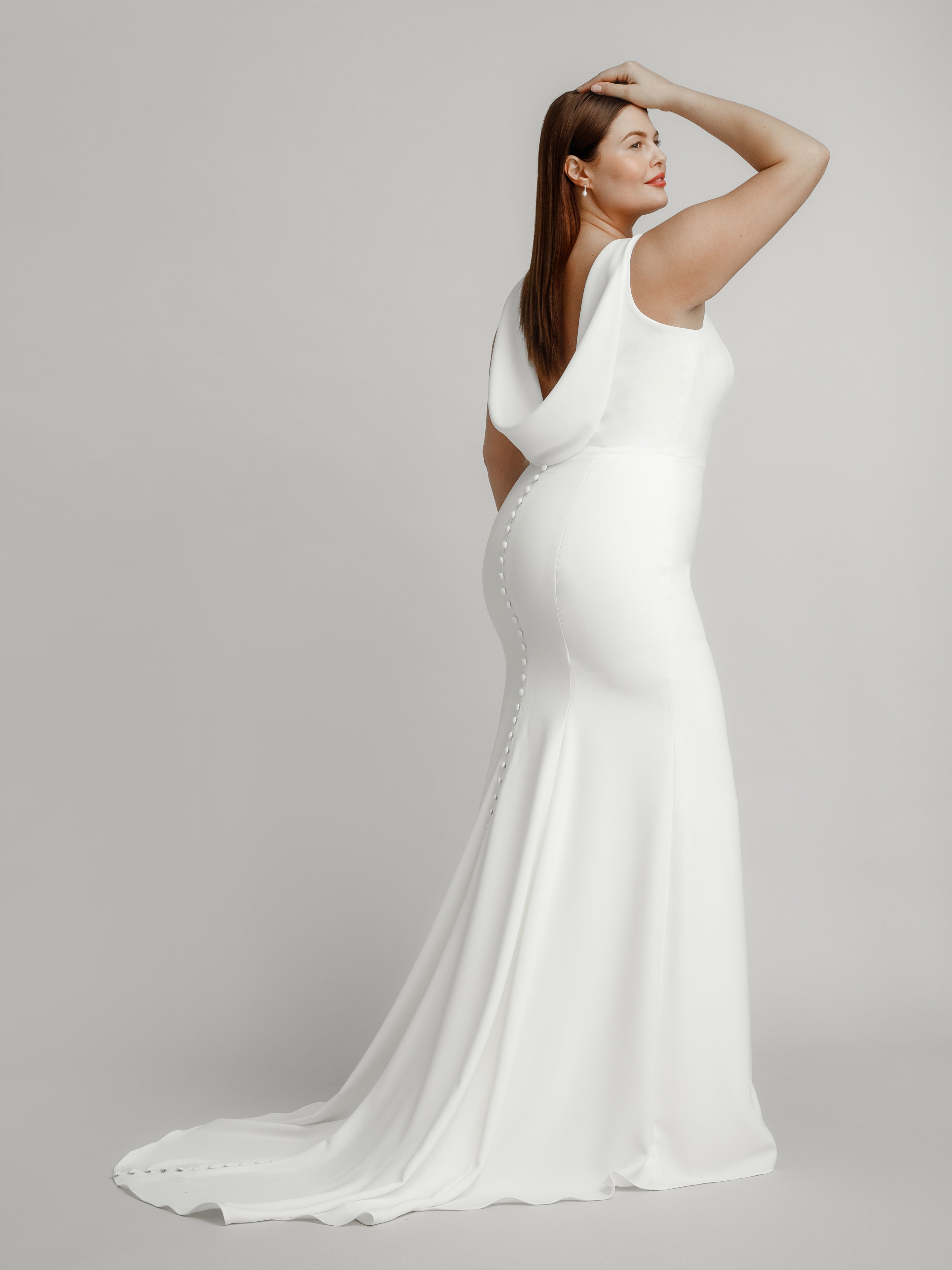 Adele’s silhouette is a sophisticated one, with a refined high neck bodice that skims the collarbones and gives way to a low scoop back. At the back, delicate buttons run the length of the modern mermaid skirt and 65" train. For a little more drama, brides can add sleeves or an elegant cowl for an accentuated feminine shape. Adele is made with textured satin, liquid satin, or crepe, and lined with off-white midori.