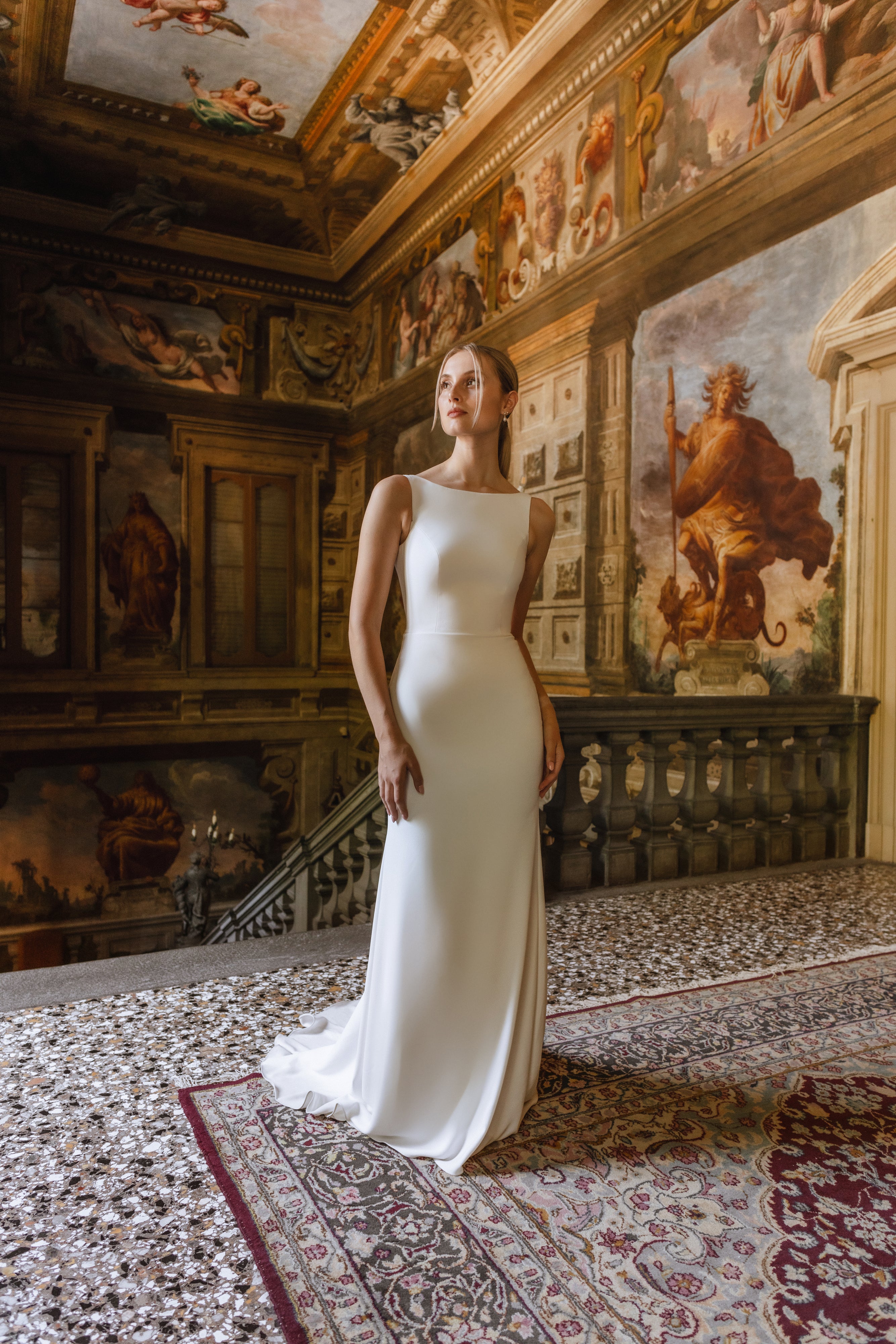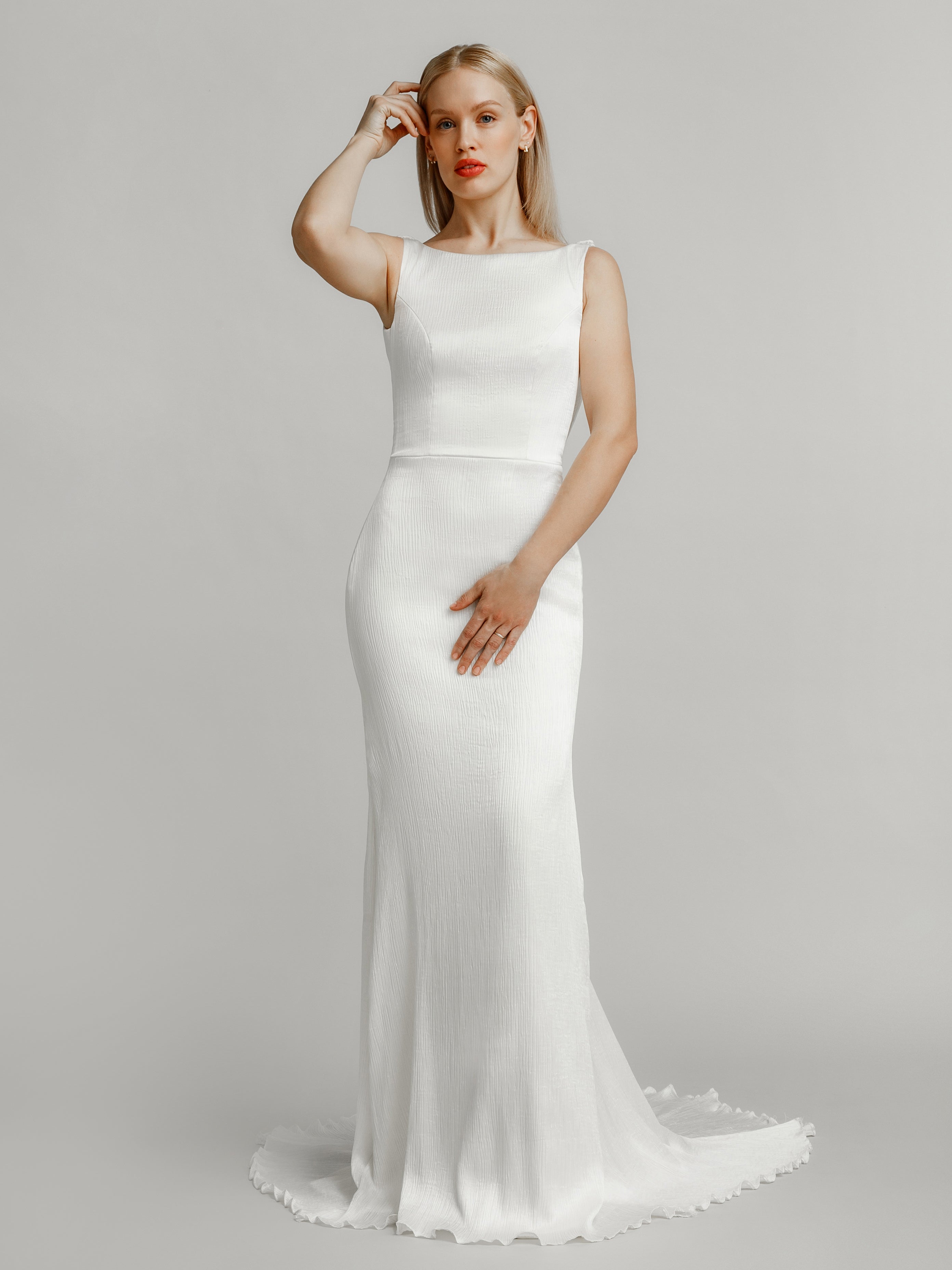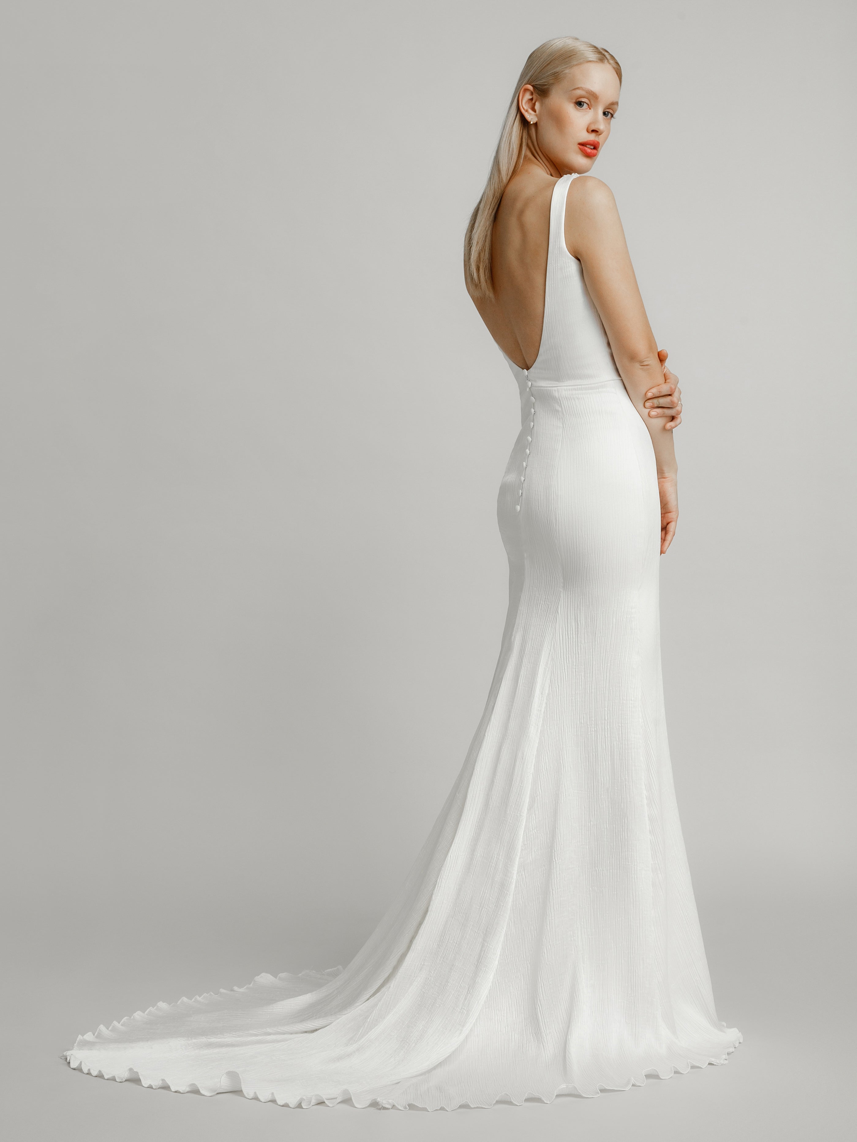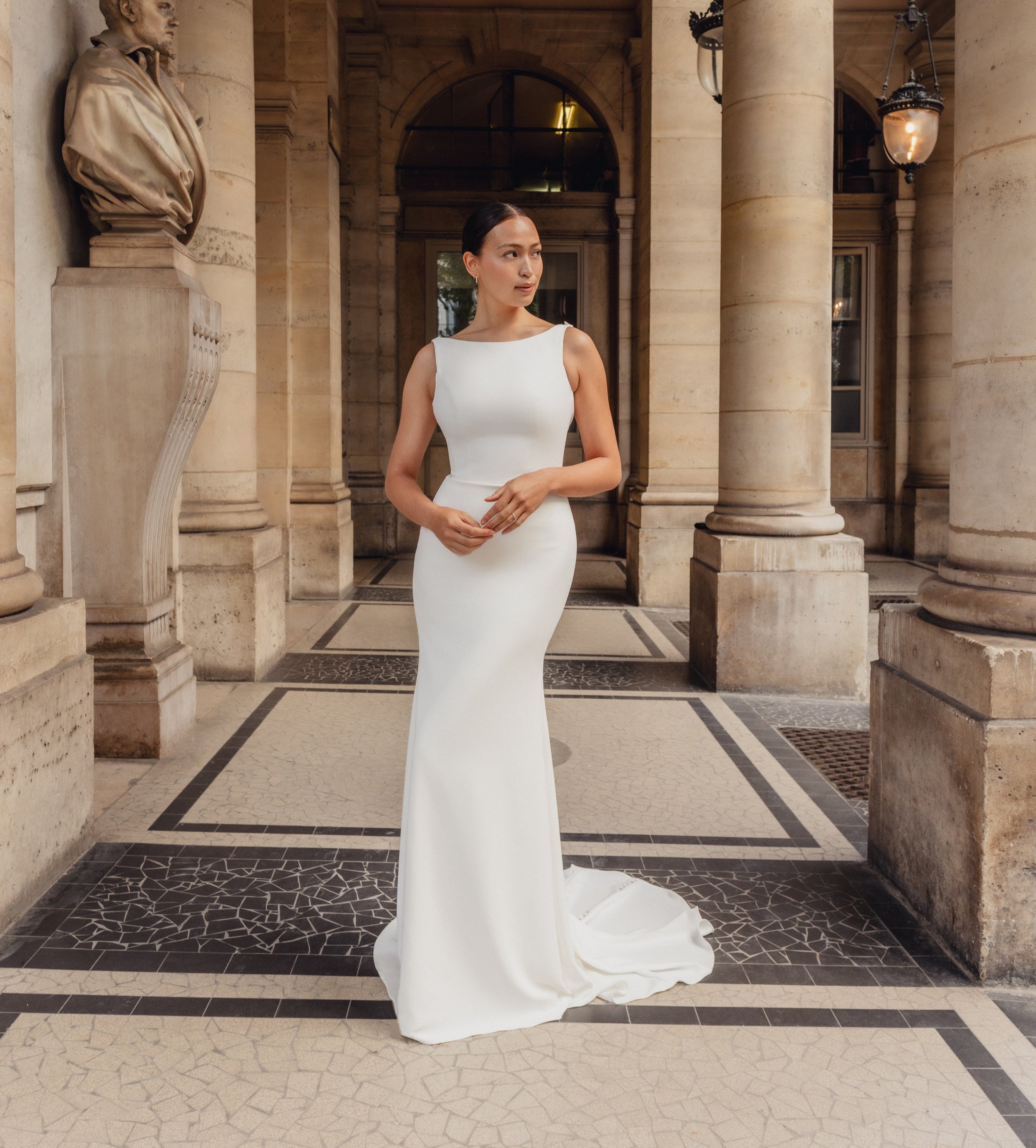 Adele’s silhouette is a sophisticated one, with a refined high neck bodice that skims the collarbones and gives way to a low scoop back. At the back, delicate buttons run the length of the modern mermaid skirt and 65" train. For a little more drama, brides can add sleeves or an elegant cowl for an accentuated feminine shape. Adele is made with textured satin, liquid satin, or crepe, and lined with off-white midori.
