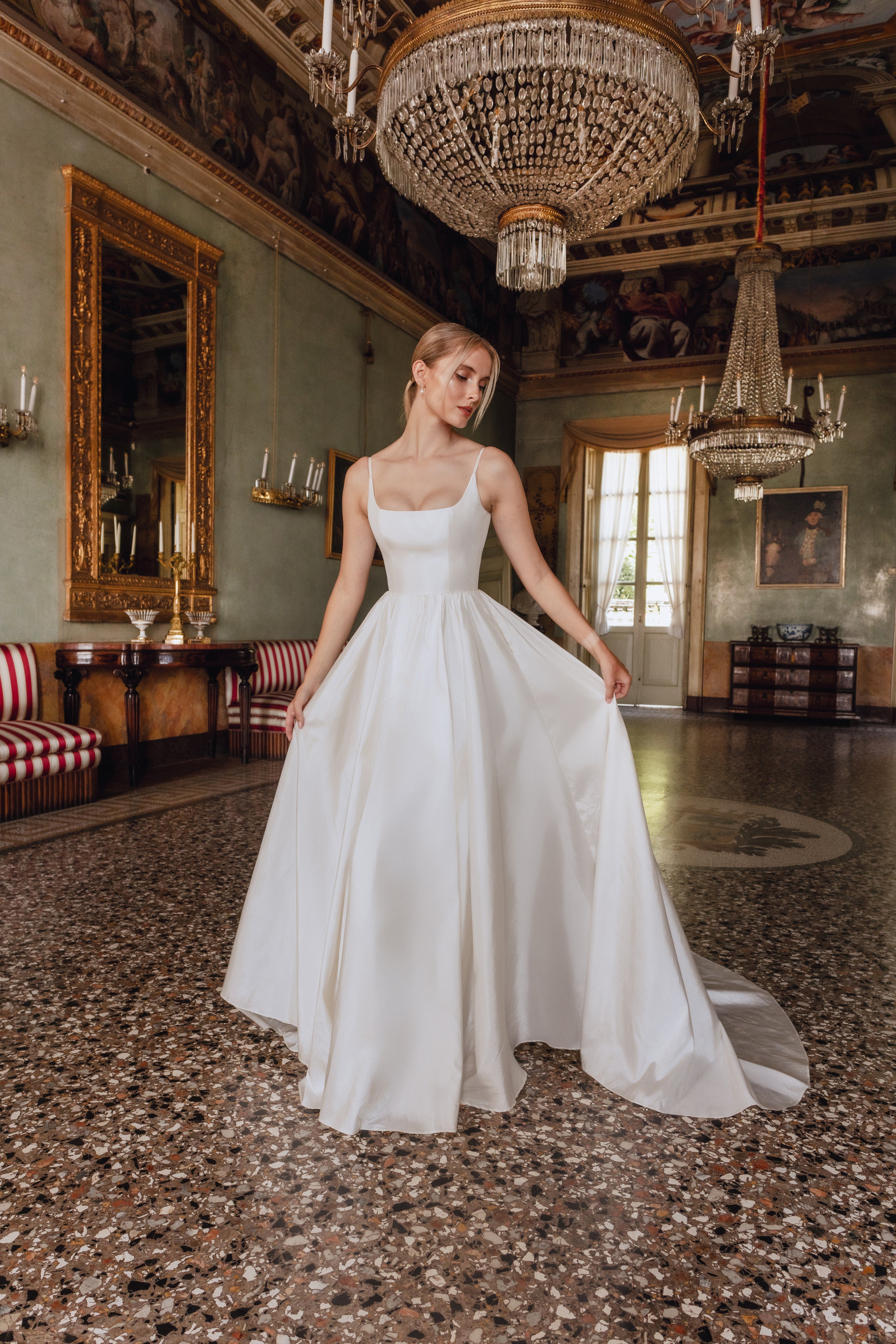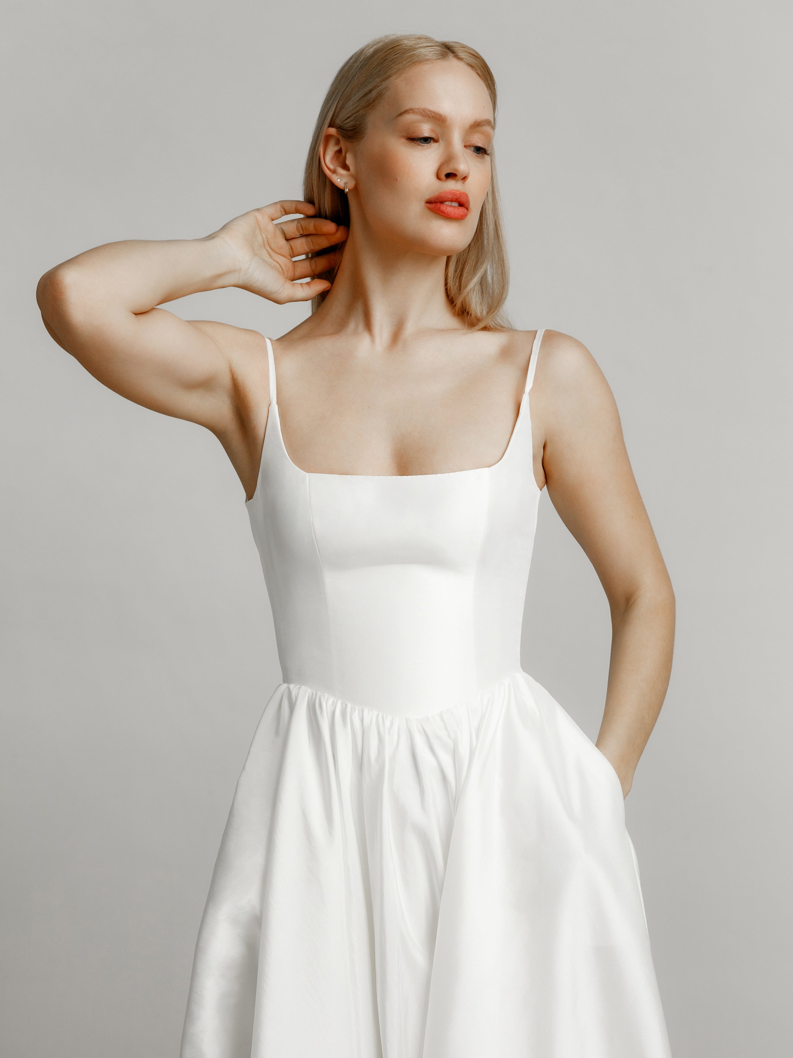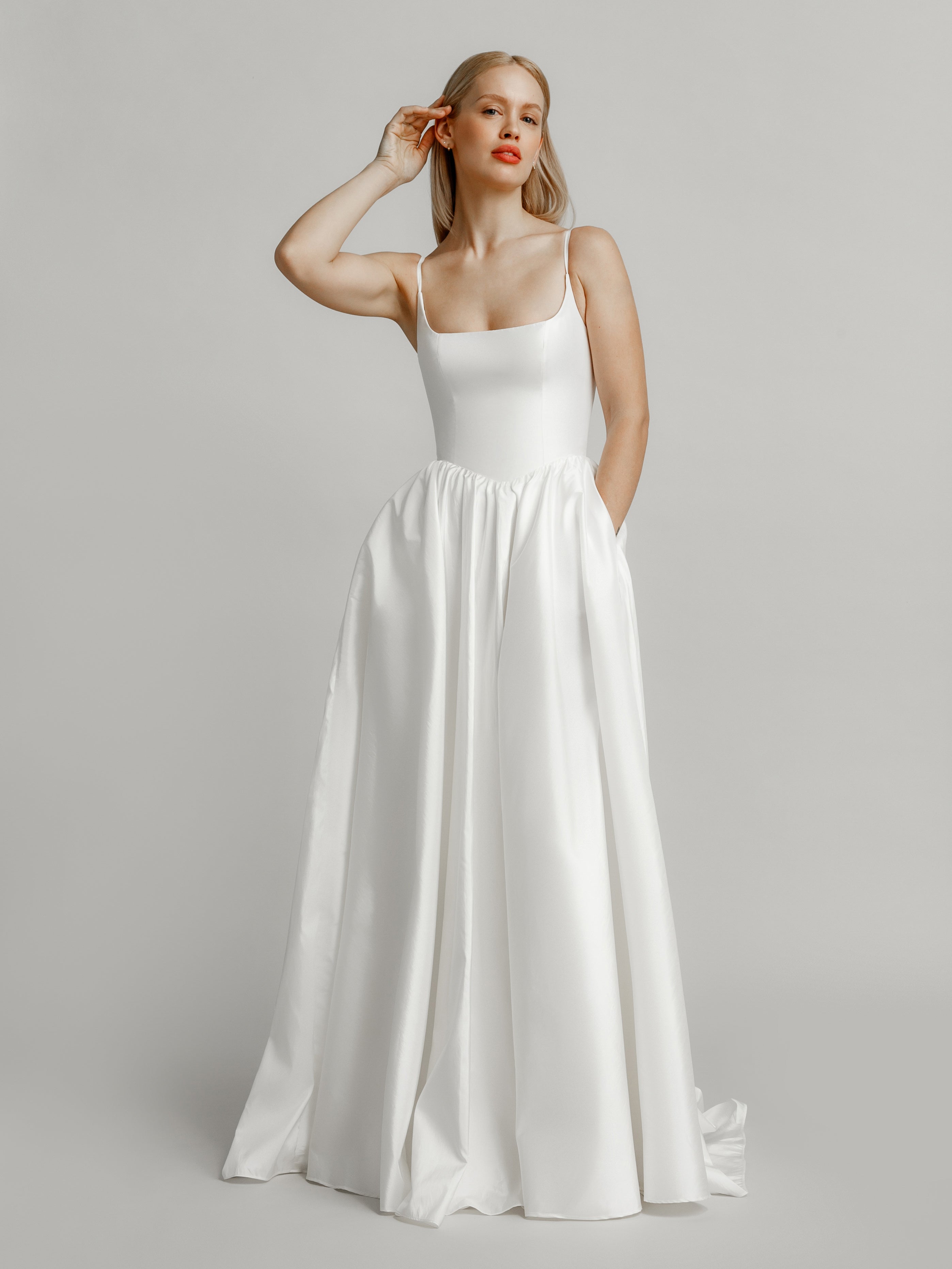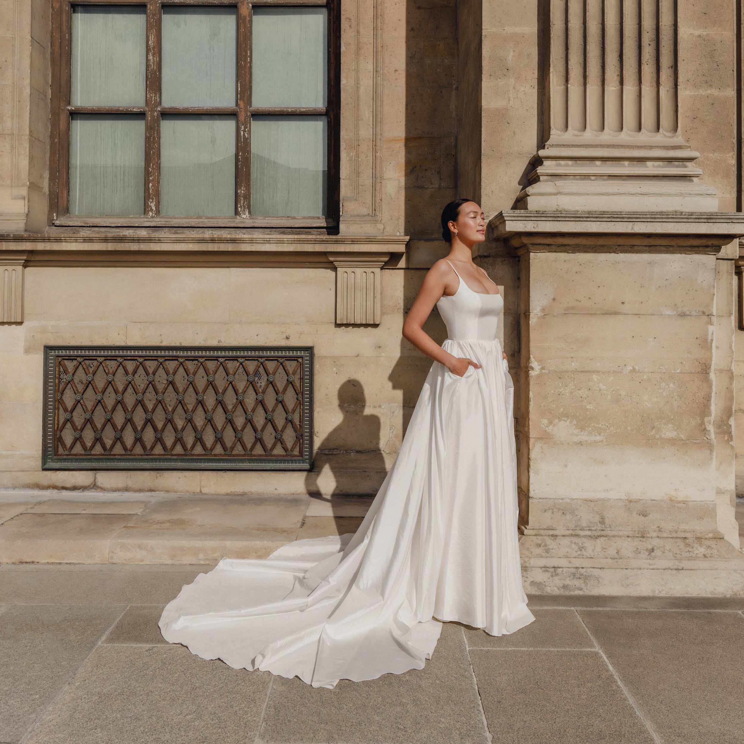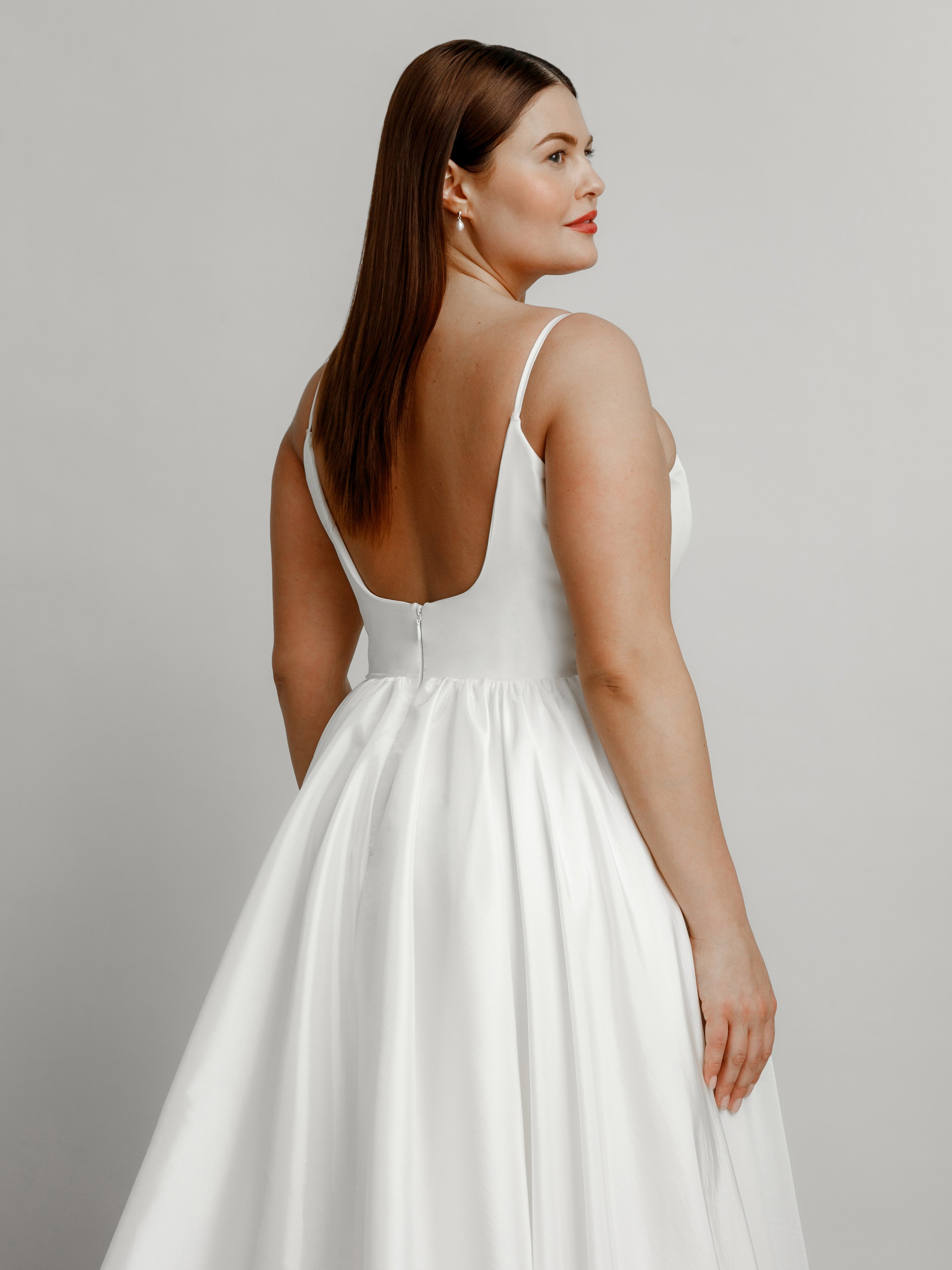 Amelie’s square neck bodice is made modern with subtly rounded corners and barely there straps. The full circle skirt, like the bodice, is made with luxurious taffeta and lined with off-white midori. The skirt has an 80" train and pockets. Amelie is the chic silhouette you deserve to look and feel your best. This style is available with a basque waist (see blonde model) at an extra cost.