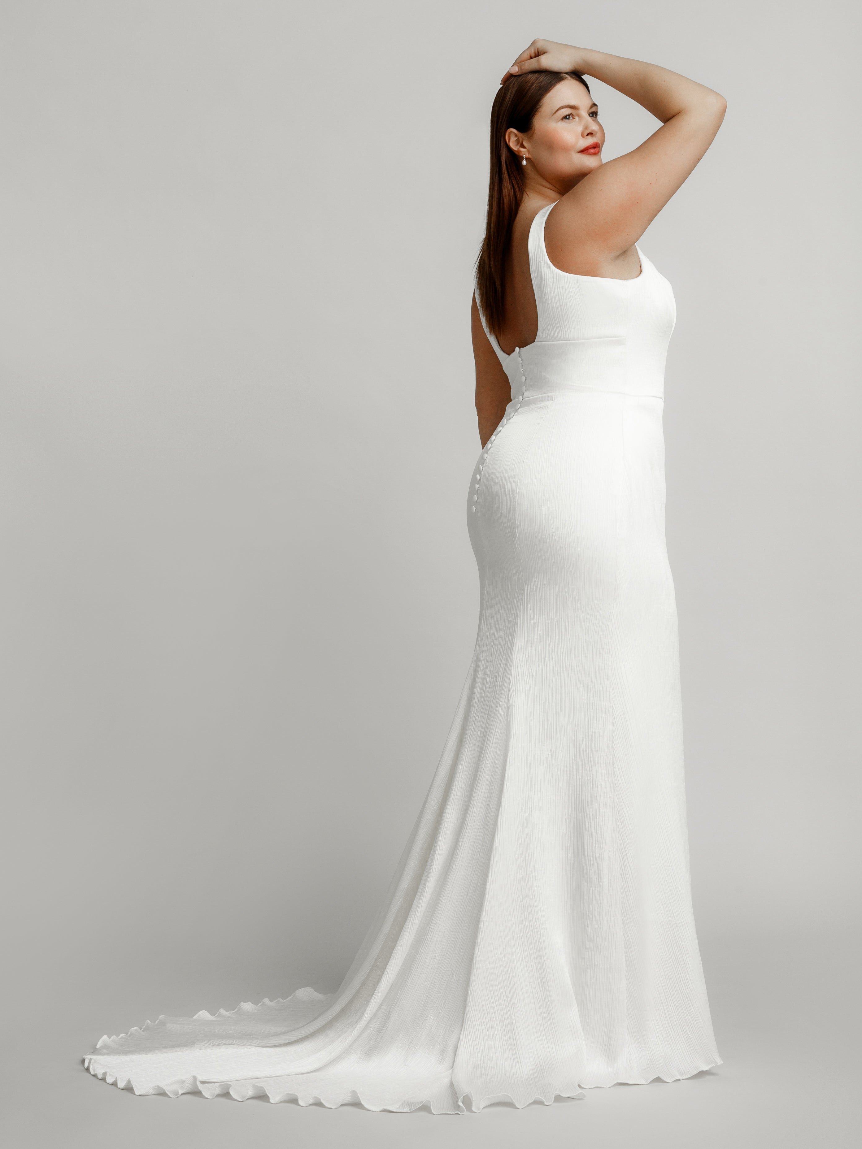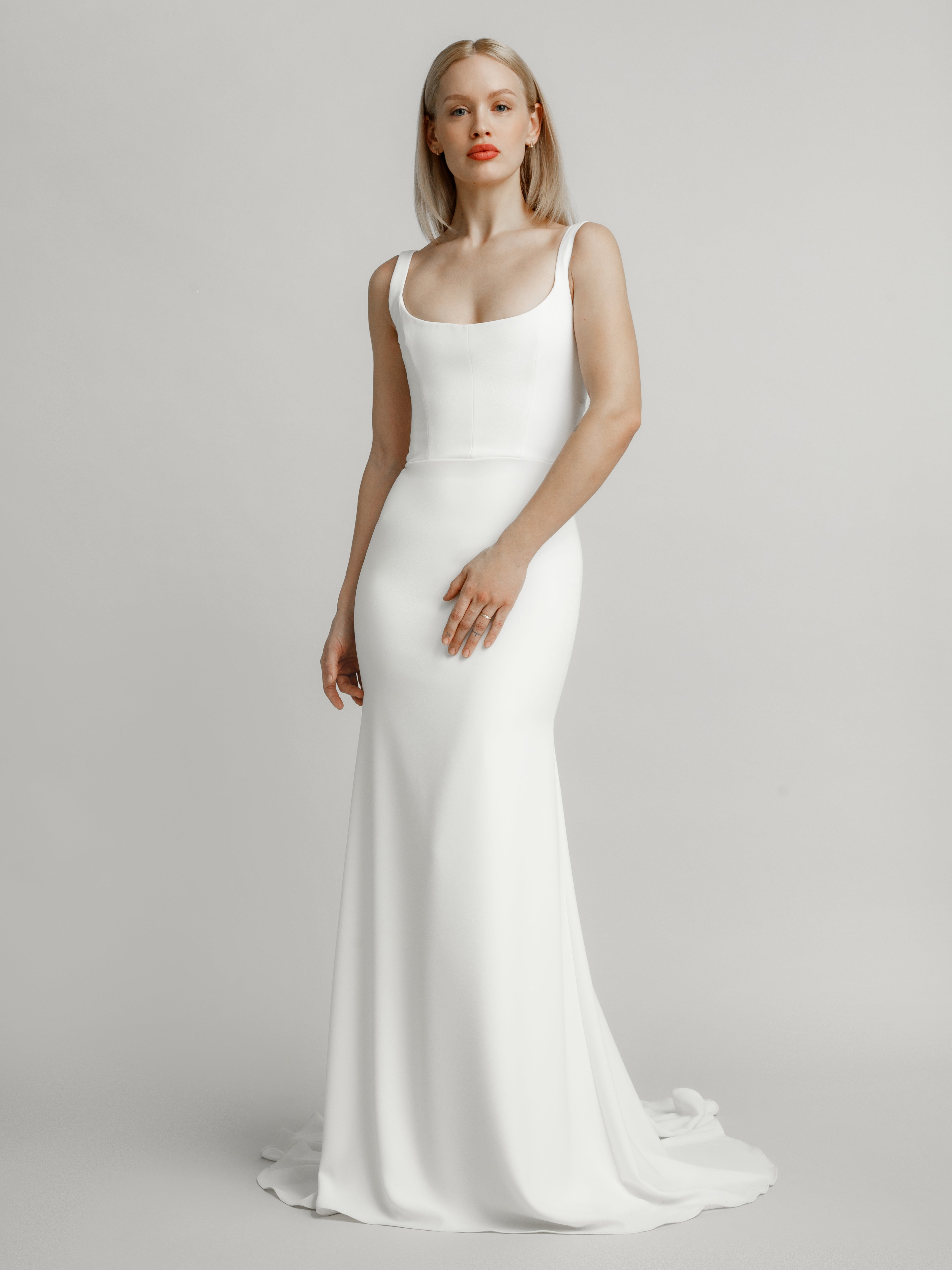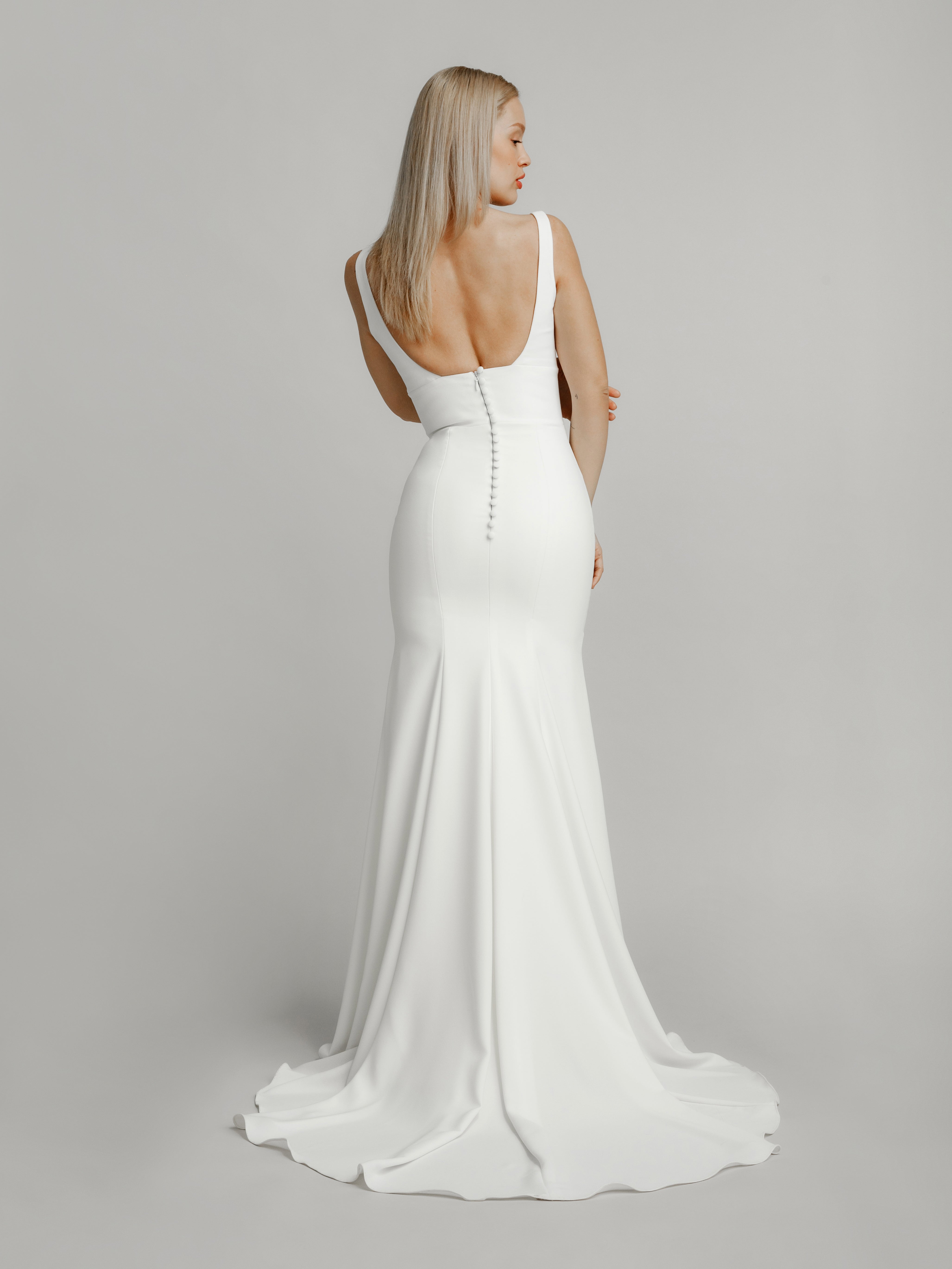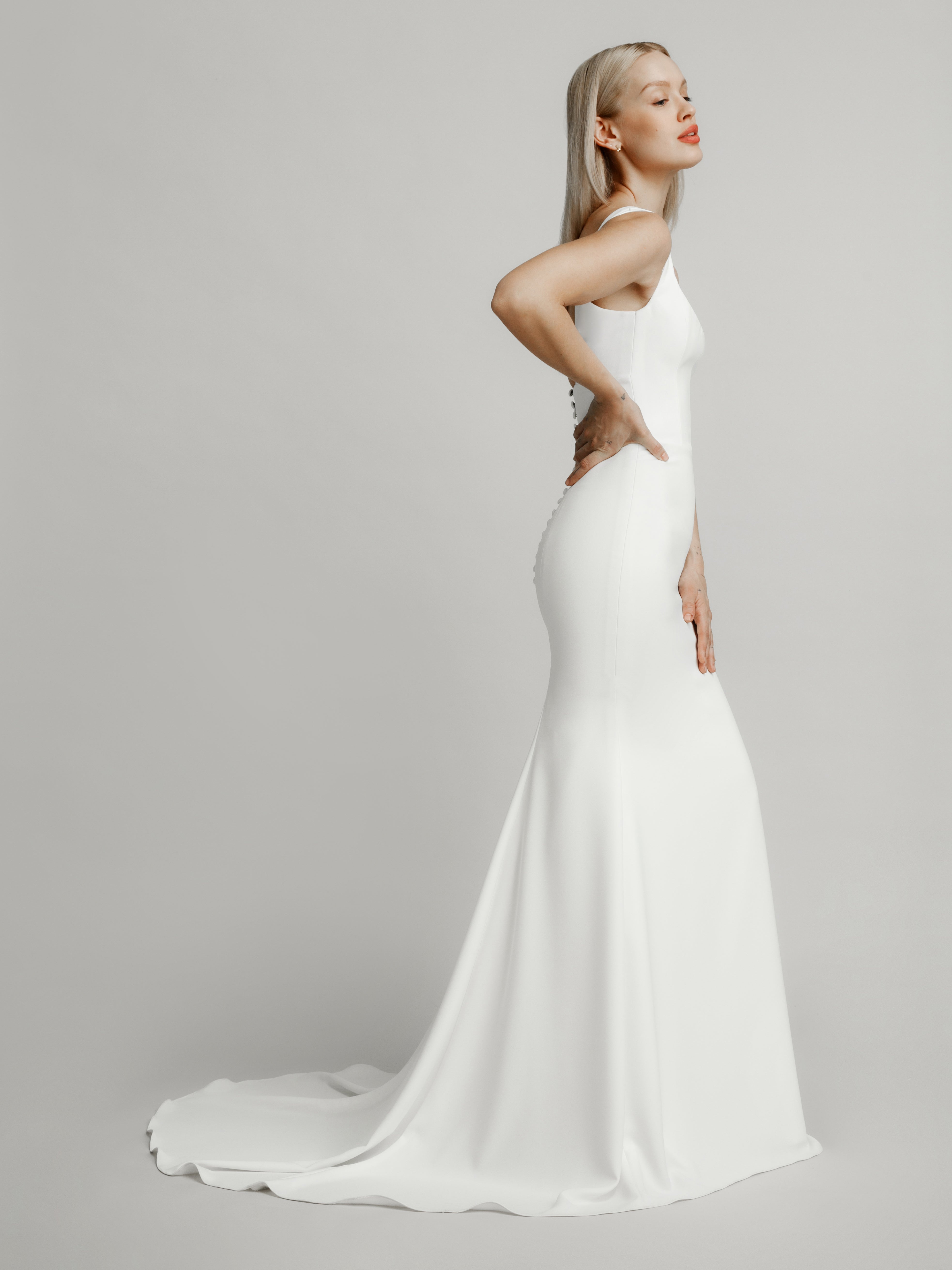 Camille is a timeless gown for an elegant bride. Its simple, flattering silhouette – in crepe, liquid satin, or textured satin and lined with off-white midori – begins with a shallow squared scoop neck bodice and sewn straps. The bodice gives way to illusion buttons along the hidden zipper at the back and a modern mermaid skirt with a 65" train. It’s no more and no less than you need to feel perfect on your wedding day.