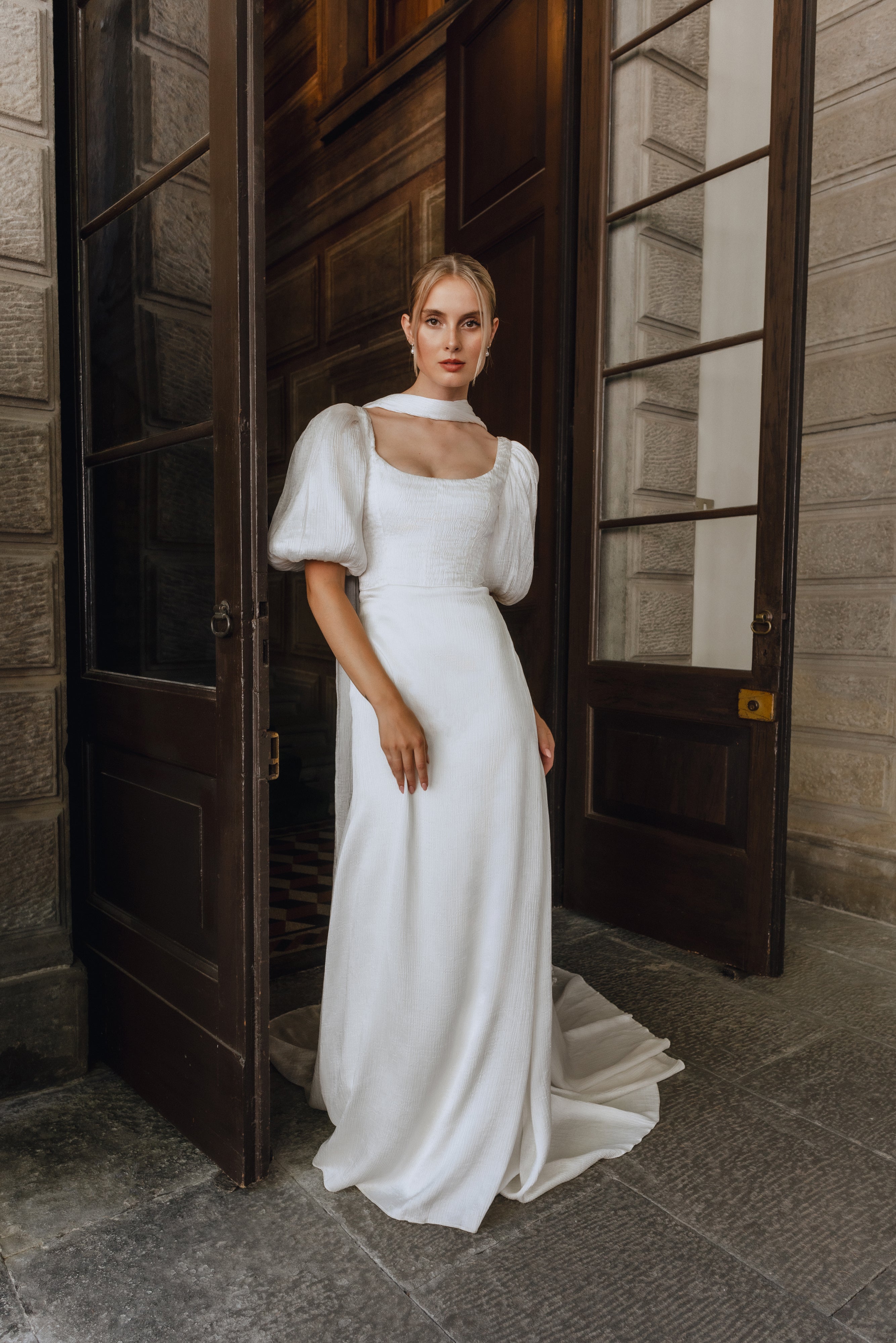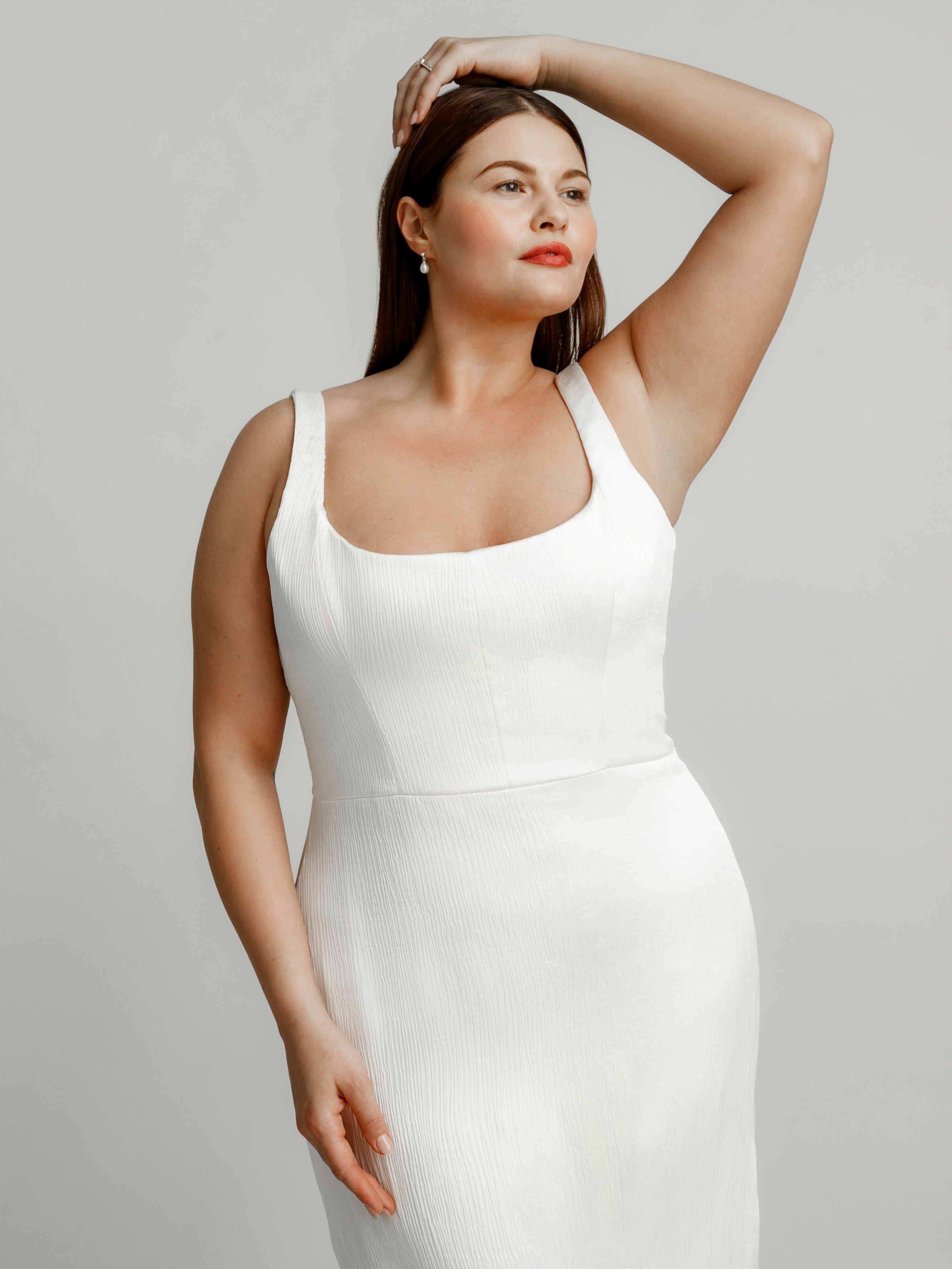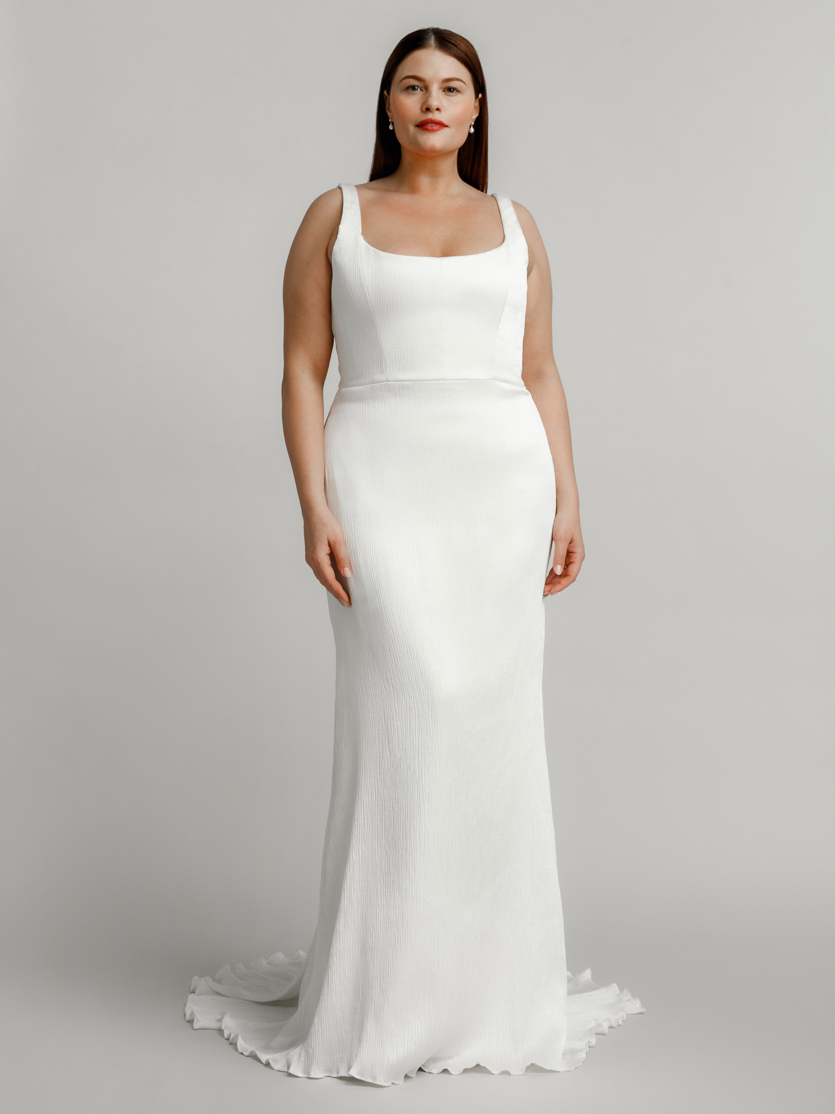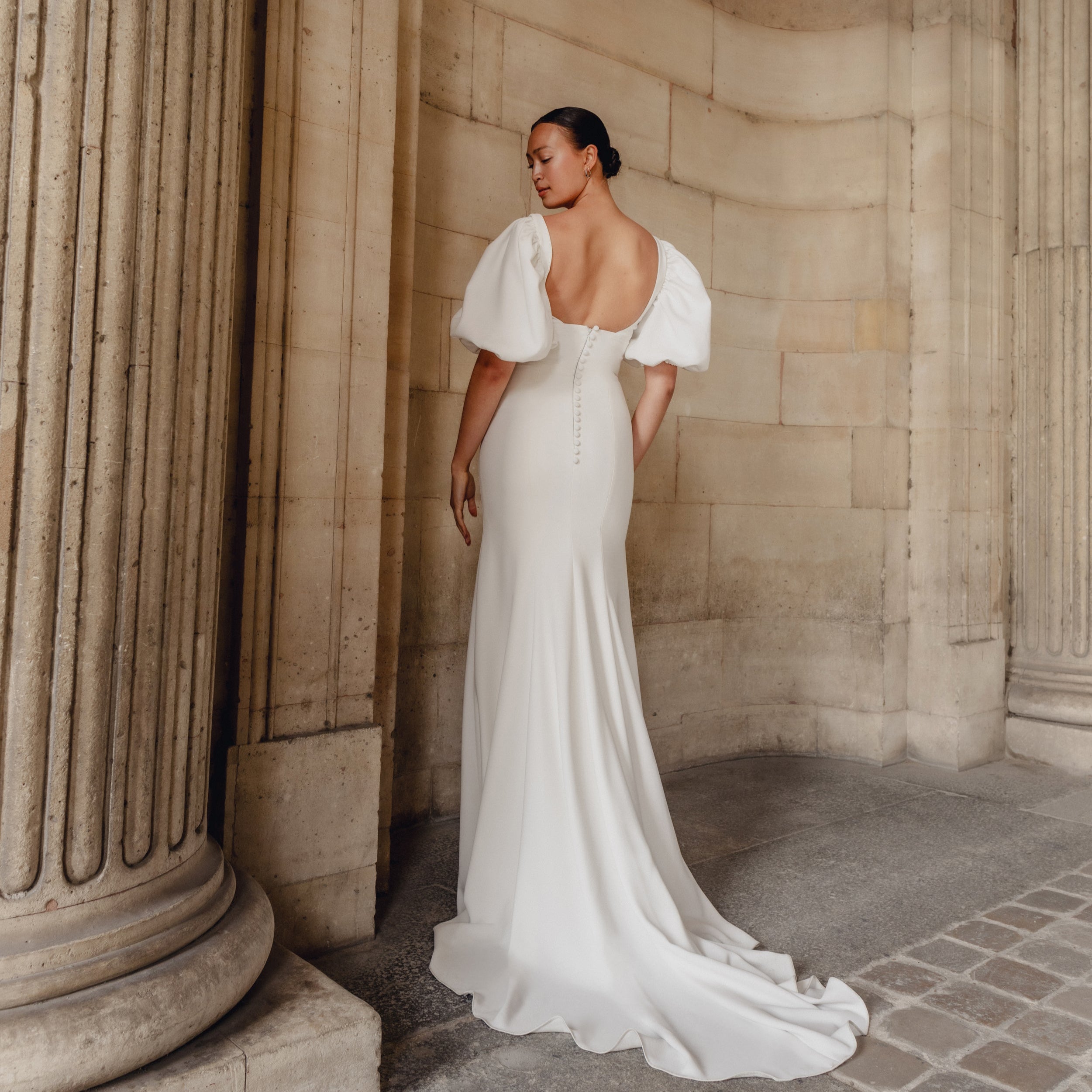 Camille is a timeless gown for an elegant bride. Its simple, flattering silhouette – in crepe, liquid satin, or textured satin and lined with off-white midori – begins with a shallow squared scoop neck bodice and sewn straps. The bodice gives way to illusion buttons along the hidden zipper at the back and a modern mermaid skirt with a 65" train. It’s no more and no less than you need to feel perfect on your wedding day.