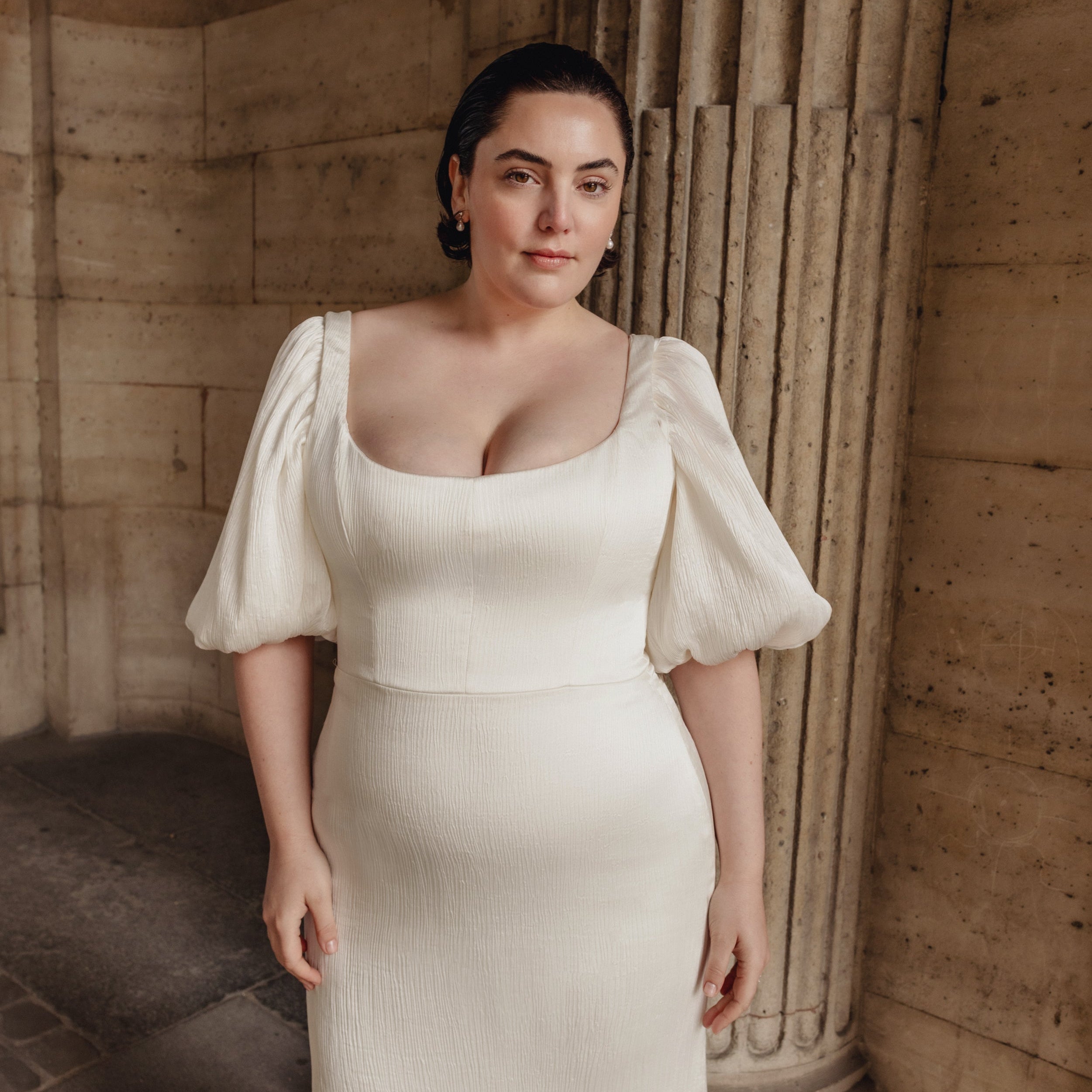 Our straight size model wears crepe, and our curve model wears textured satin. Camille's armhole is designed to work with all of our detachable sleeve options.