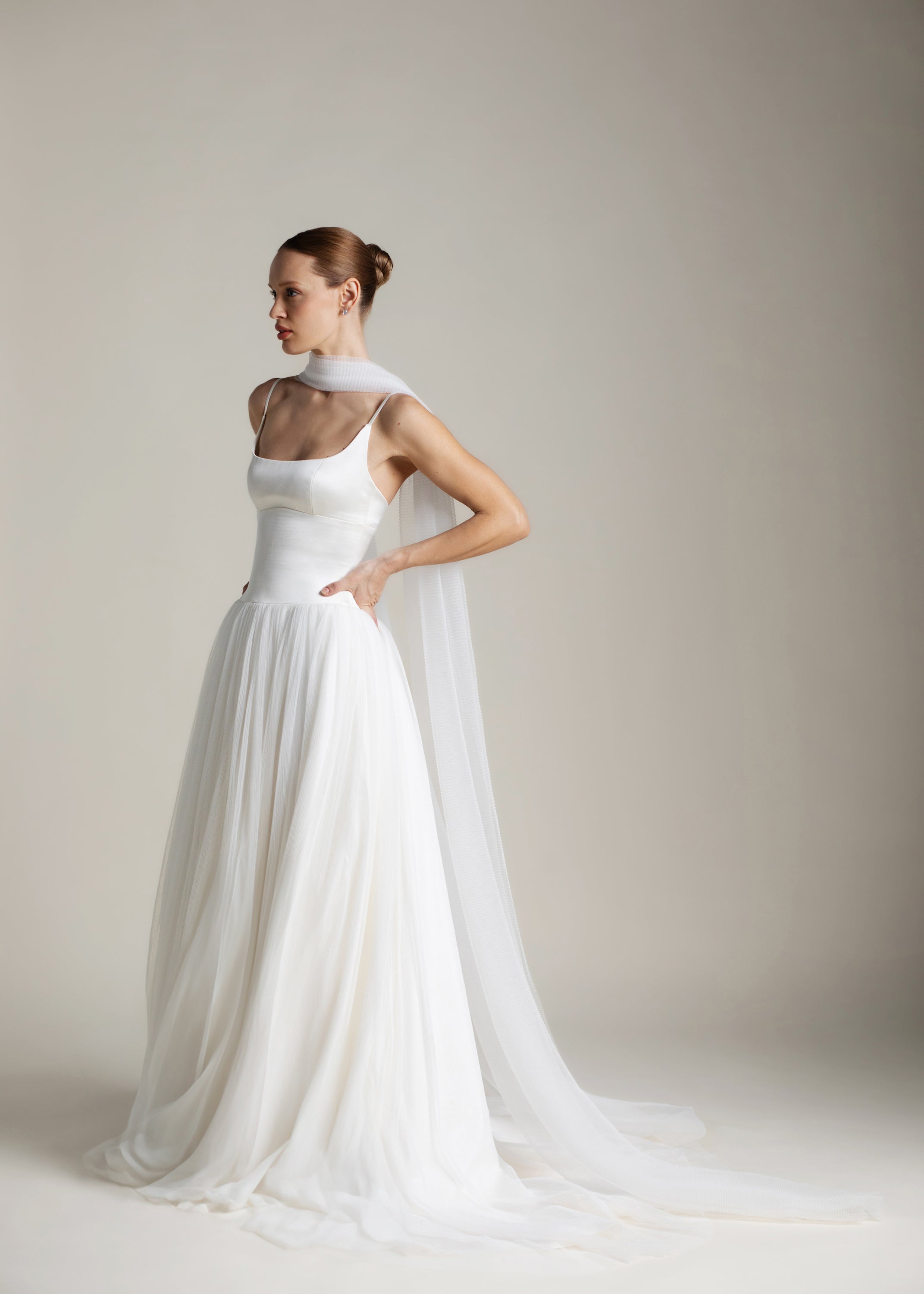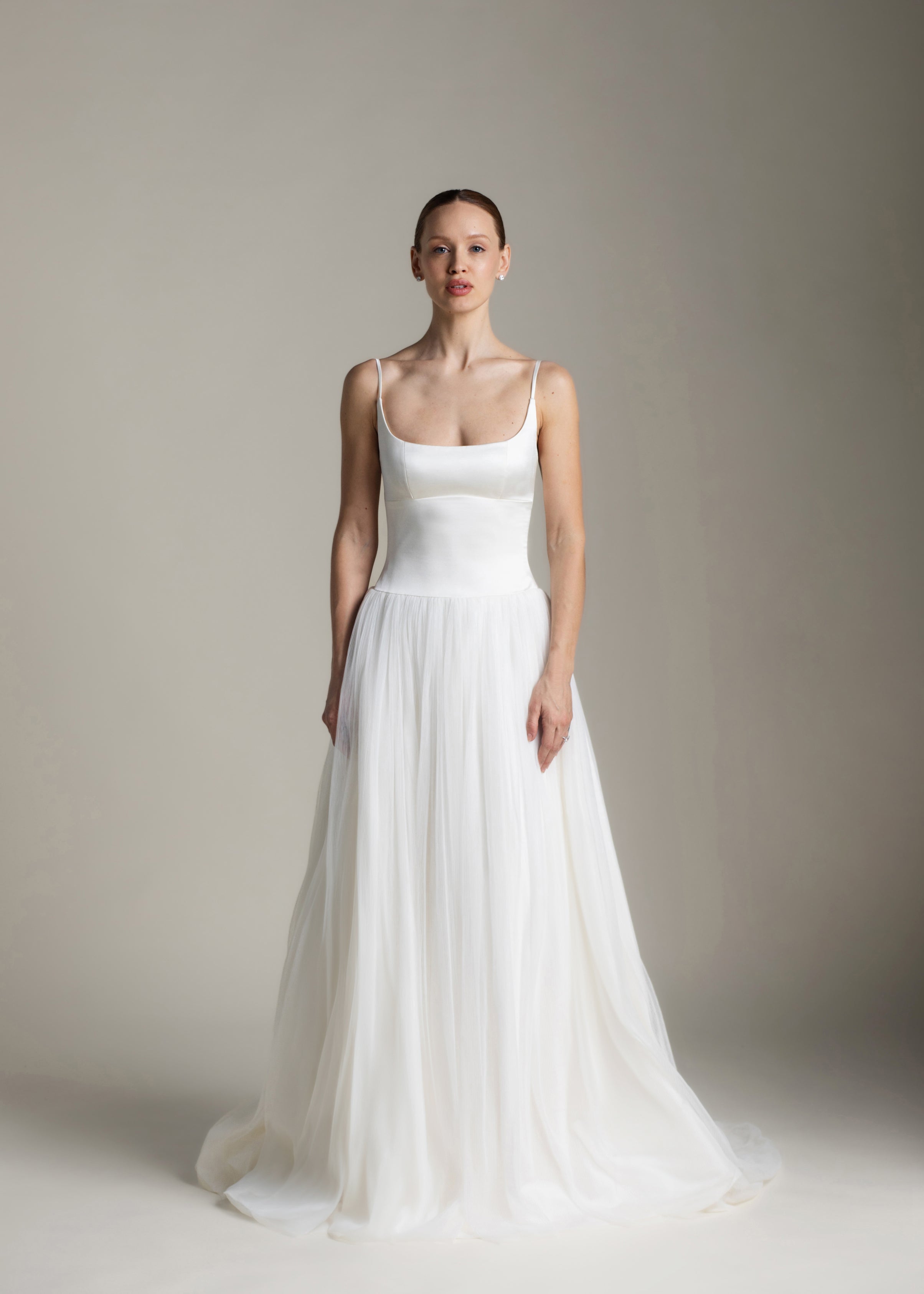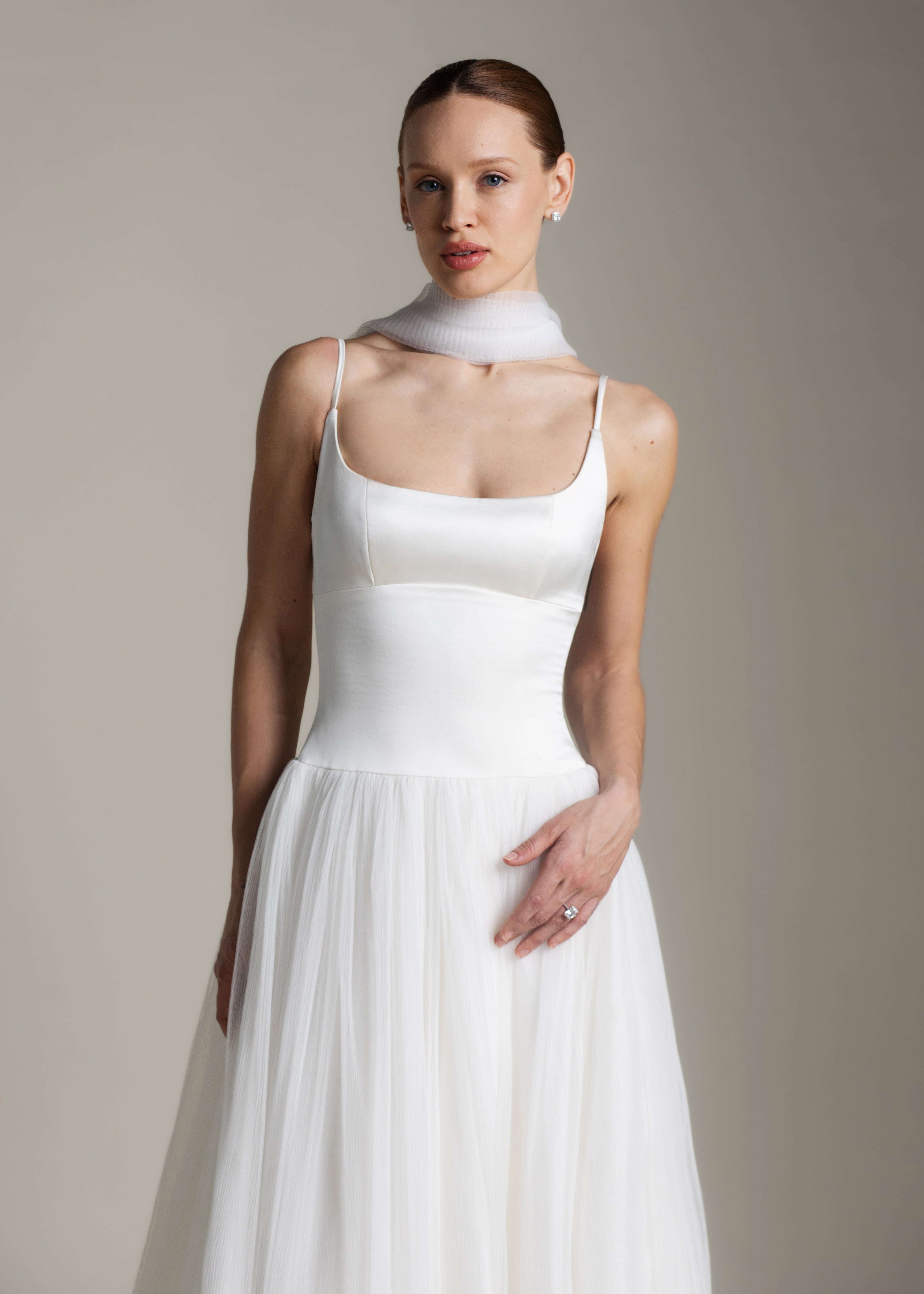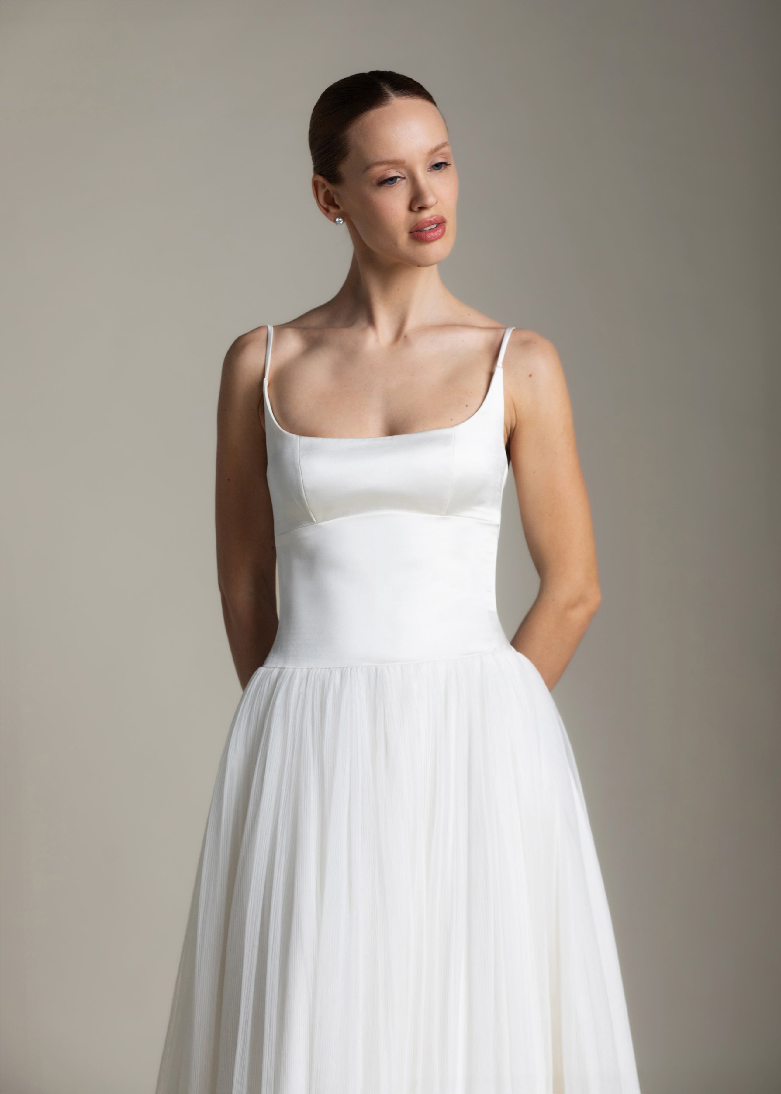 A gown with a sense of history, Clio draws from a rich heritage of bridal fashion to inform her modern shape. The square neckline, complete with a subtle scoop at the corners, frames the collarbone, while slender ¼” straps and a dropped waist create a clean, elongated silhouette. The bodice, cut in liquid satin, meets a gathered circle skirt of airy crimped tulle, layered over Flat Taffeta for soft structure and movement. With her 80” train and comfortable off-white midori lining, Clio is timeless.