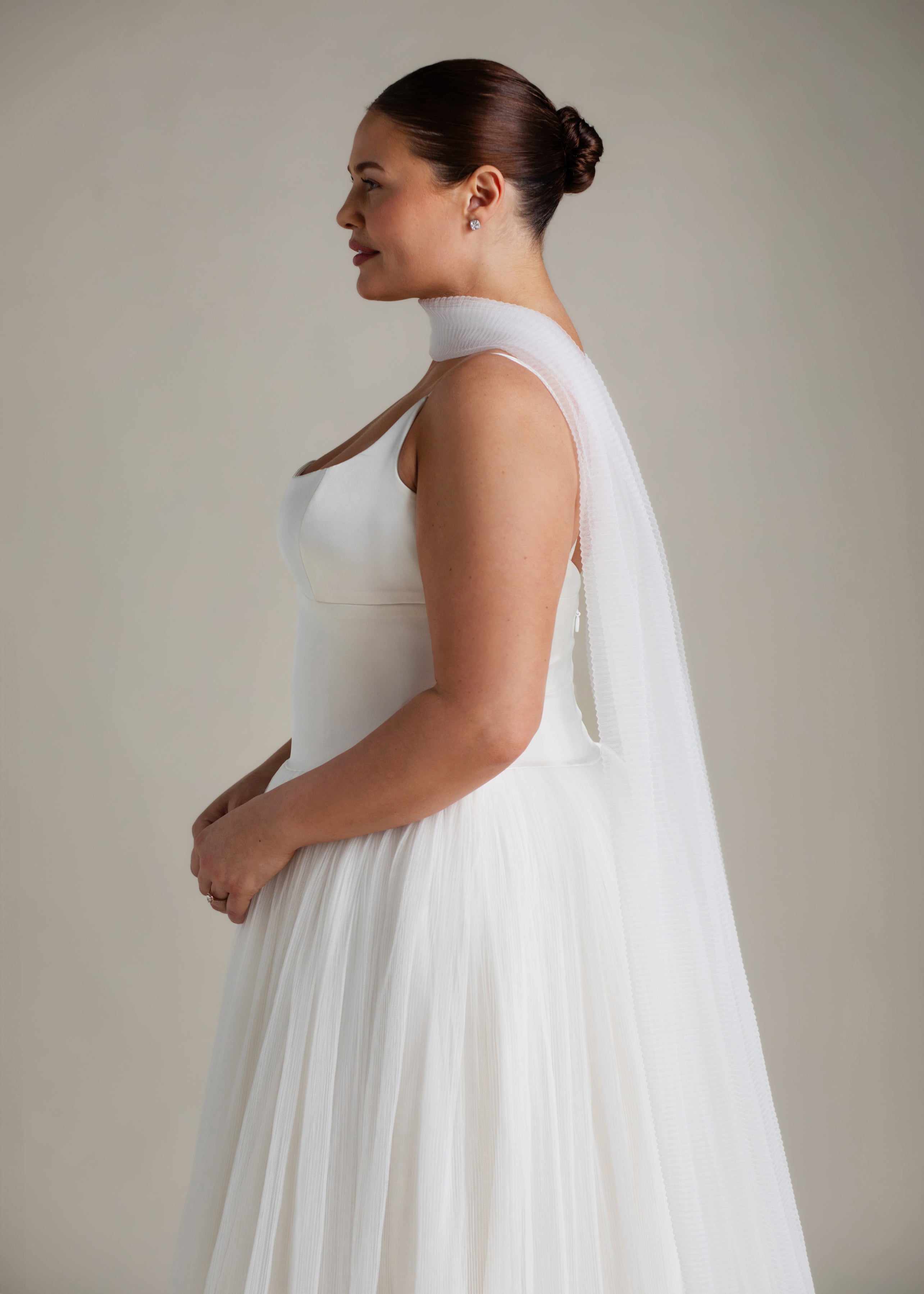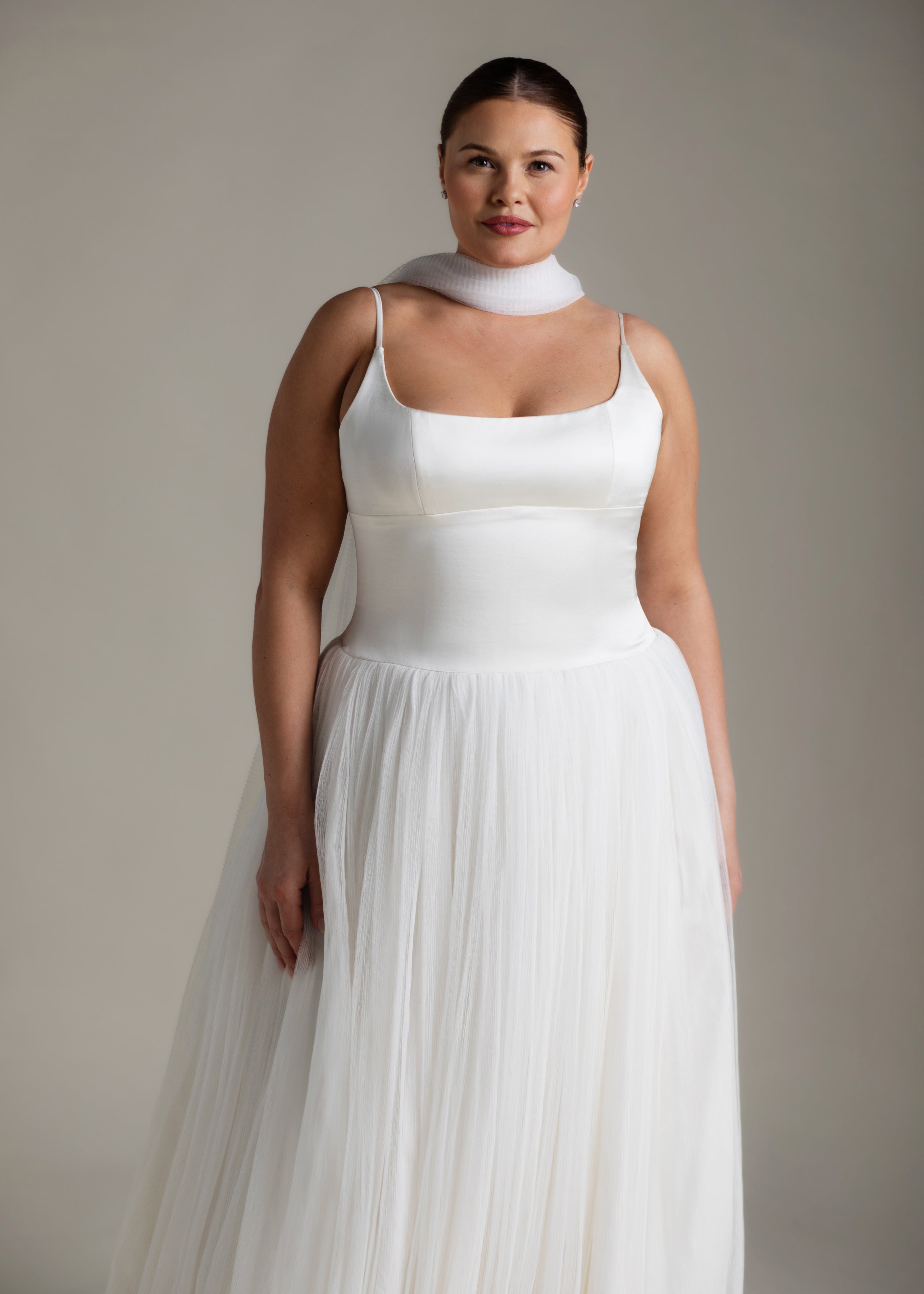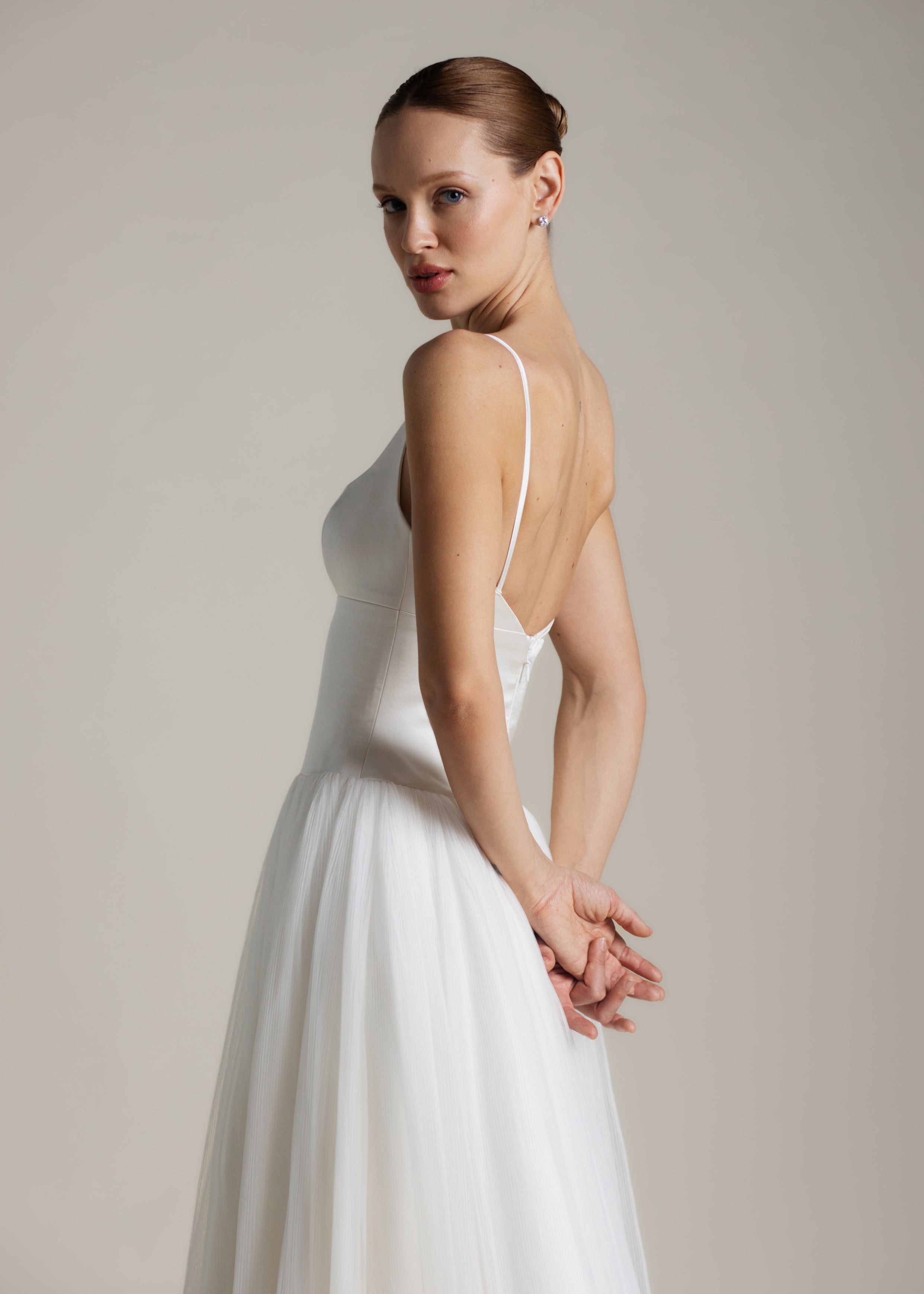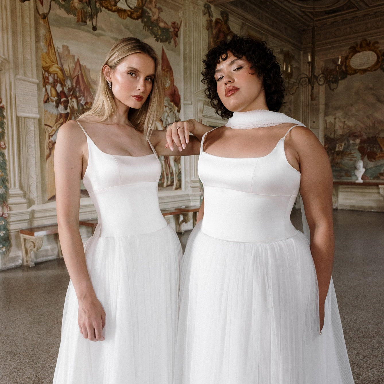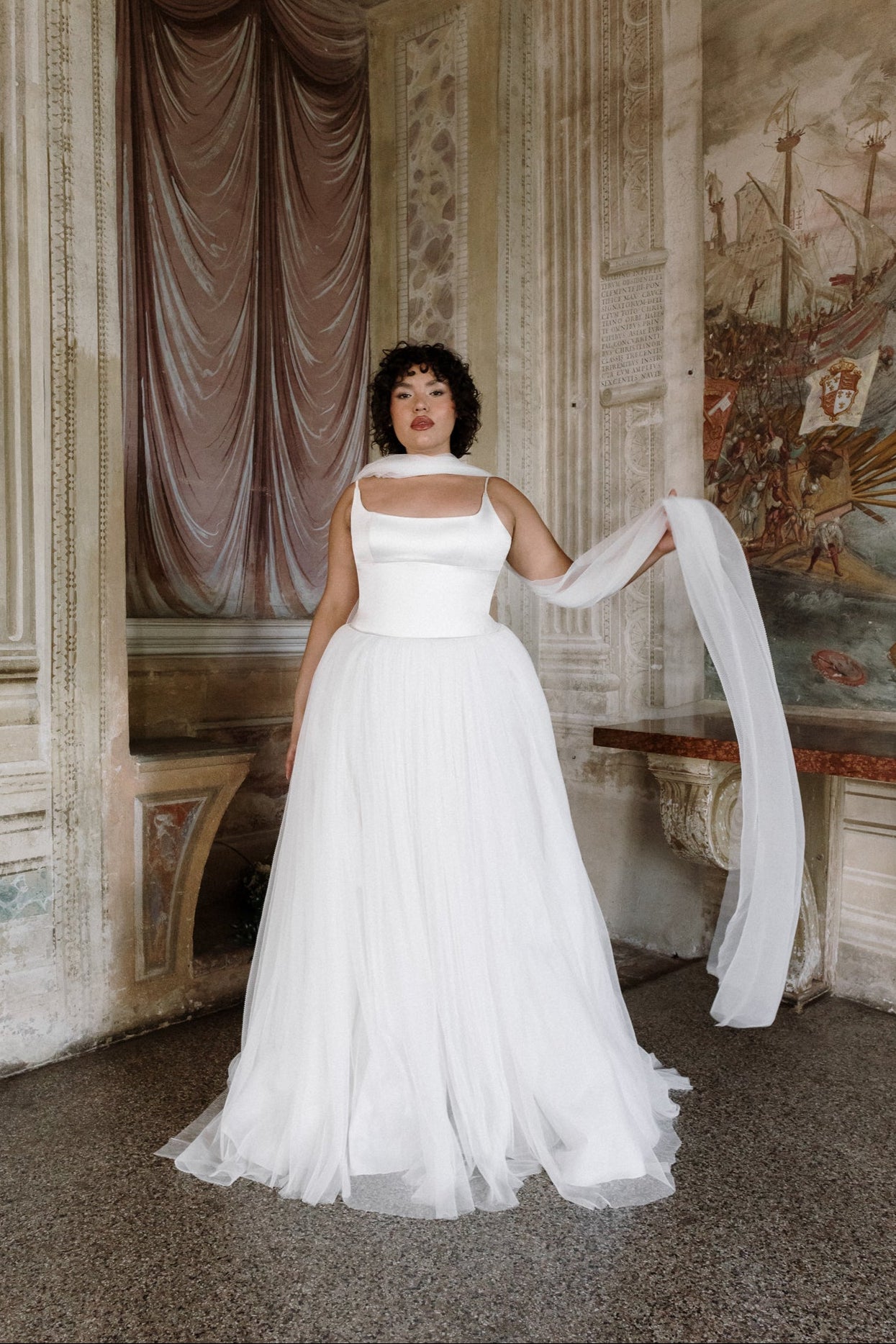 A gown with a sense of history, Clio draws from a rich heritage of bridal fashion to inform her modern shape. The square neckline, complete with a subtle scoop at the corners, frames the collarbone, while slender ¼” straps and a dropped waist create a clean, elongated silhouette. The bodice, cut in liquid satin, meets a gathered circle skirt of airy crimped tulle, layered over Flat Taffeta for soft structure and movement. With her 80” train and comfortable off-white midori lining, Clio is timeless.