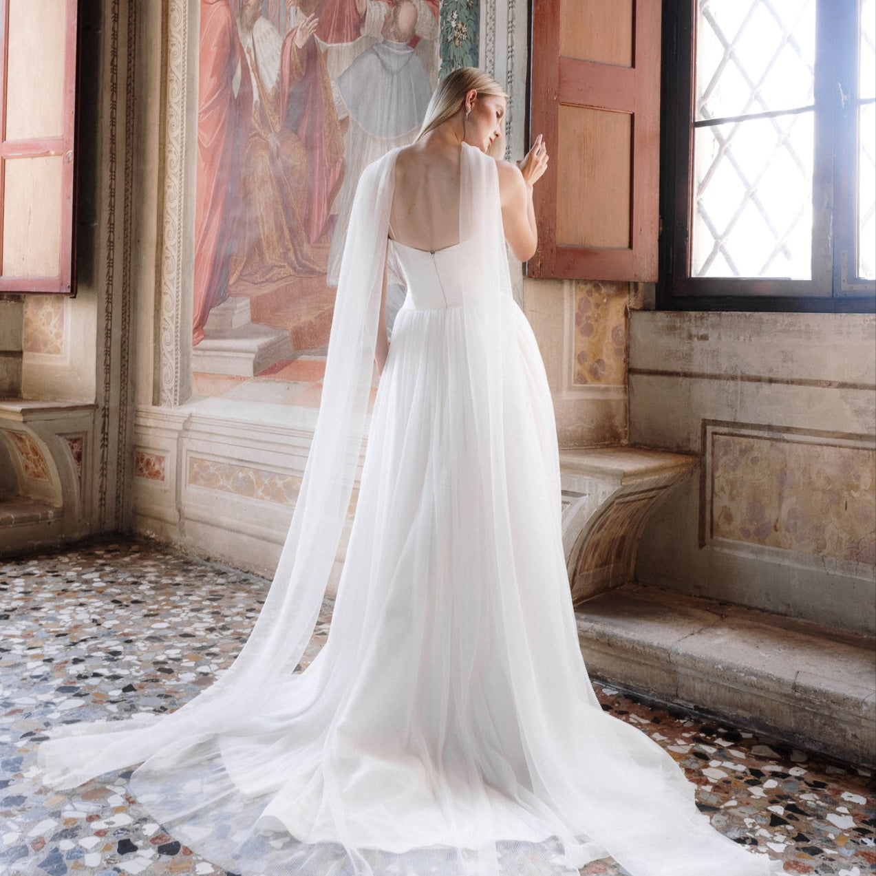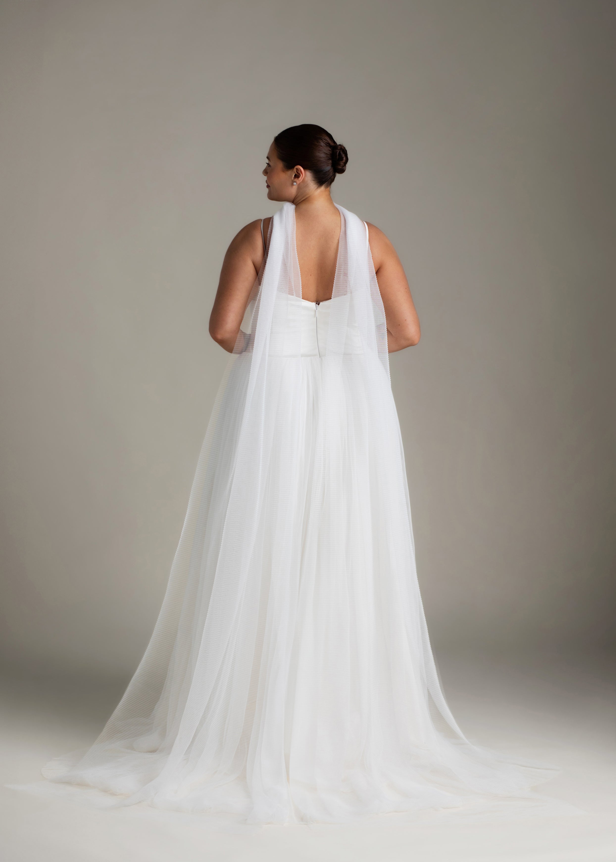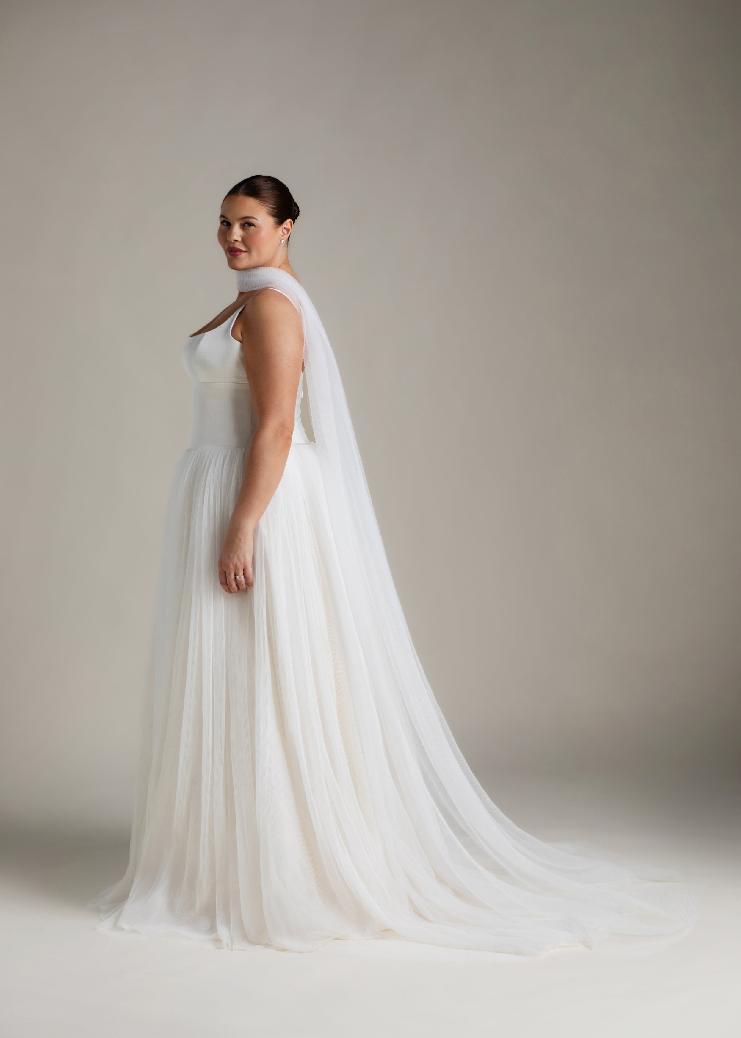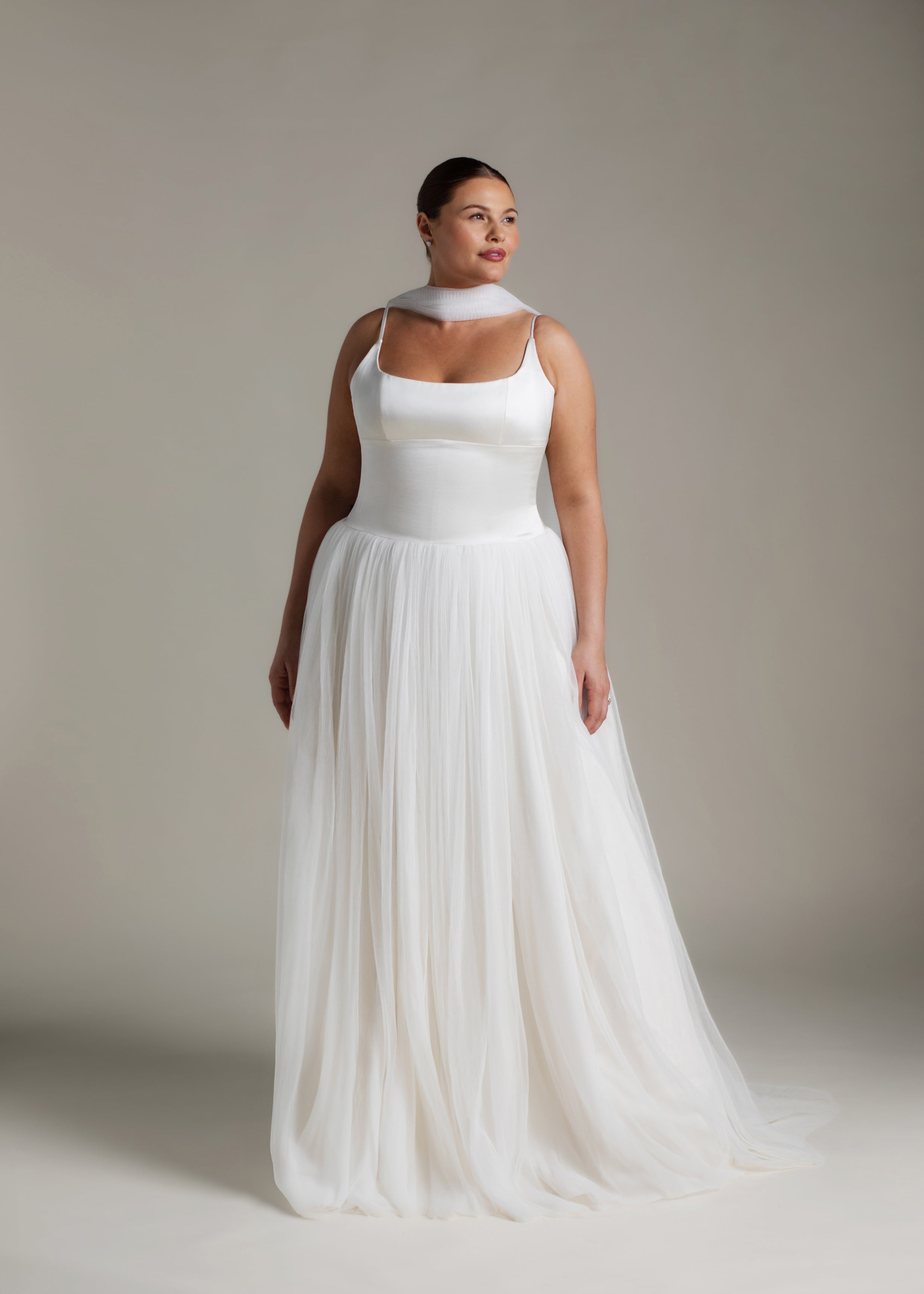 A gown with a sense of history, Clio draws from a rich heritage of bridal fashion to inform her modern shape. The square neckline, complete with a subtle scoop at the corners, frames the collarbone, while slender ¼” straps and a dropped waist create a clean, elongated silhouette. The bodice, cut in liquid satin, meets a gathered circle skirt of airy crimped tulle, layered over Flat Taffeta for soft structure and movement. With her 80” train and comfortable off-white midori lining, Clio is timeless.