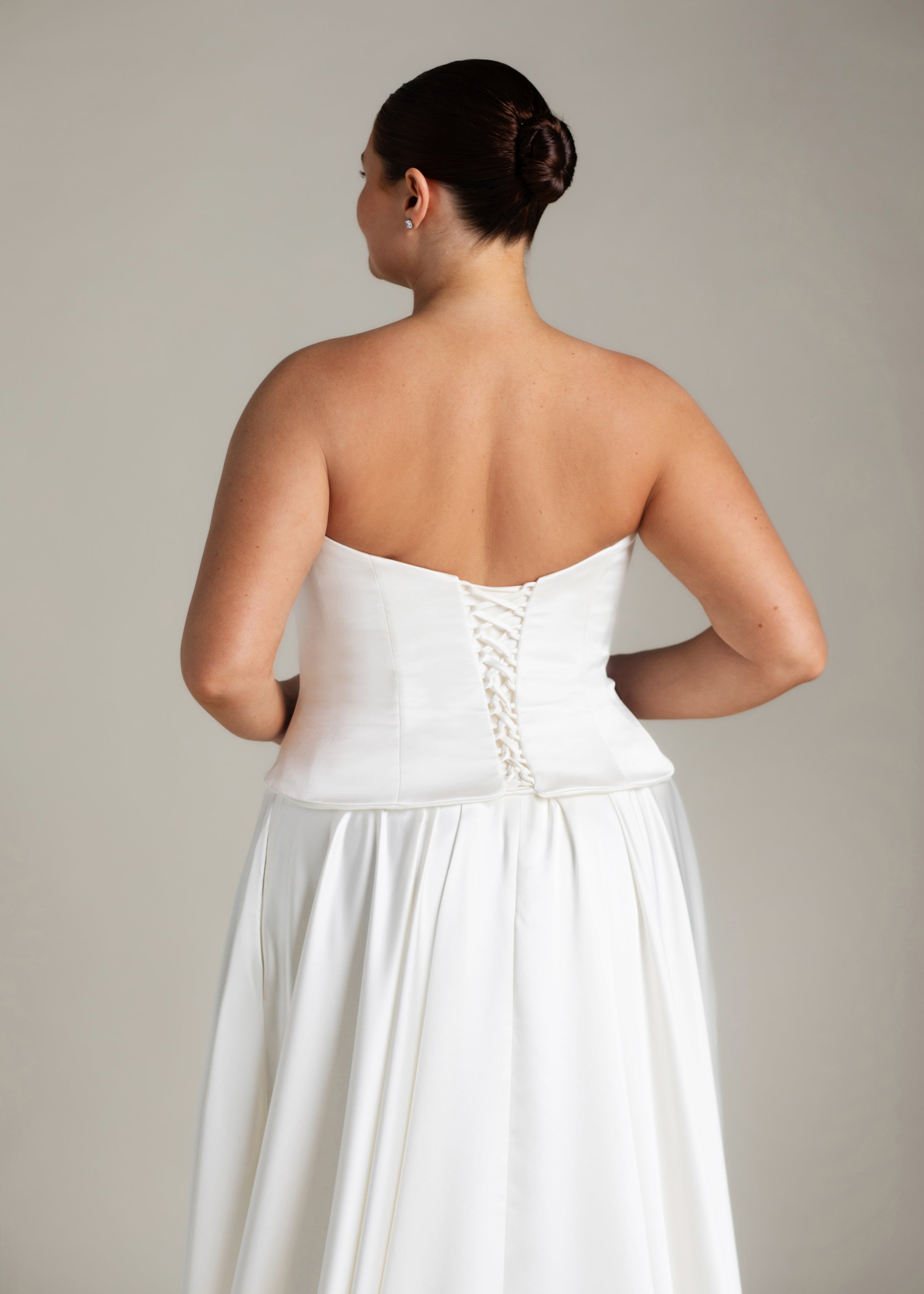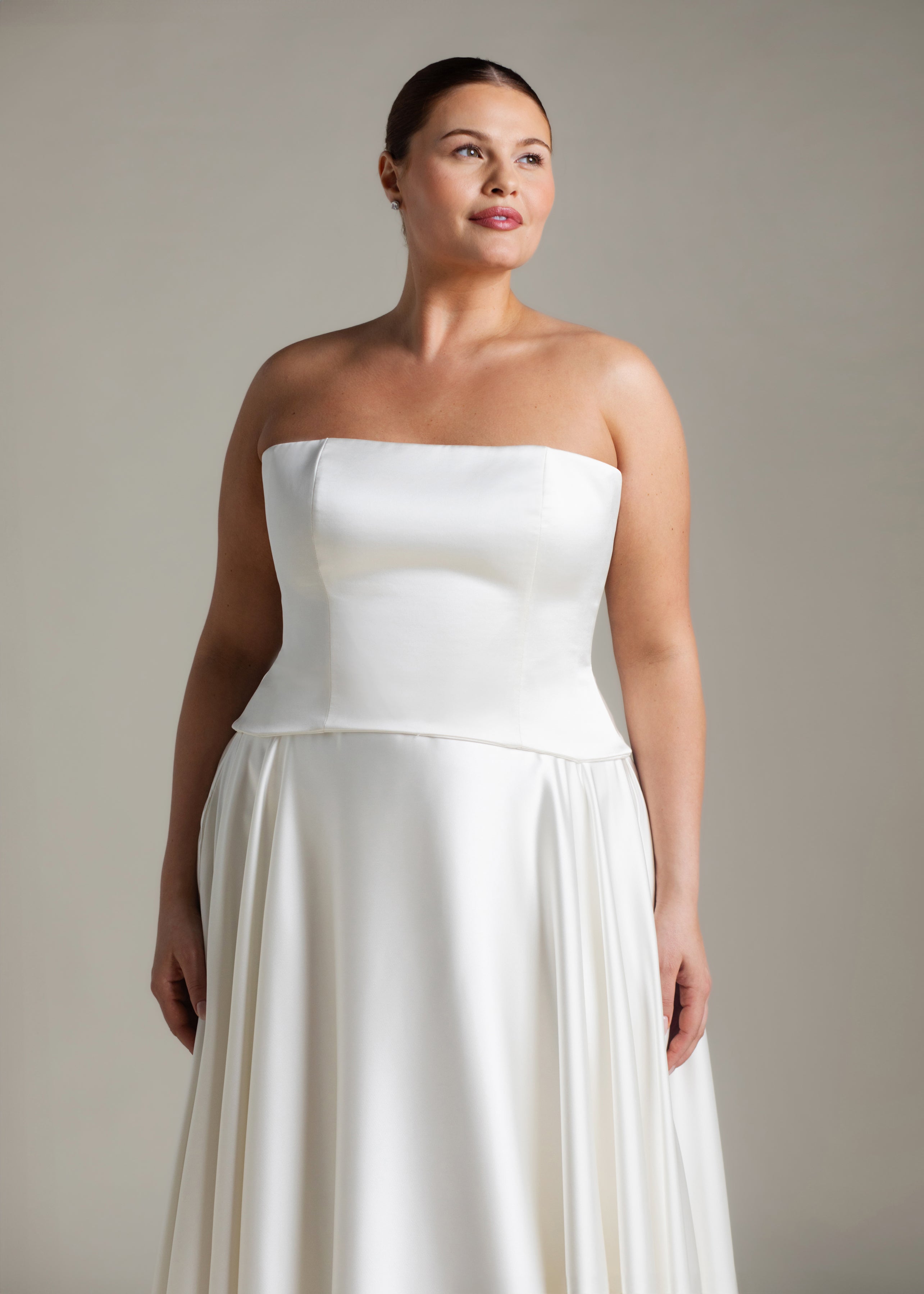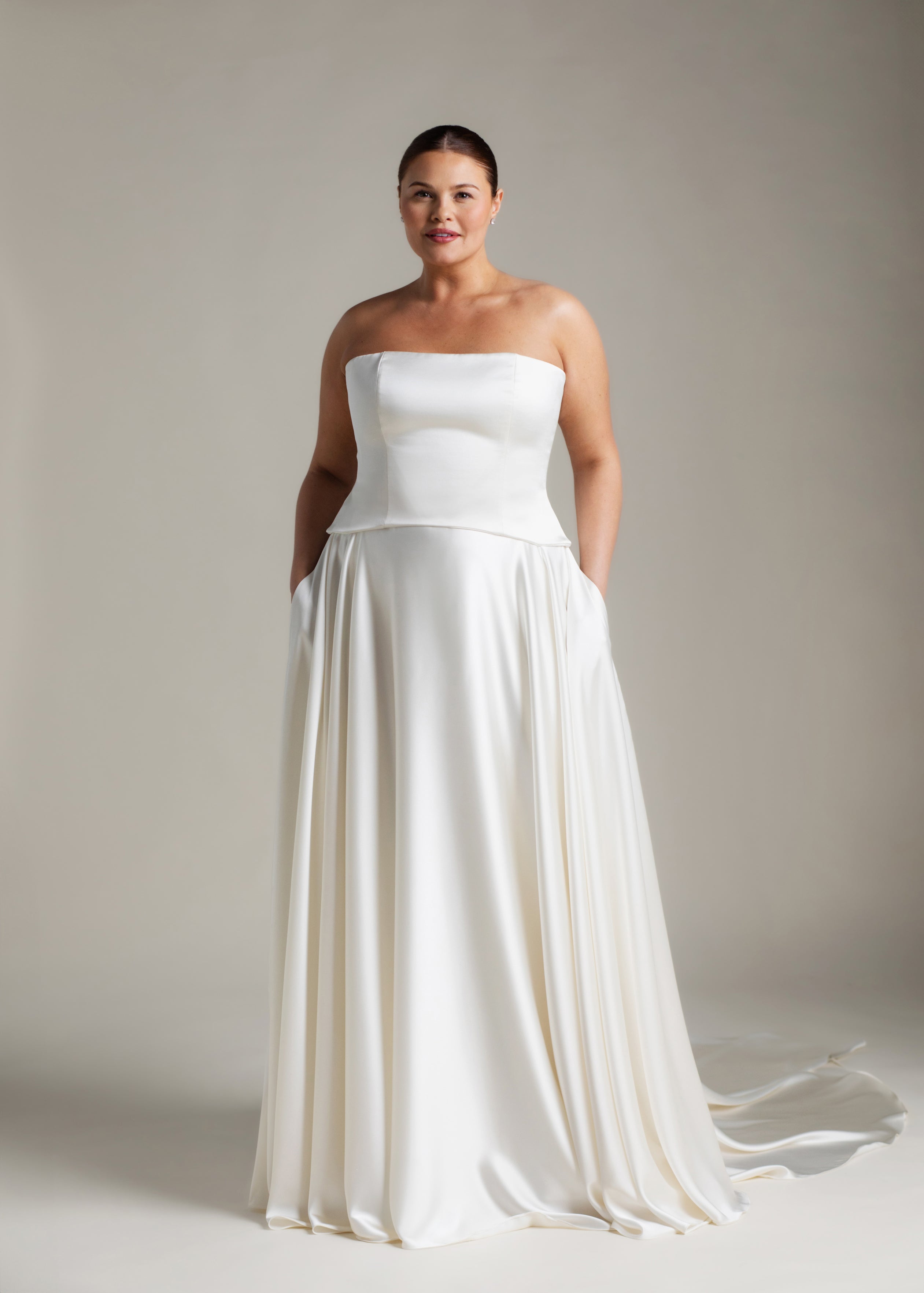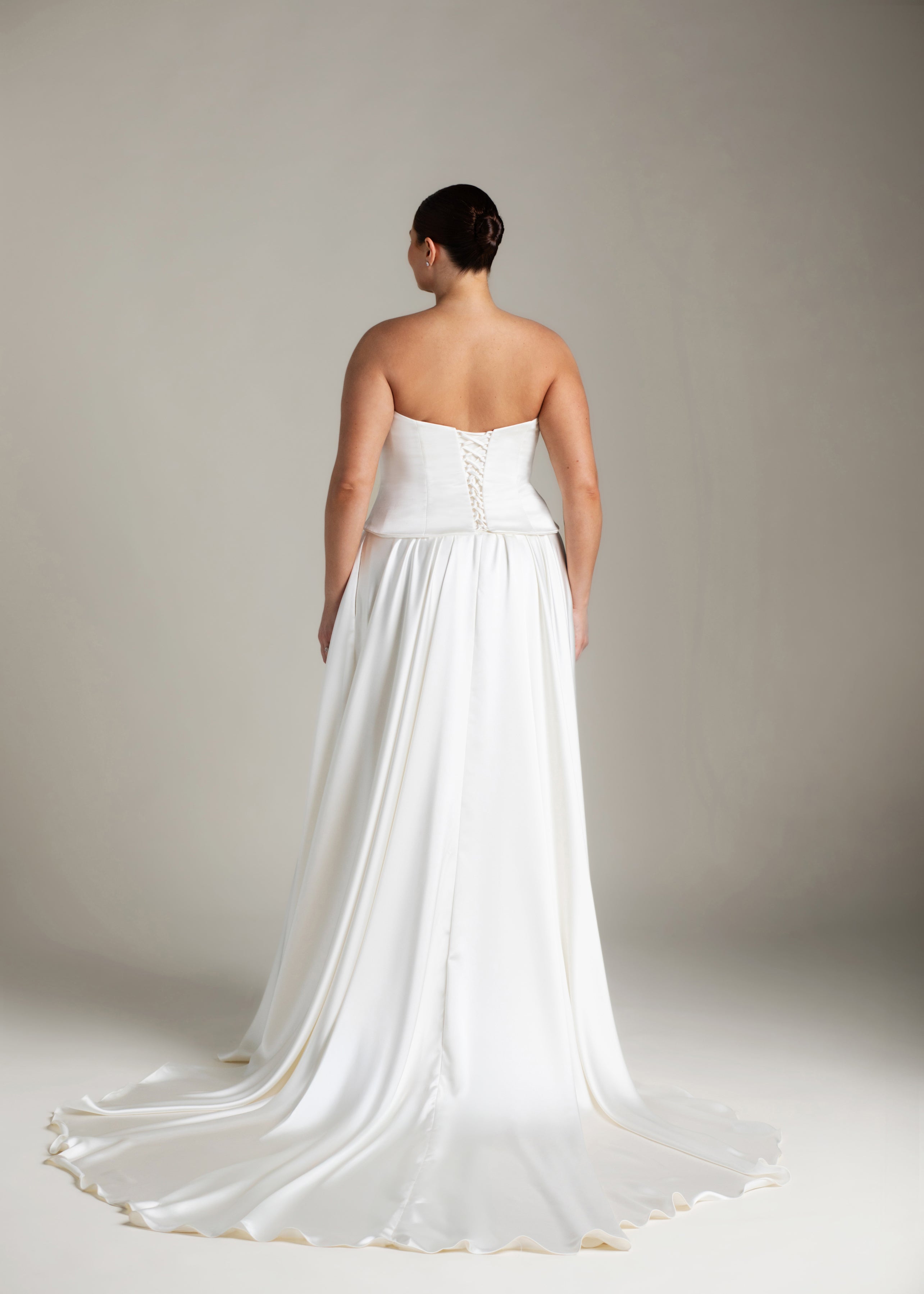 Gaia is an ode to sculptural simplicity. The strapless bodice cuts a crisp silhouette with a straight neckline; the curved, dropped waistline gently smooths the curves and falls into a sweeping full-circle skirt punctuated by discreet pockets and a luxurious 80” train. Her lace-up back adds a touch of classic romance, and contrasts with our iconic liquid satin. An optional, detachable modesty panel can be added under the lacing. Beneath it all, Gaia is lined in comfortable off-white midori for a gown that feels as fluid as she looks.