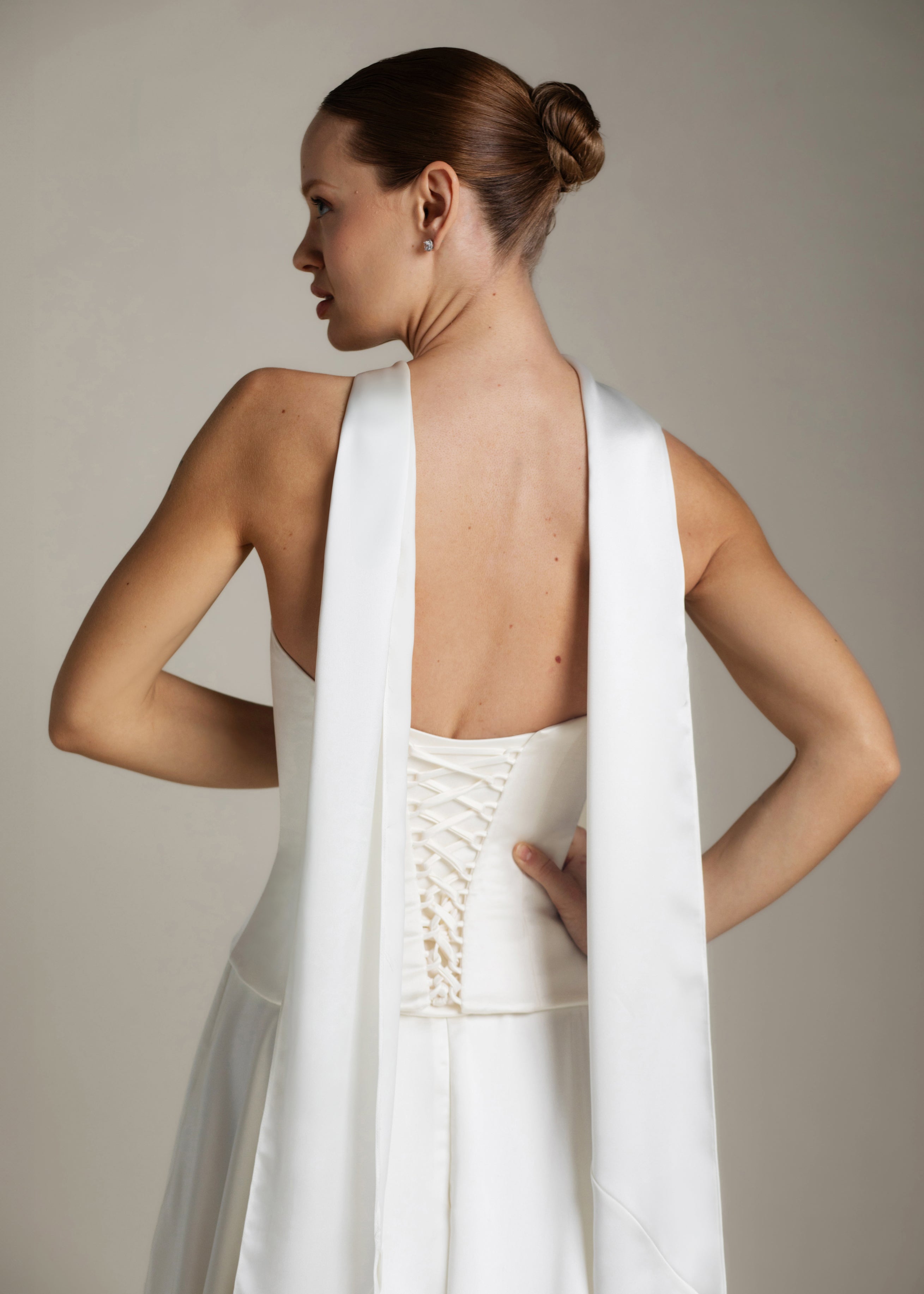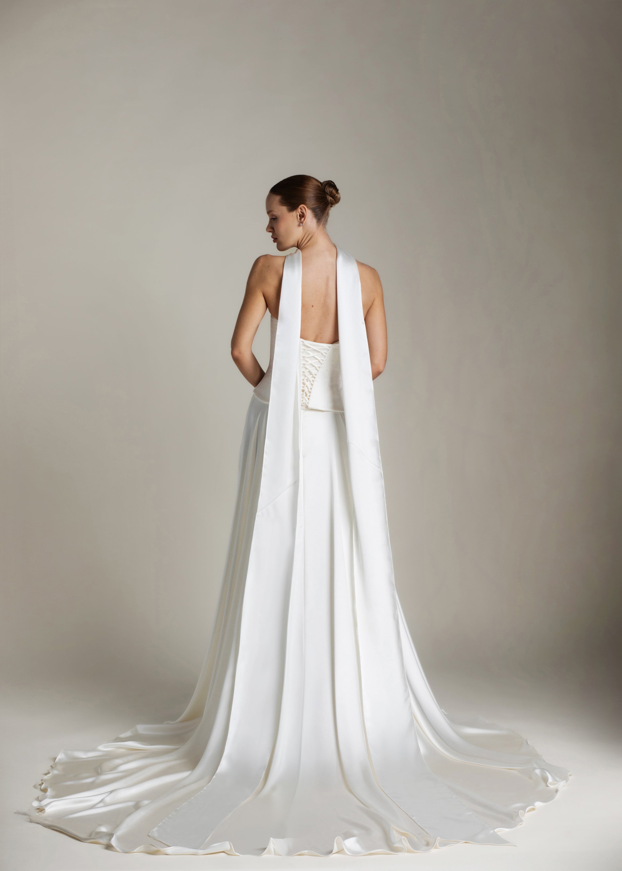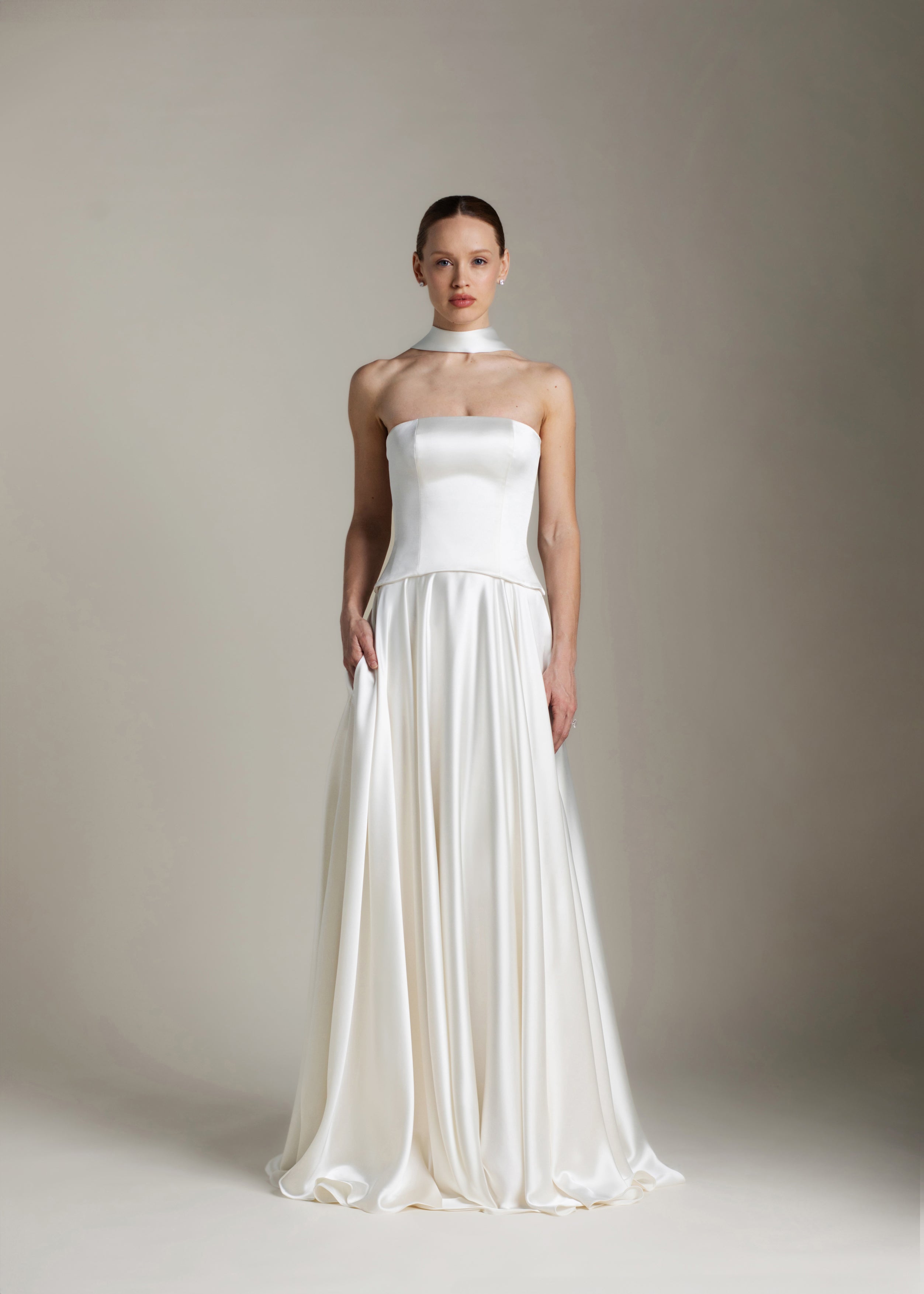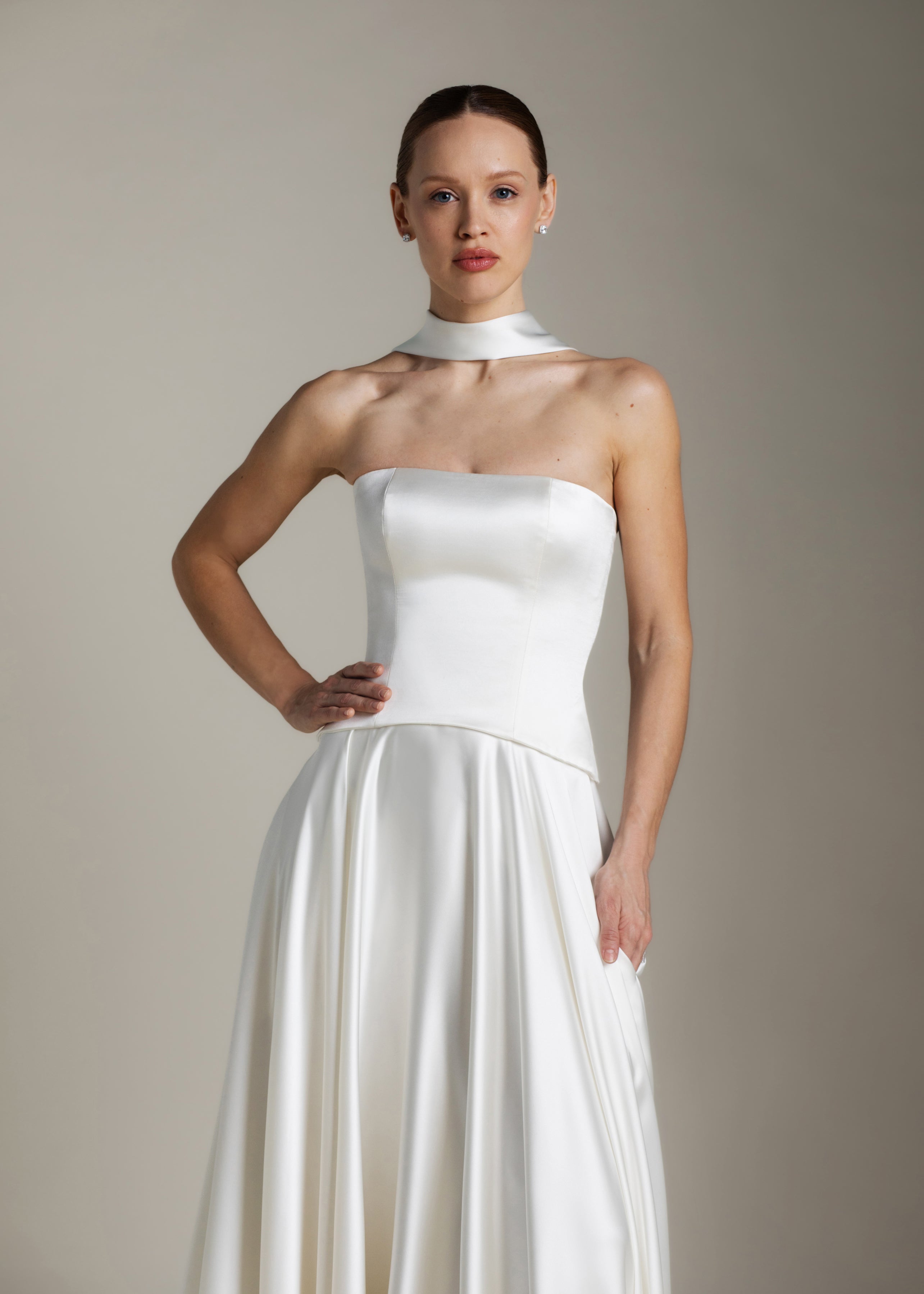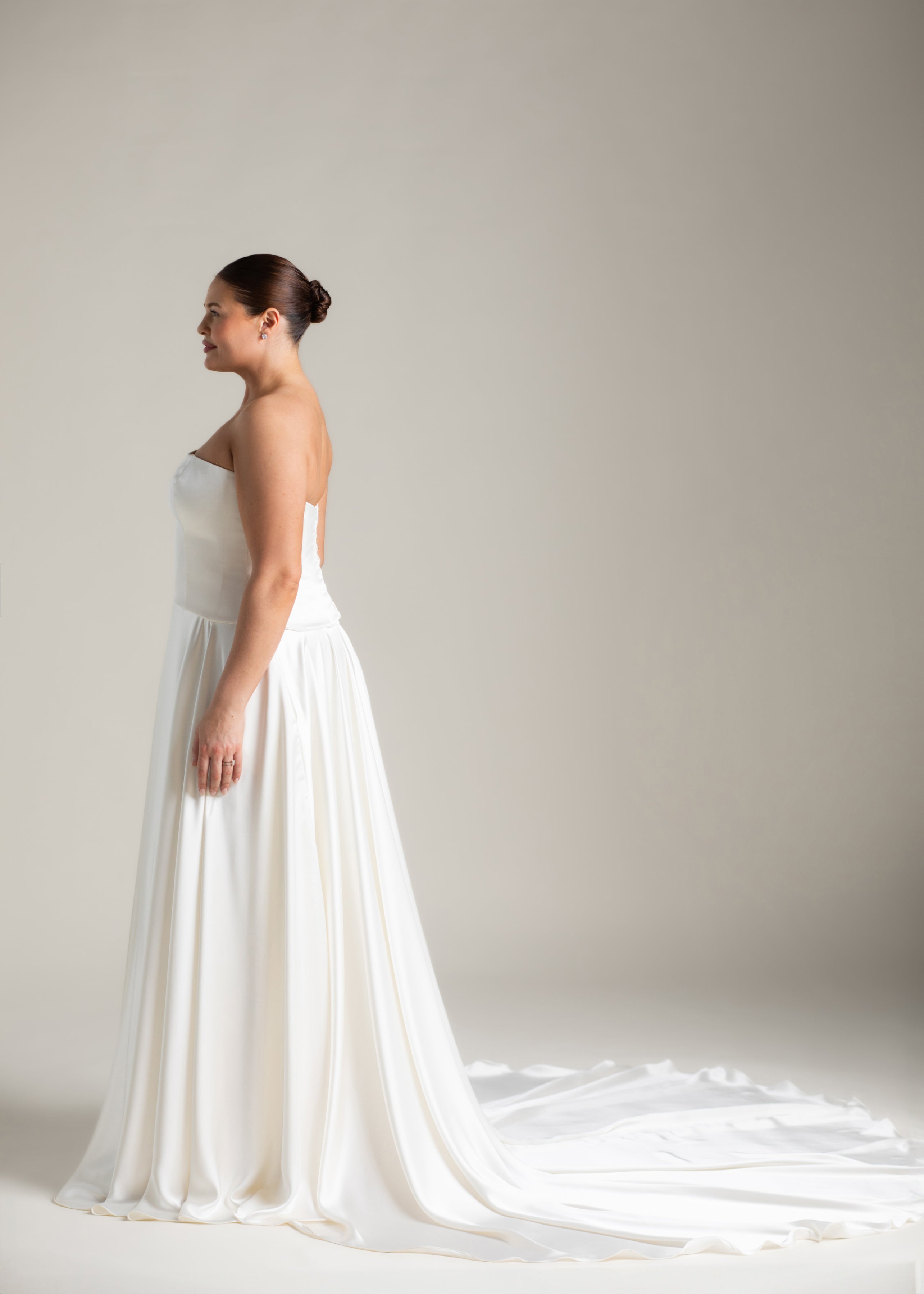 Gaia is an ode to sculptural simplicity. The strapless bodice cuts a crisp silhouette with a straight neckline; the curved, dropped waistline gently smooths the curves and falls into a sweeping full-circle skirt punctuated by discreet pockets and a luxurious 80” train. Her lace-up back adds a touch of classic romance, and contrasts with our iconic liquid satin. An optional, detachable modesty panel can be added under the lacing. Beneath it all, Gaia is lined in comfortable off-white midori for a gown that feels as fluid as she looks.