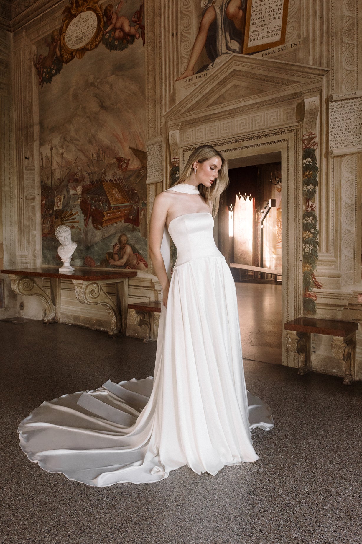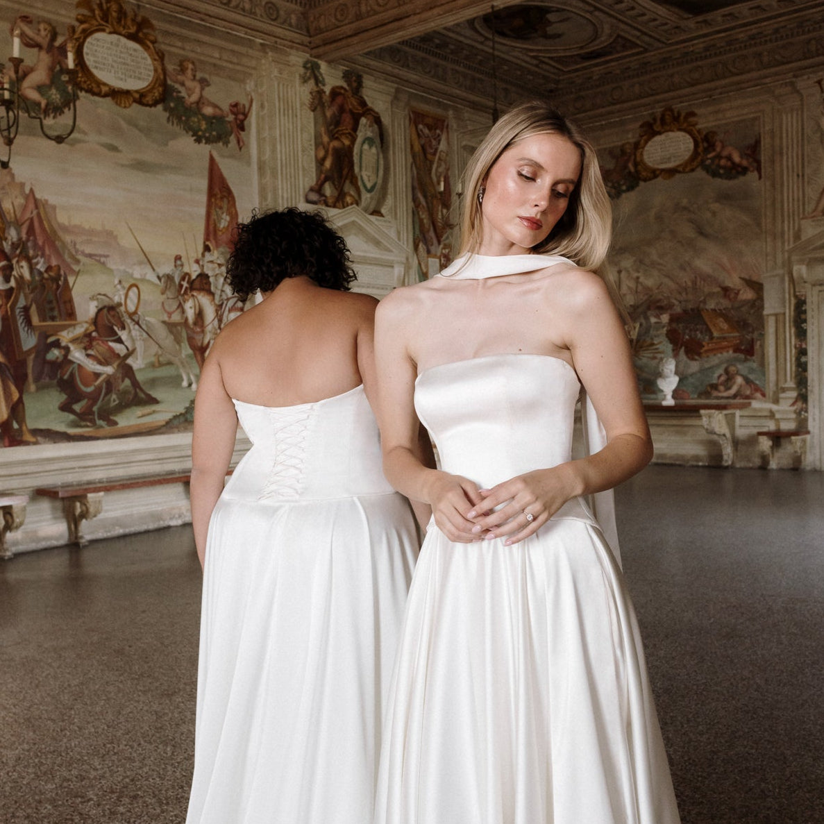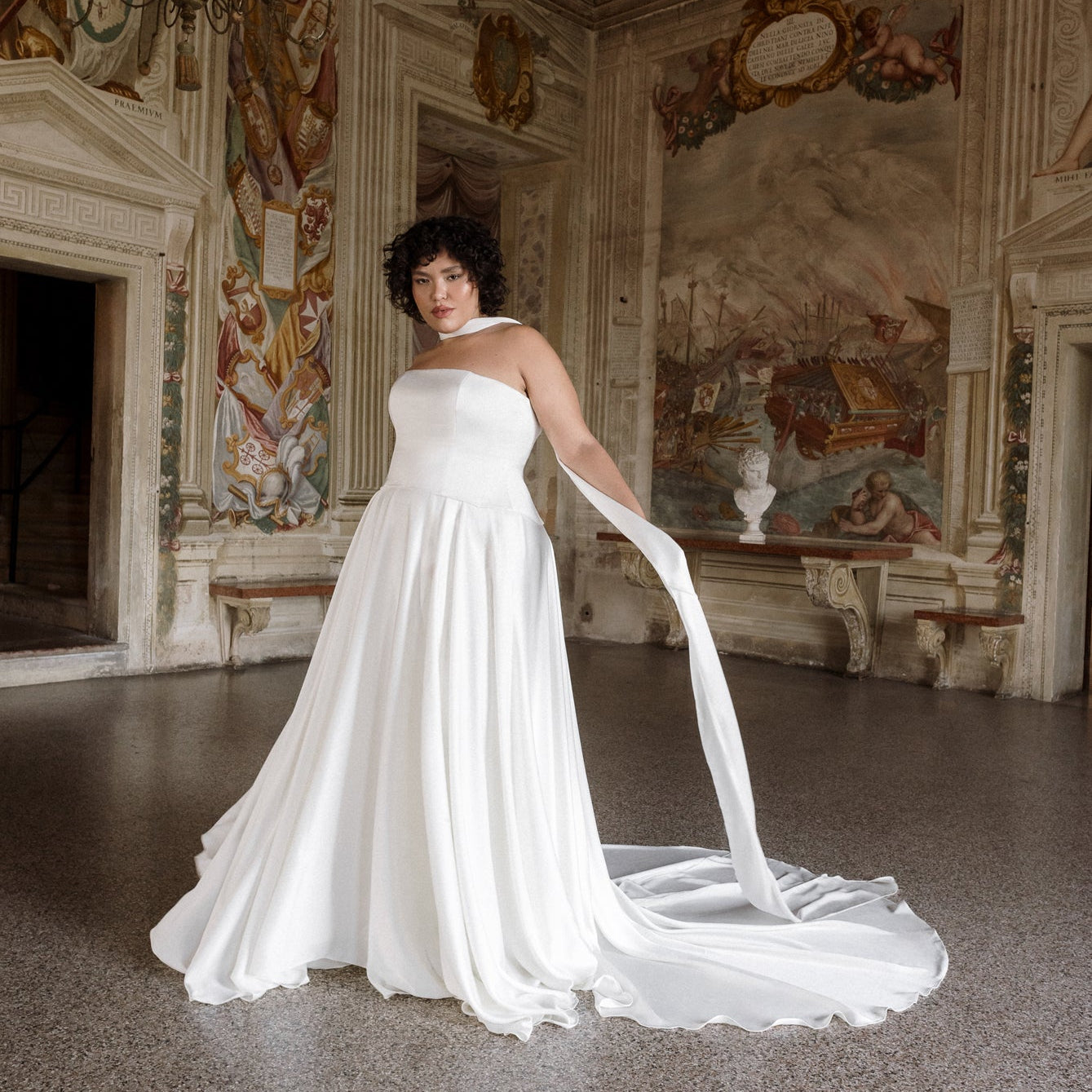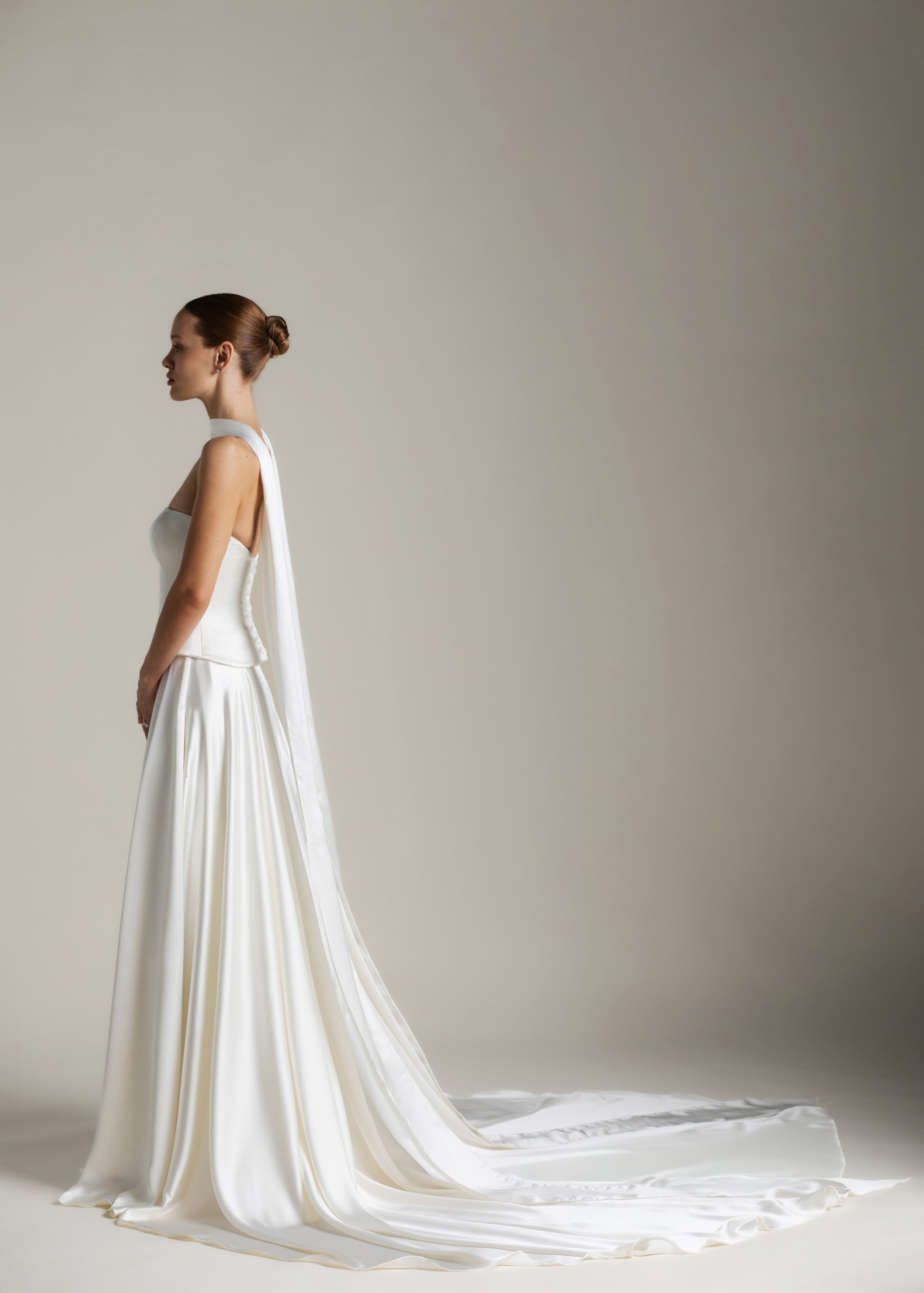 Gaia is an ode to sculptural simplicity. The strapless bodice cuts a crisp silhouette with a straight neckline; the curved, dropped waistline gently smooths the curves and falls into a sweeping full-circle skirt punctuated by discreet pockets and a luxurious 80” train. Her lace-up back adds a touch of classic romance, and contrasts with our iconic liquid satin. An optional, detachable modesty panel can be added under the lacing. Beneath it all, Gaia is lined in comfortable off-white midori for a gown that feels as fluid as she looks.