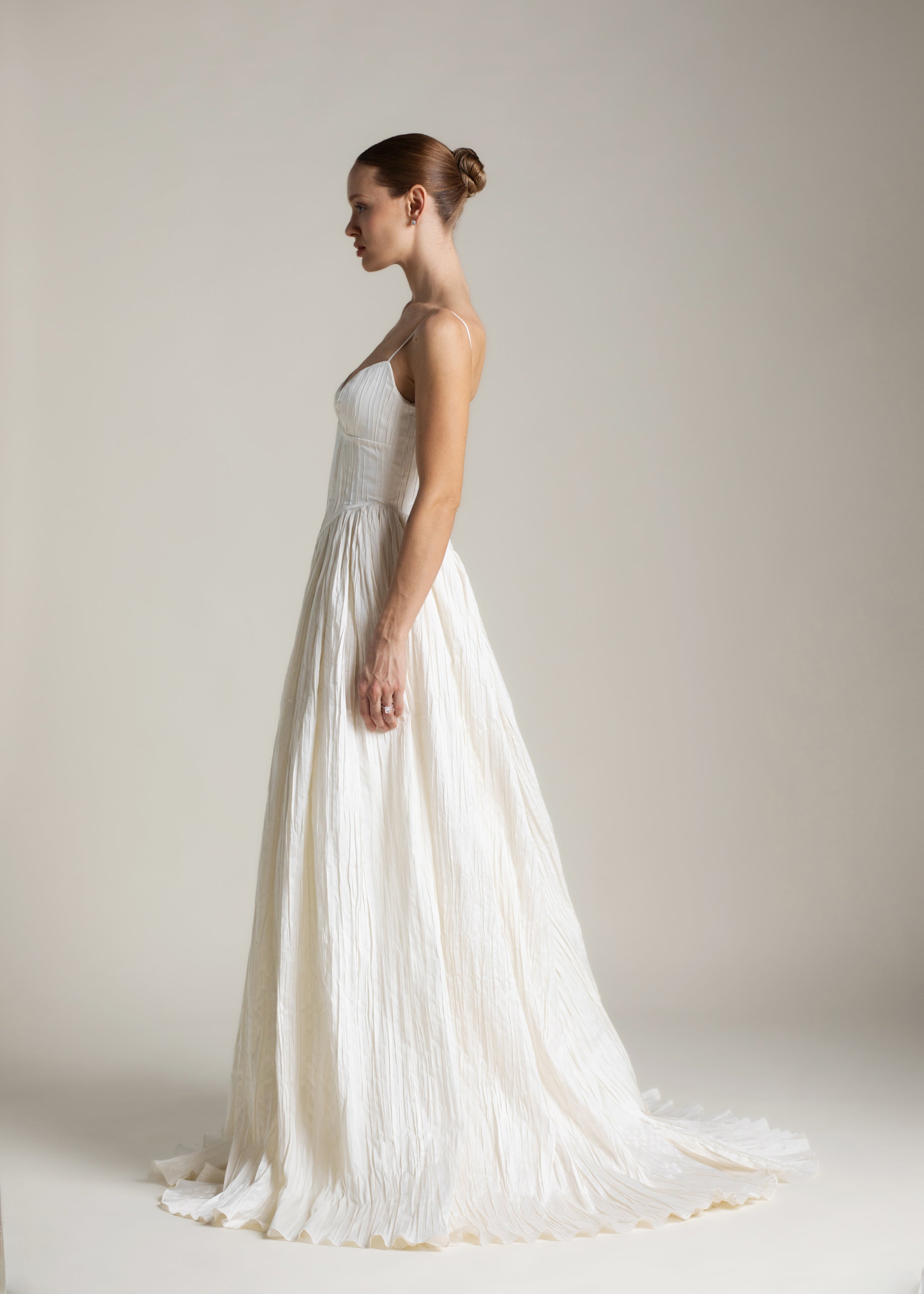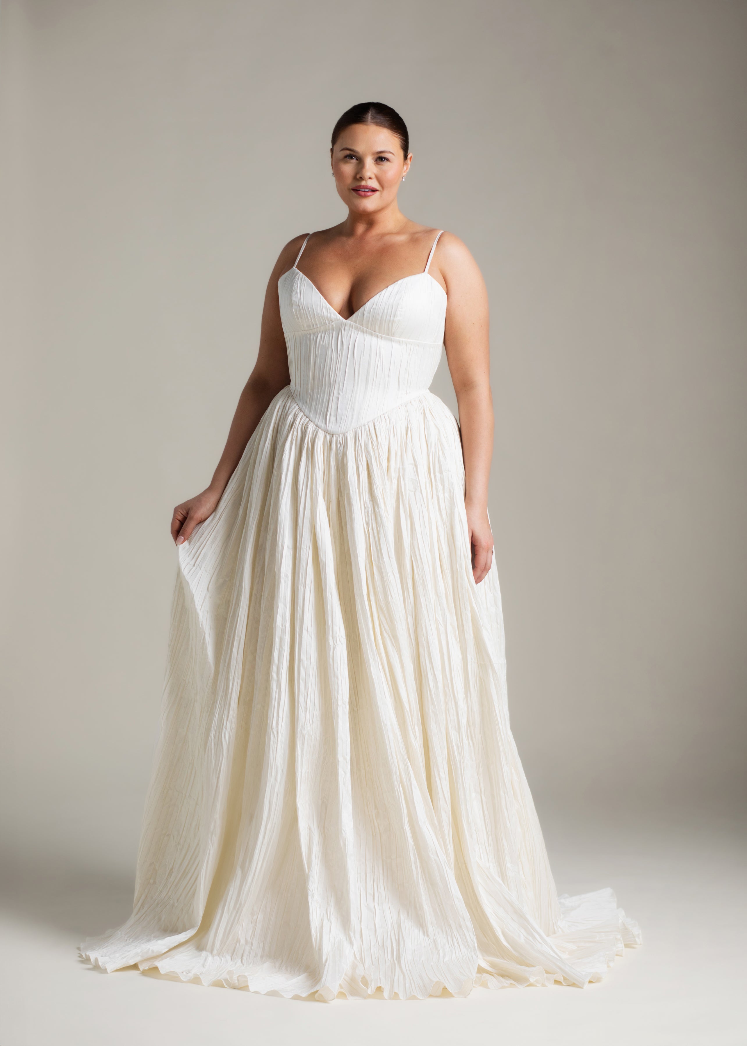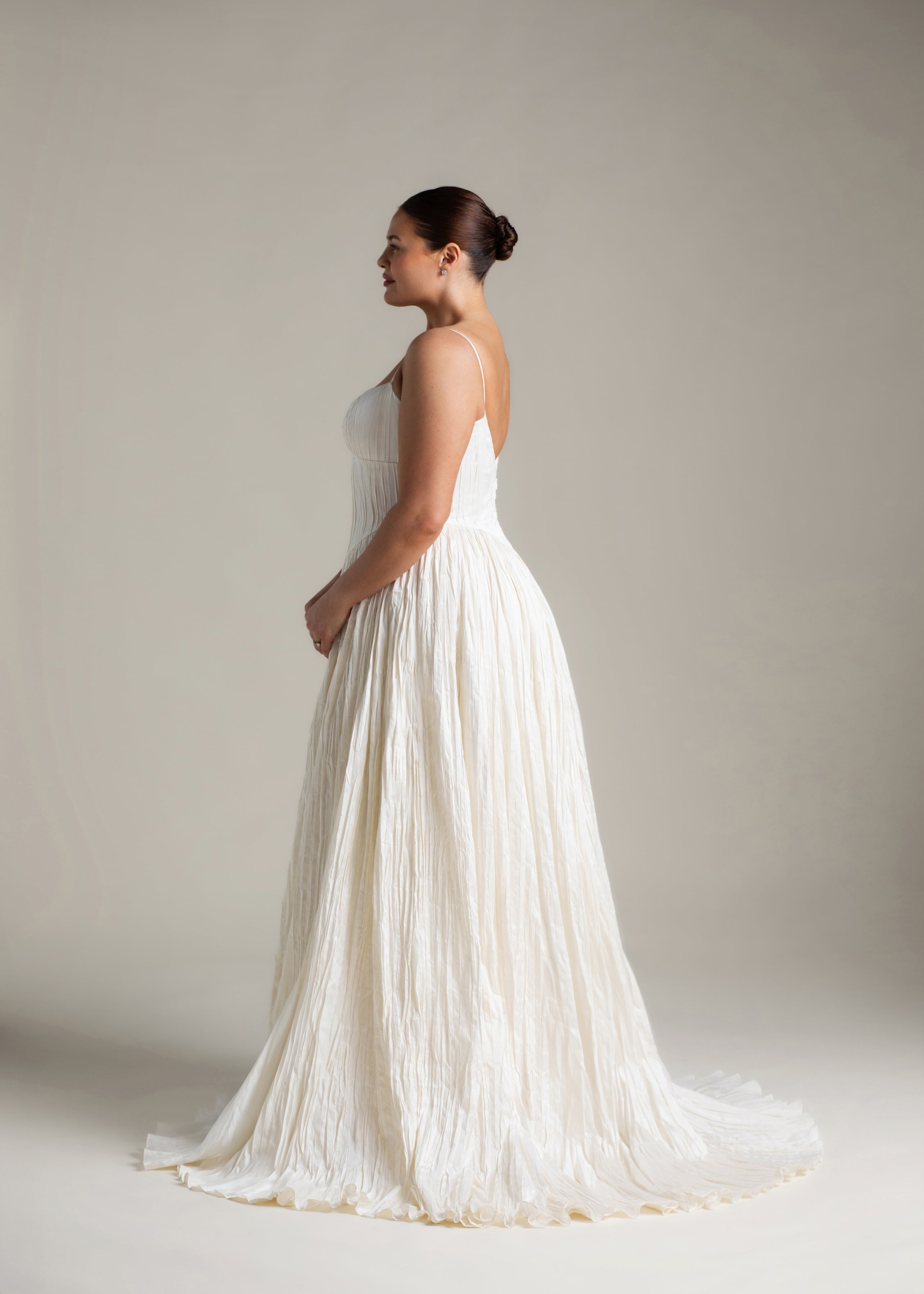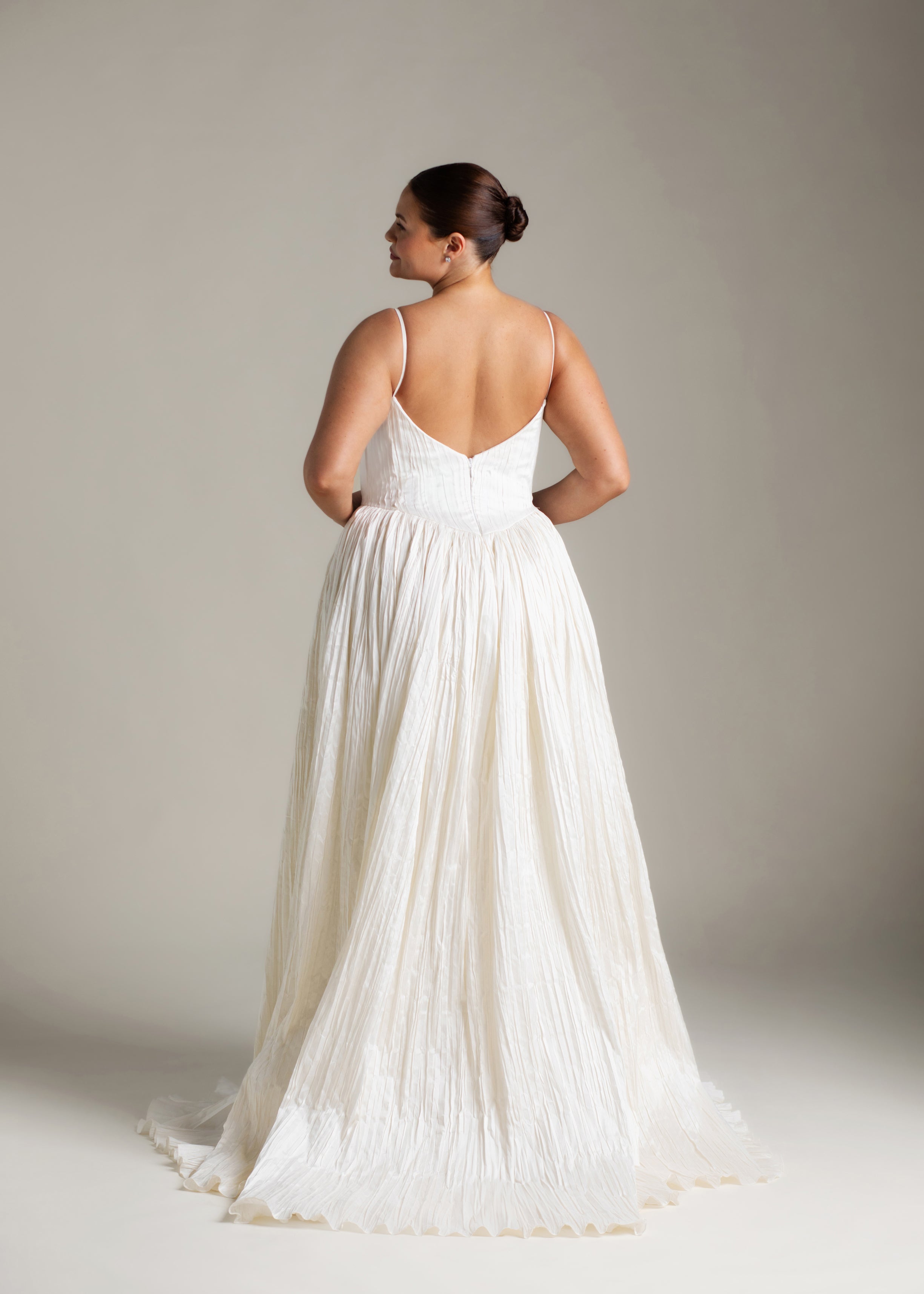 Named for the Greek goddess of femininity and flow, Rhea balances bold shapes with a soft texture. The plunging v-neck bodice is anchored by delicate ½” straps, contrasting with a basque waist, drawing the eye down and elongating the silhouette. From there, Rhea’s gathered circle skirt cascades out in crisp pleated taffeta, its 65” train blending softness and vitality, ease and strength. She’s lined in a comfortable off-white midori.