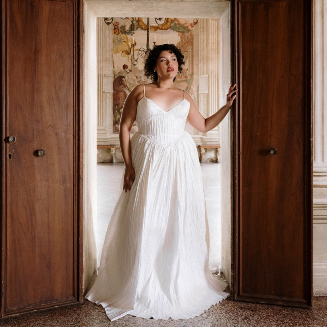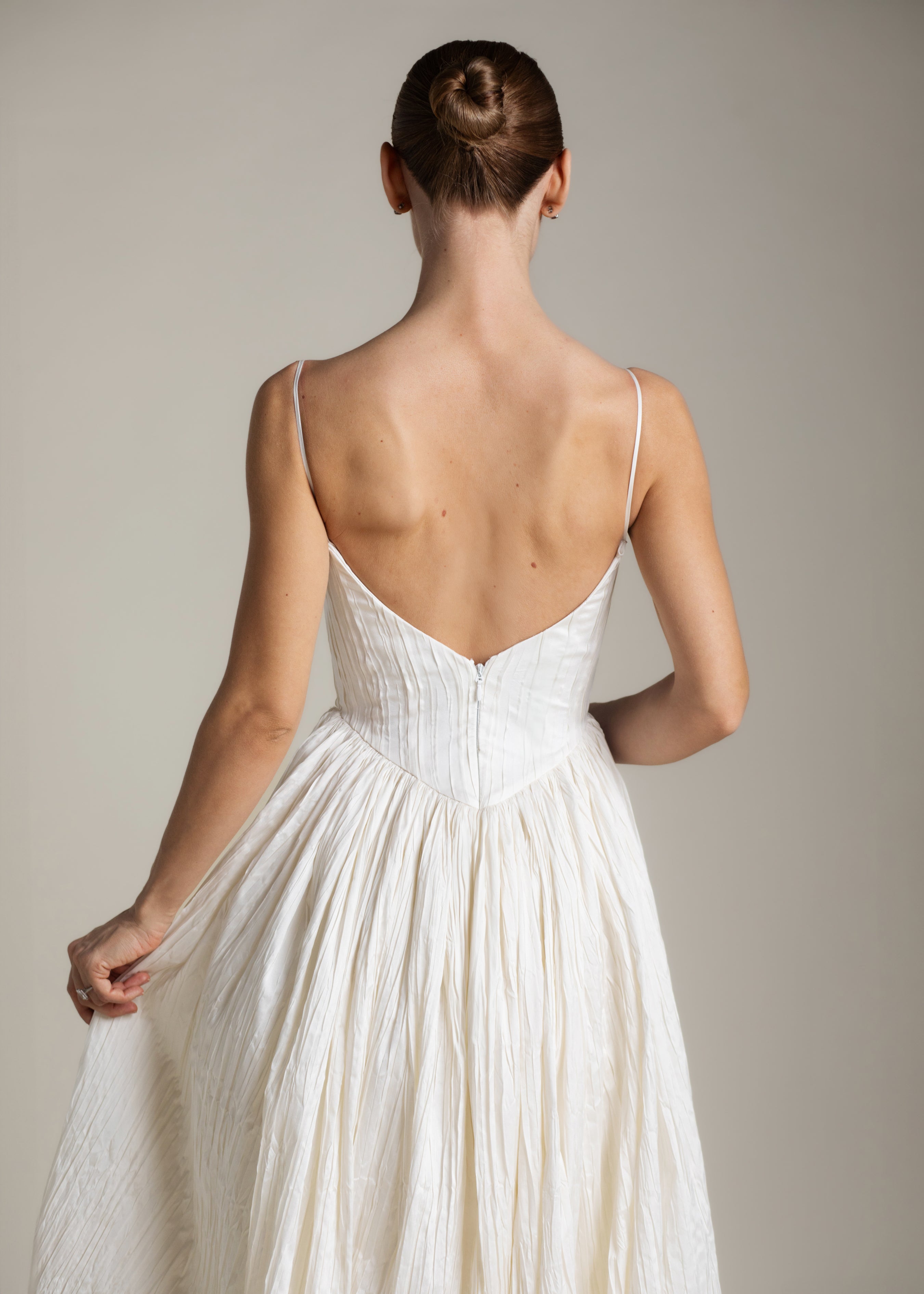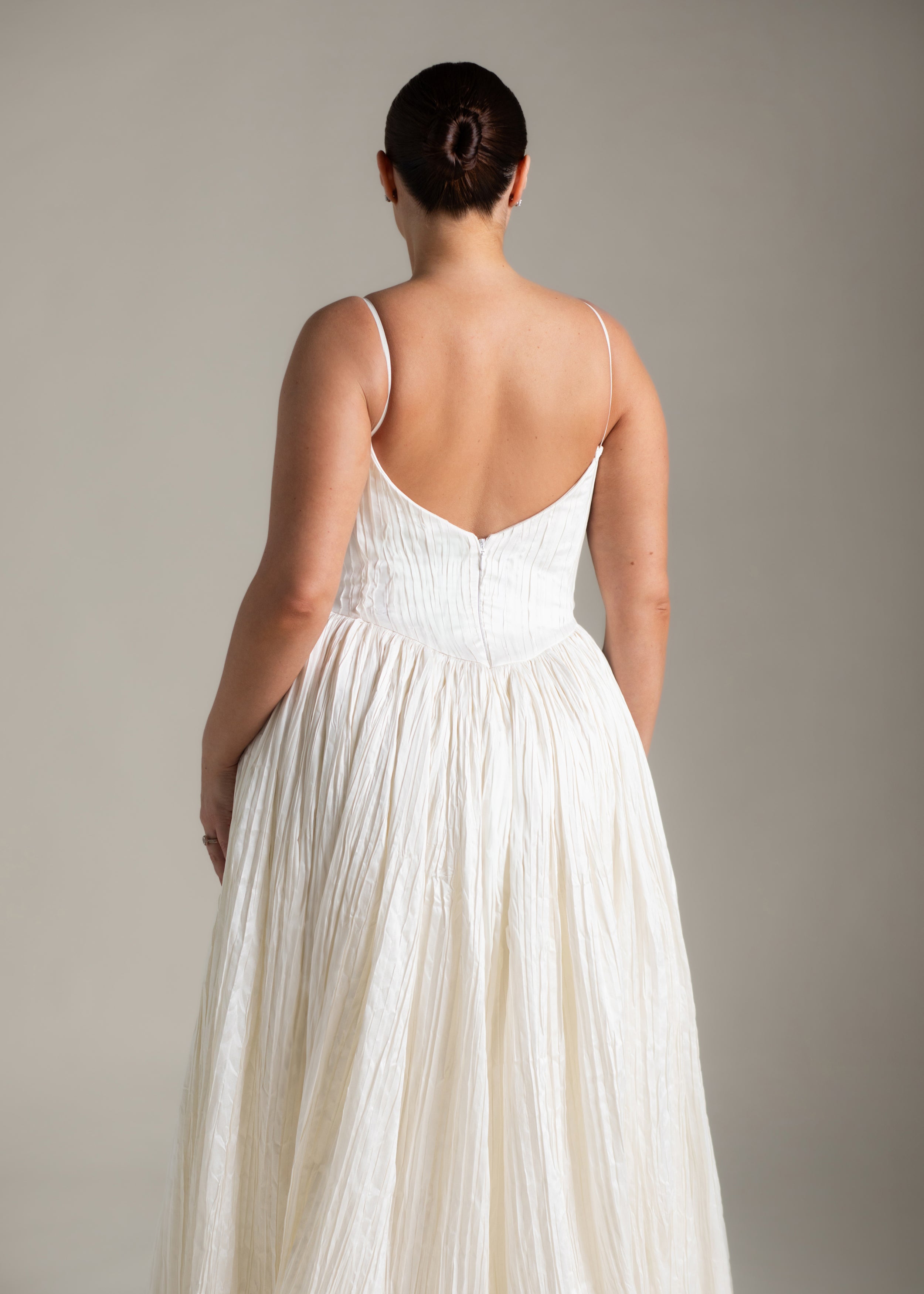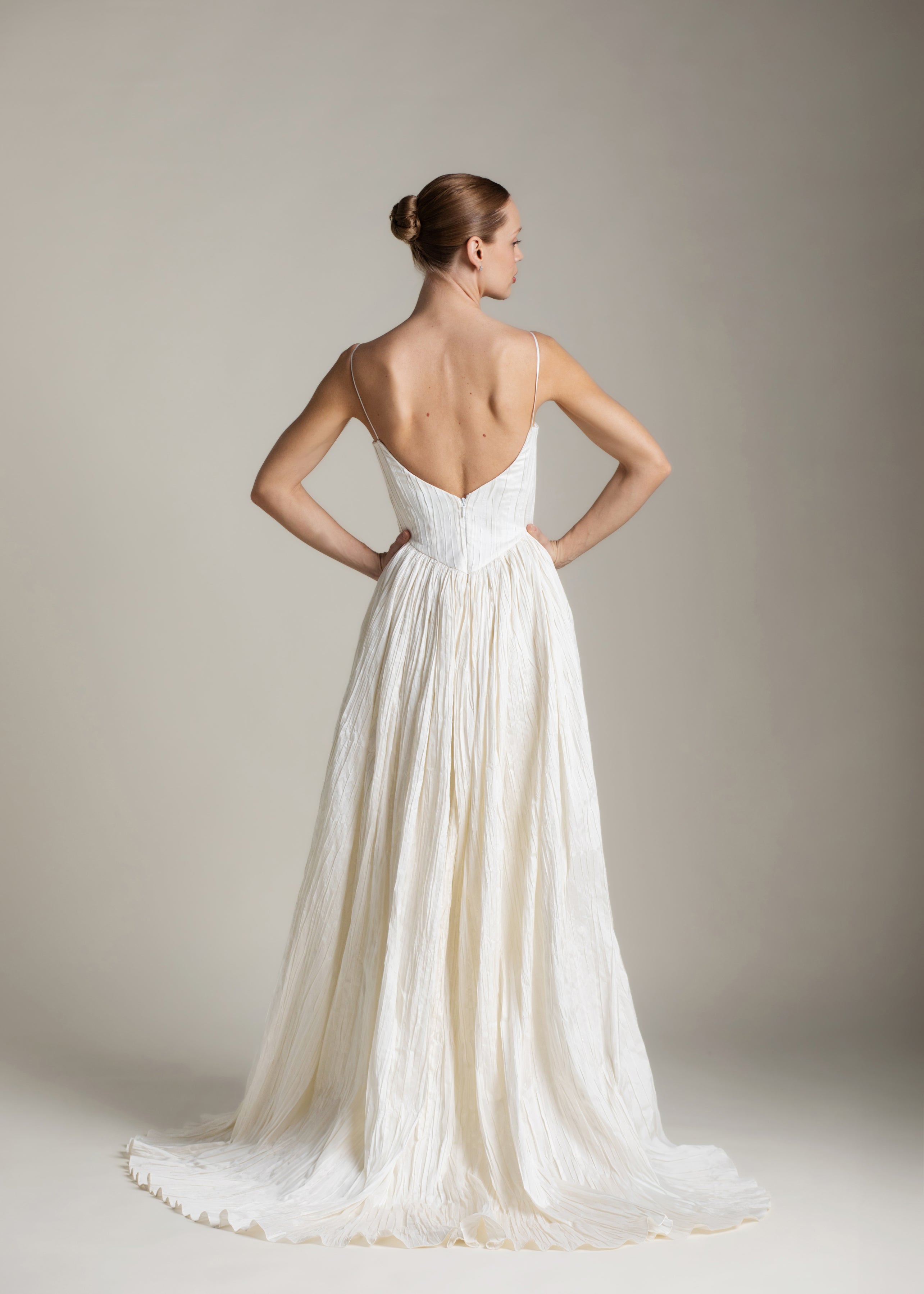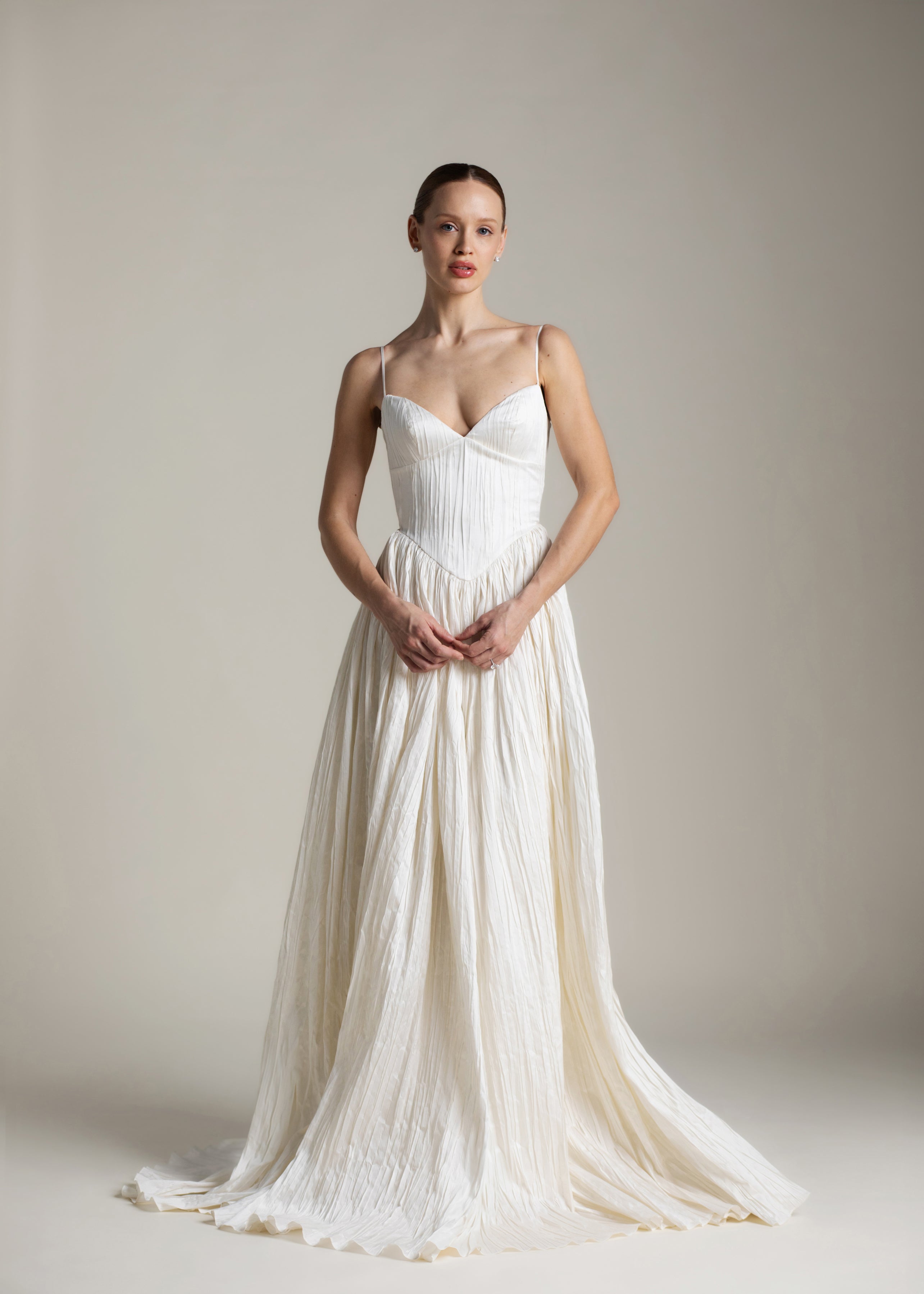 Named for the Greek goddess of femininity and flow, Rhea balances bold shapes with a soft texture. The plunging v-neck bodice is anchored by delicate ½” straps, contrasting with a basque waist, drawing the eye down and elongating the silhouette. From there, Rhea’s gathered circle skirt cascades out in crisp pleated taffeta, its 65” train blending softness and vitality, ease and strength. She’s lined in a comfortable off-white midori.