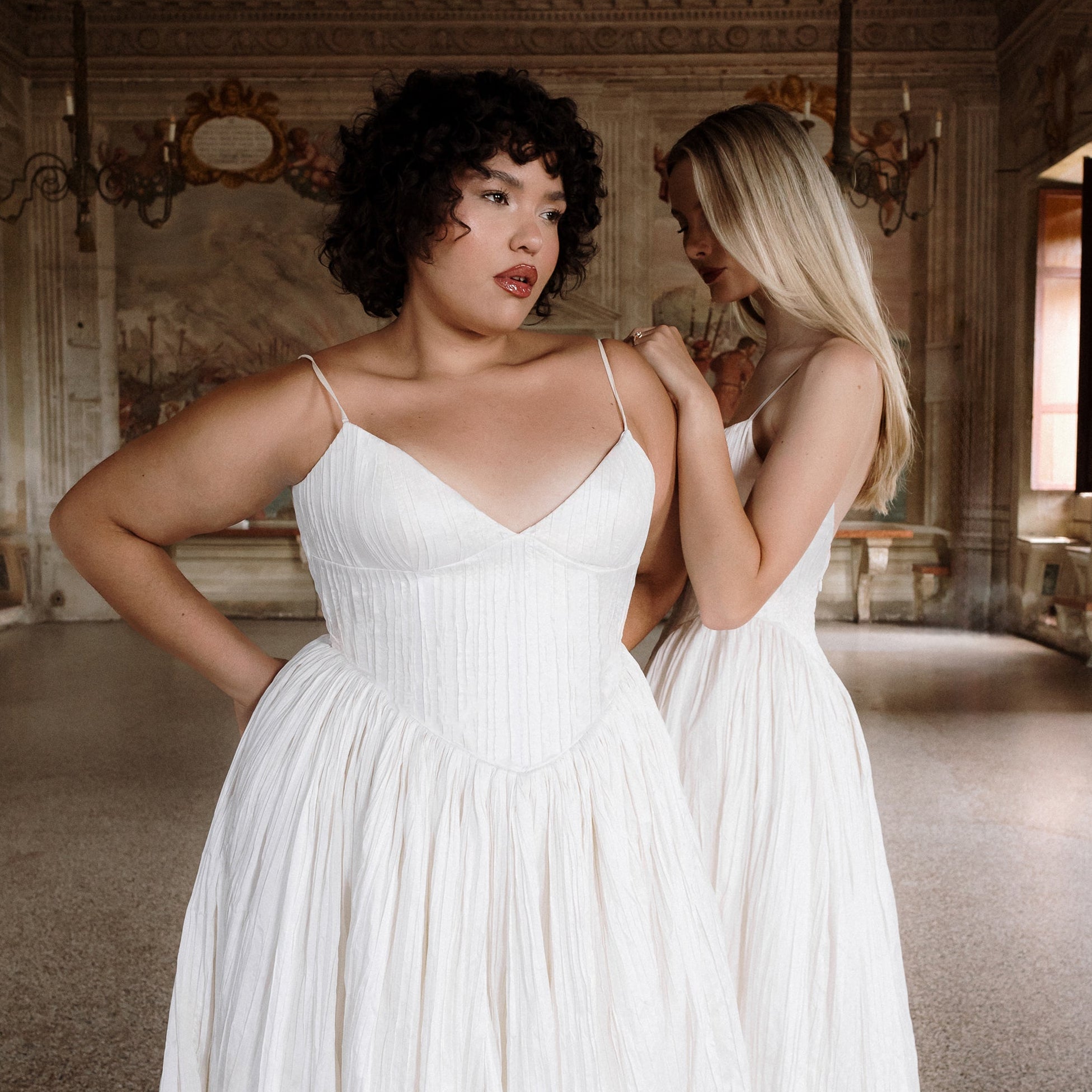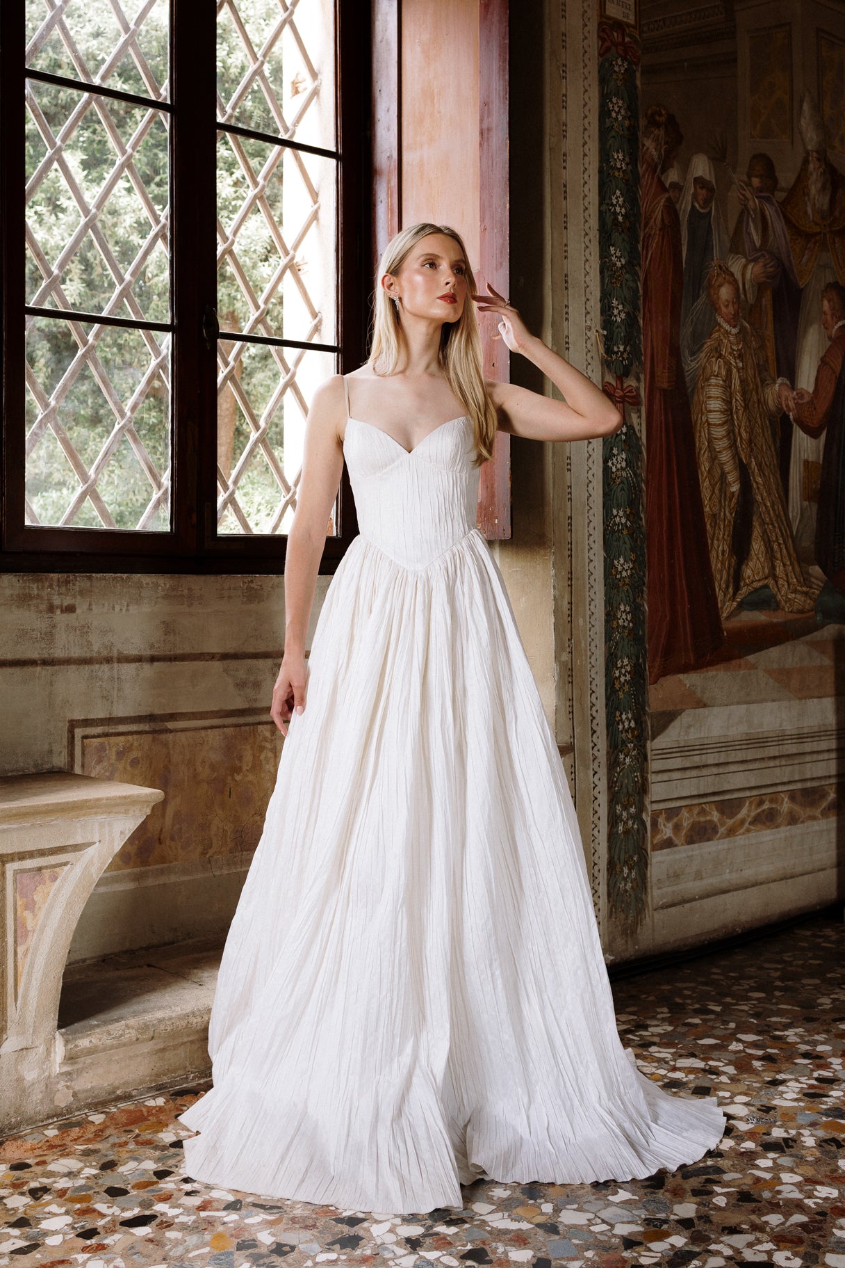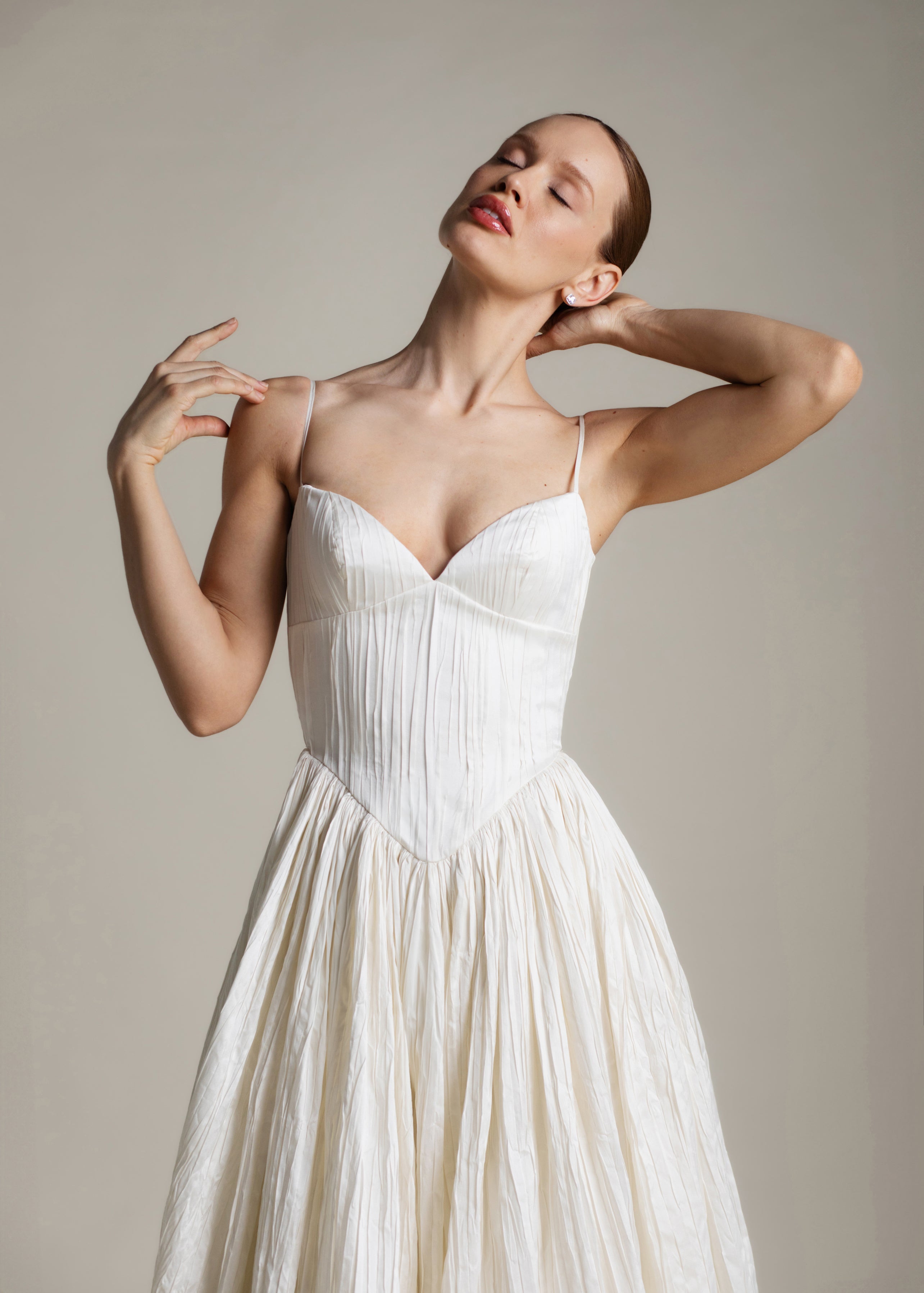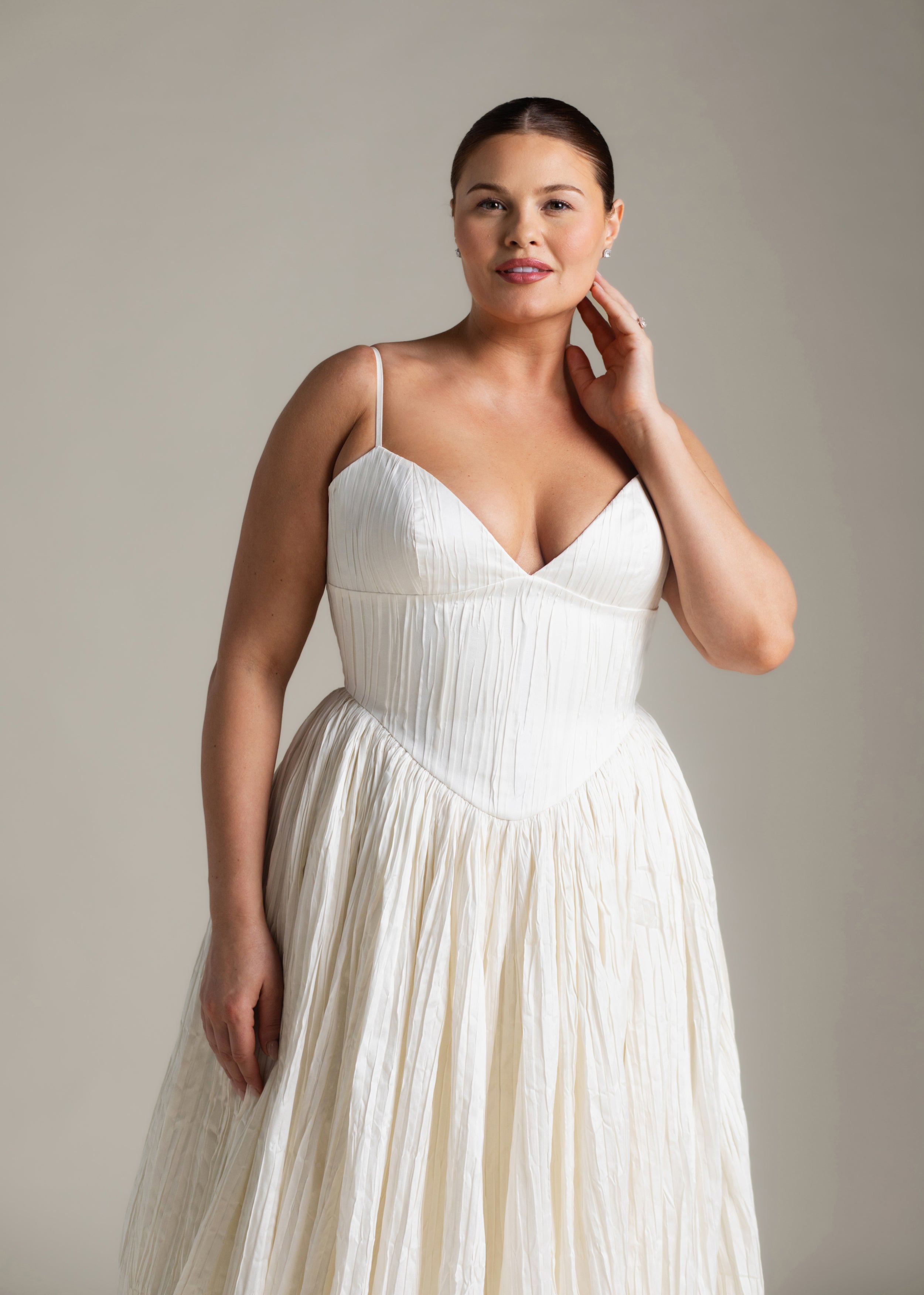 Named for the Greek goddess of femininity and flow, Rhea balances bold shapes with a soft texture. The plunging v-neck bodice is anchored by delicate ½” straps, contrasting with a basque waist, drawing the eye down and elongating the silhouette. From there, Rhea’s gathered circle skirt cascades out in crisp pleated taffeta, its 65” train blending softness and vitality, ease and strength. She’s lined in a comfortable off-white midori.