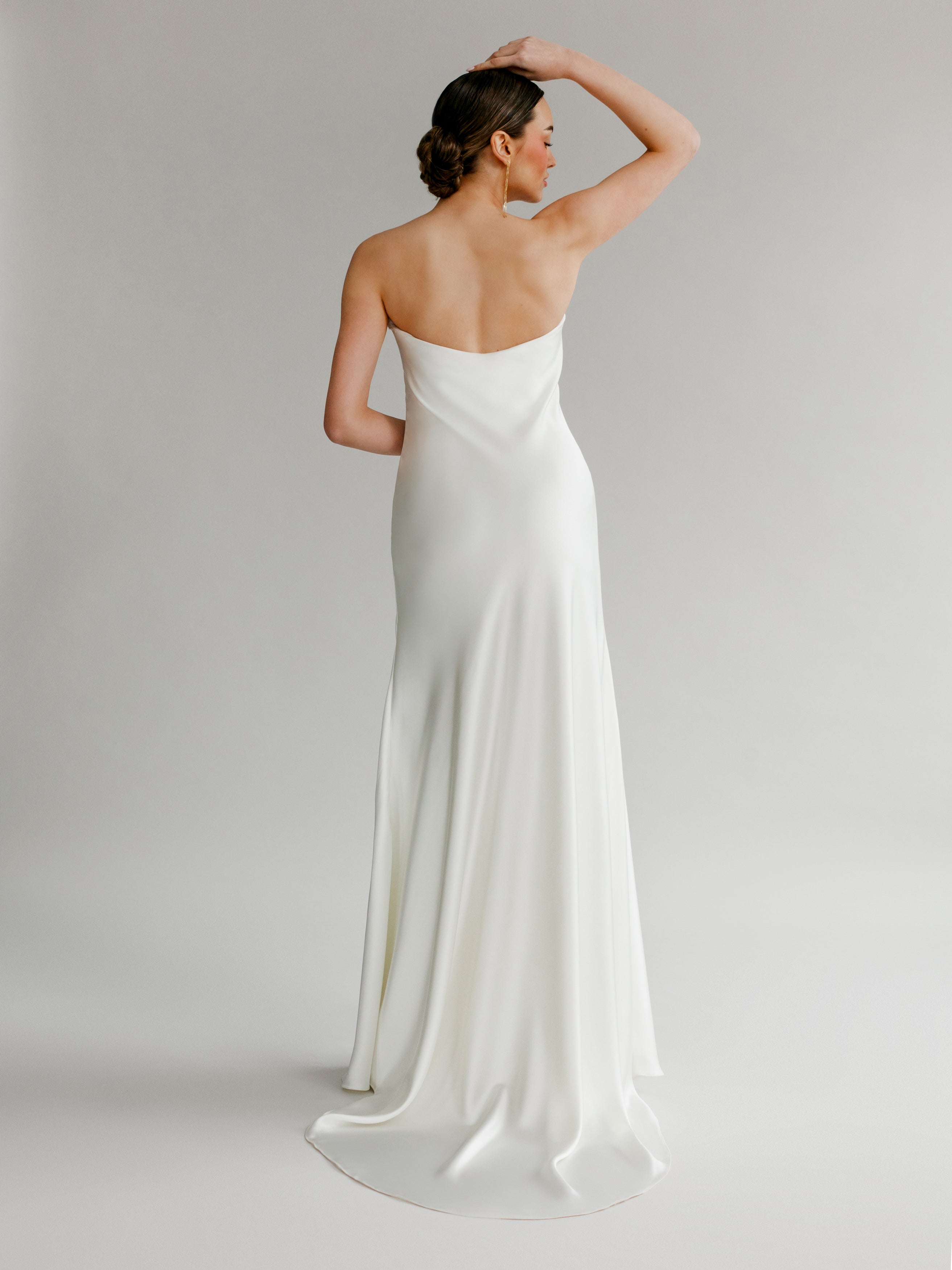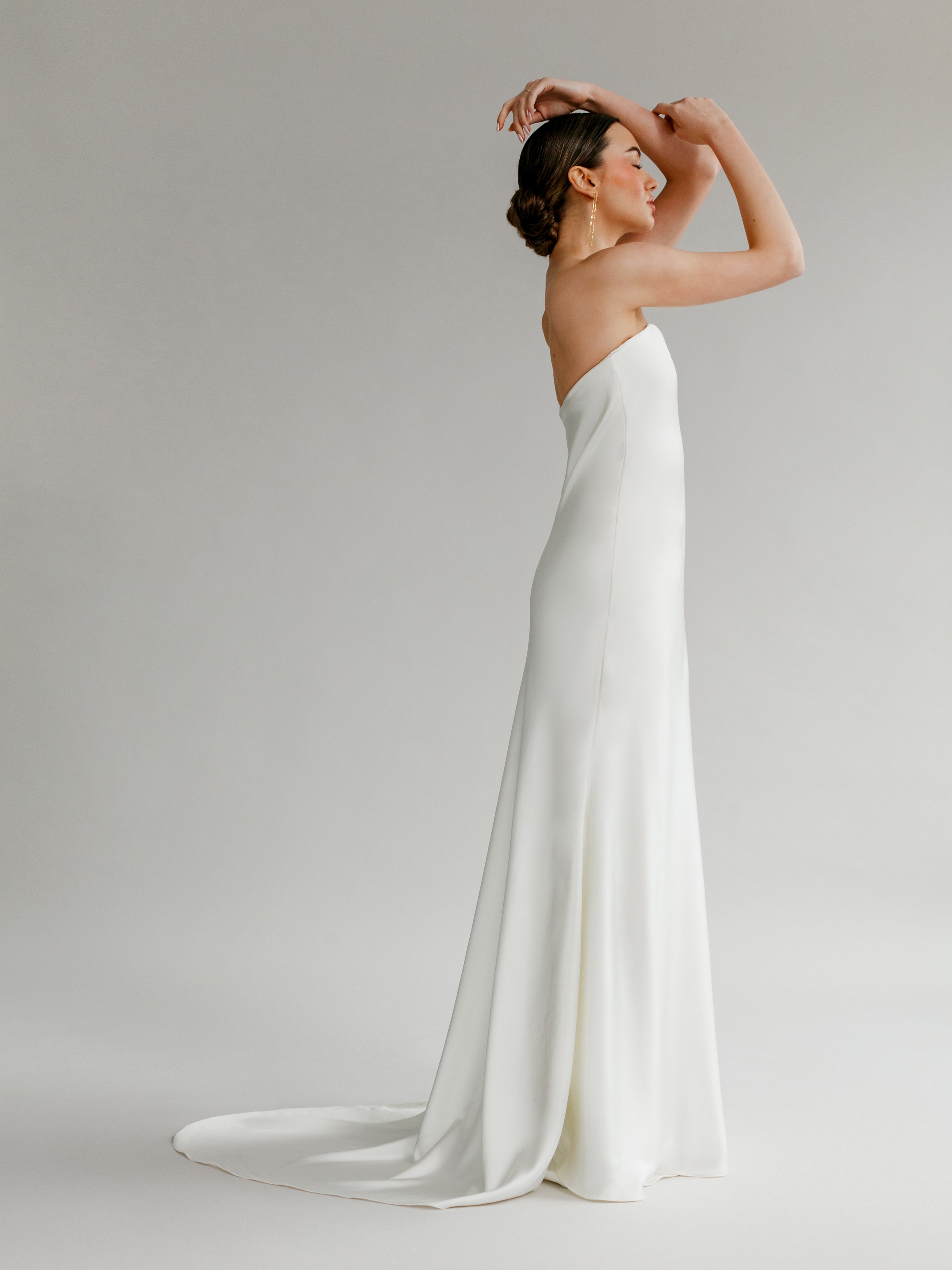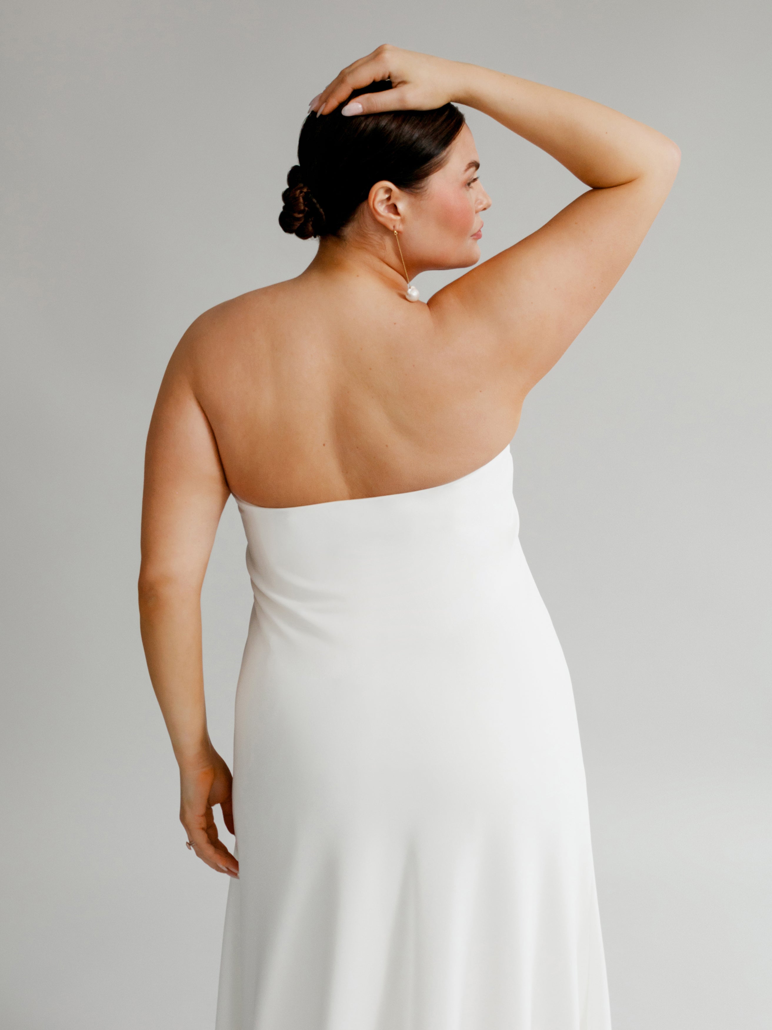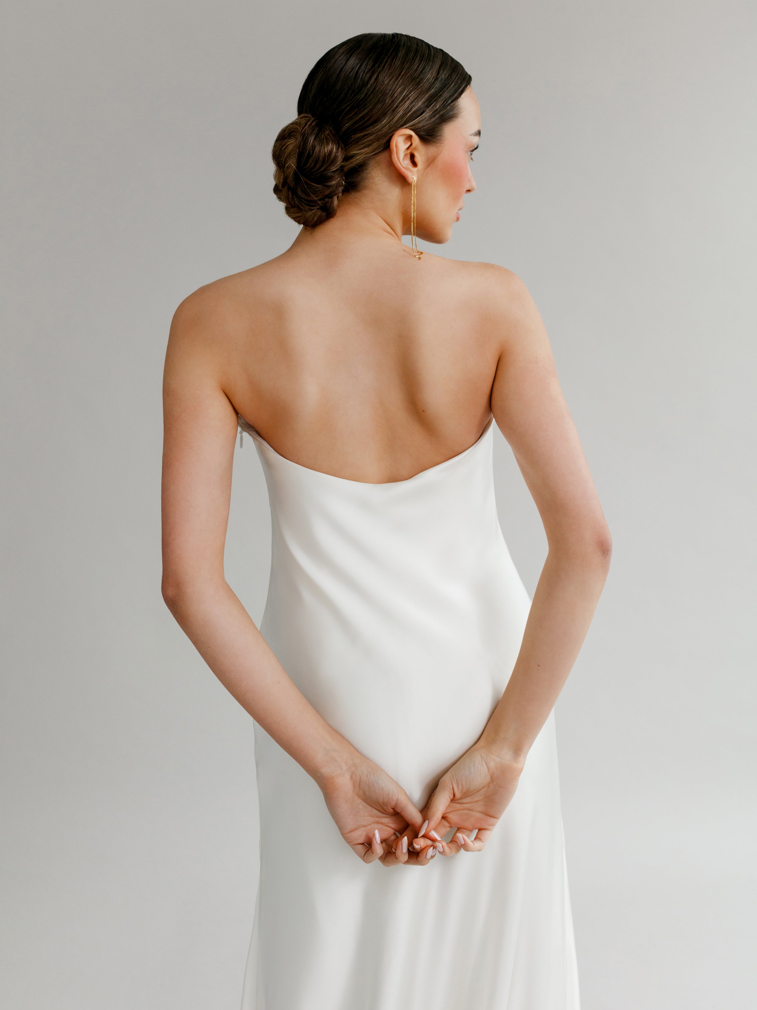 Leonora is an elegant gown featuring a comfortable body-skimming bias-cut silhouette. It has a structured lining for support, and is available in a liquid satin or crepe. Leonora pairs beautifully with our Pearl Cape; if you are interested in the set, the gown and cape are available together here.
