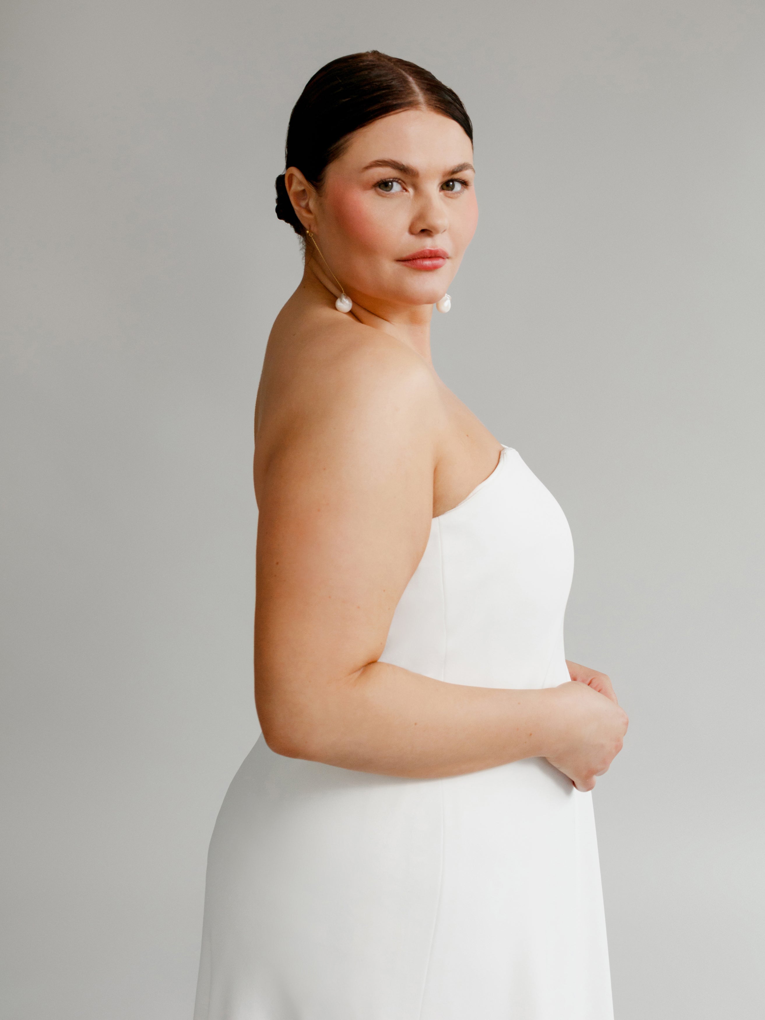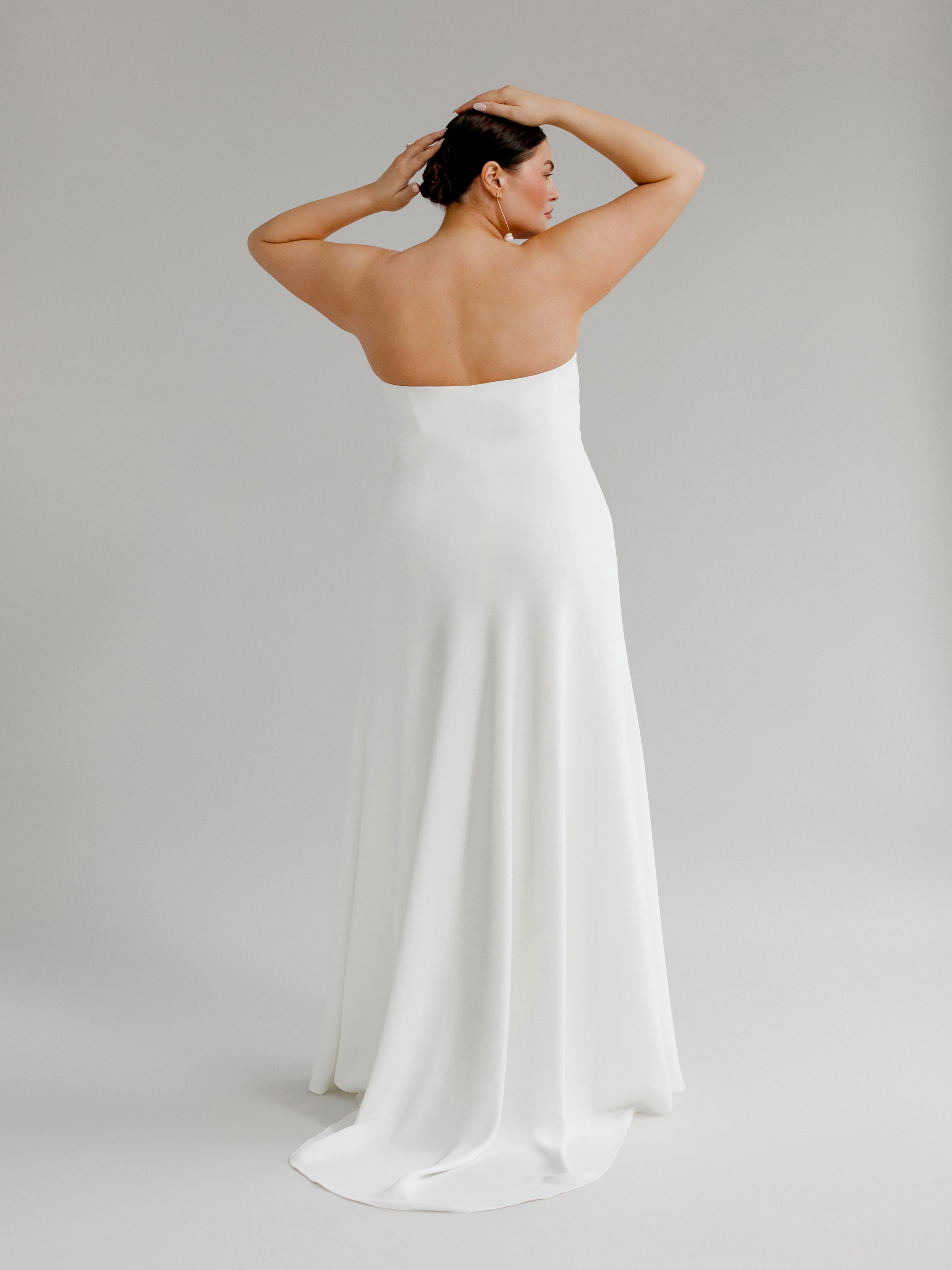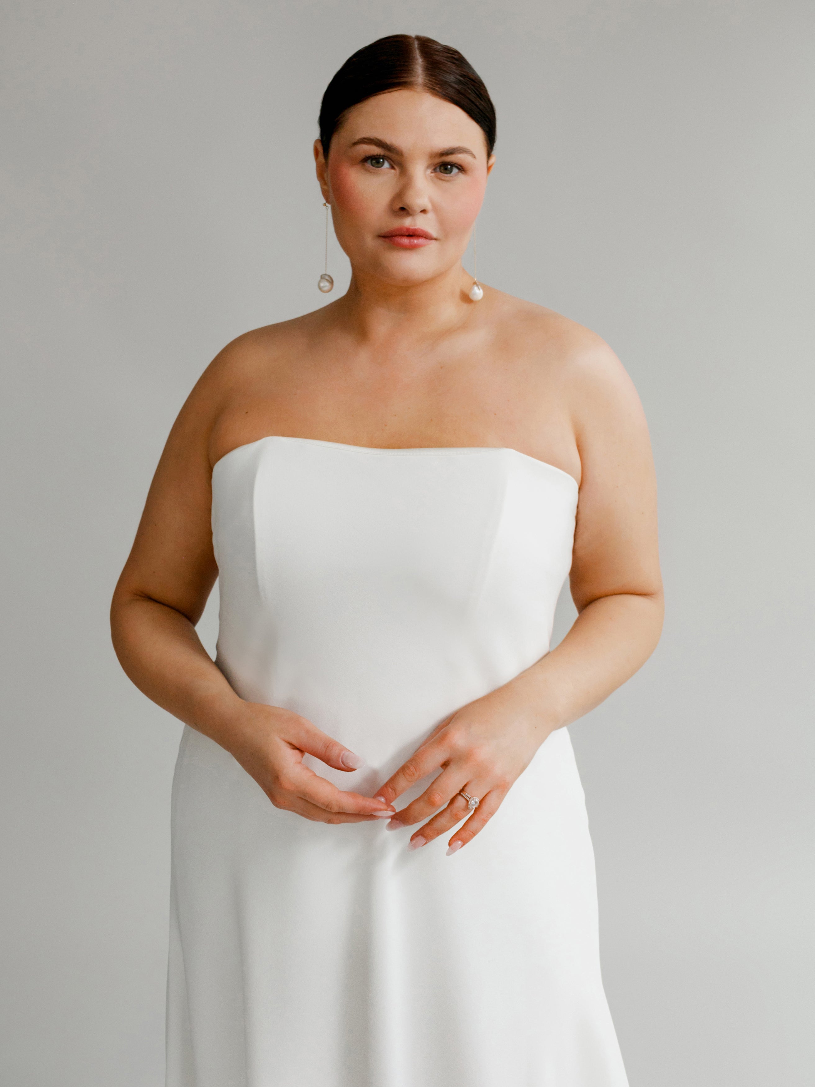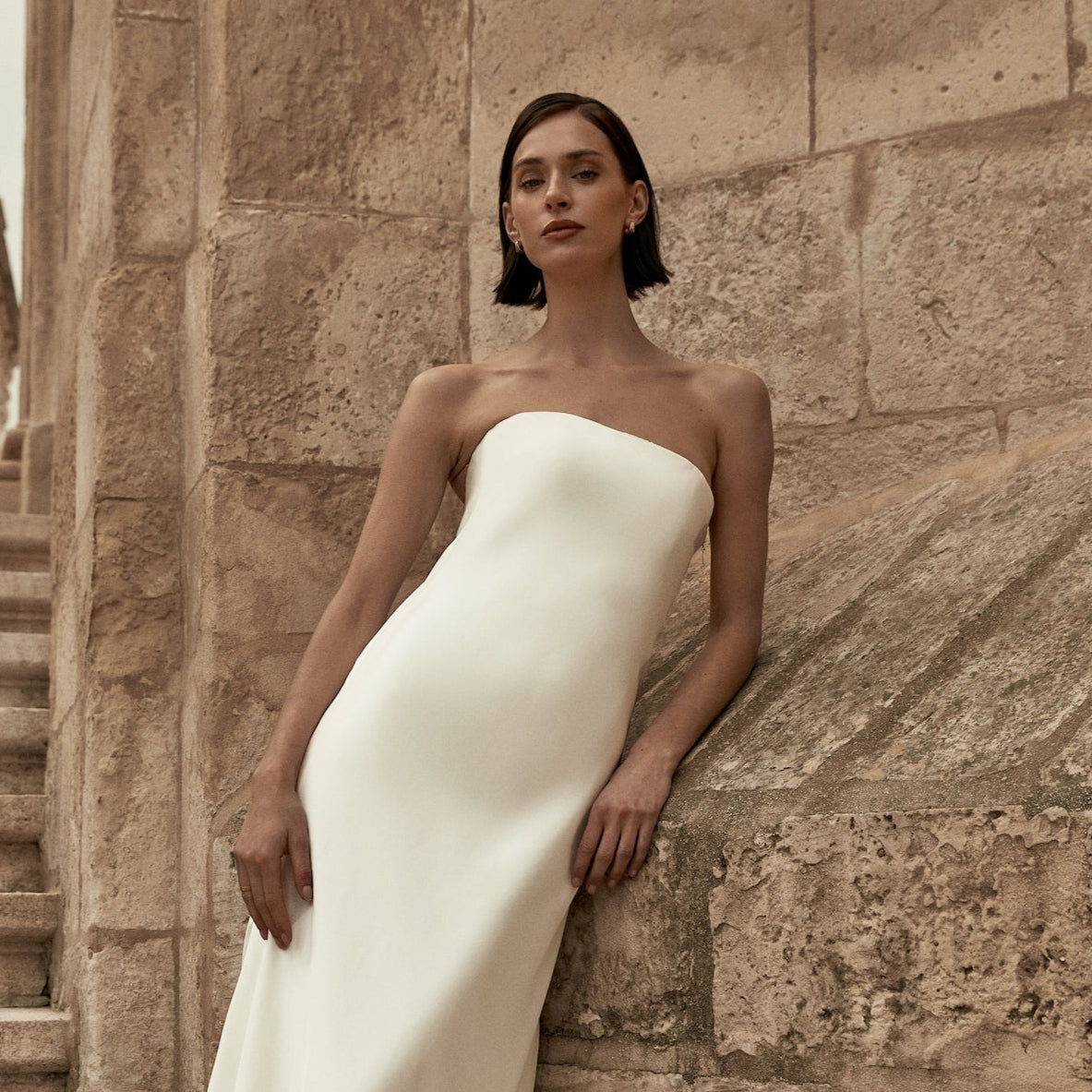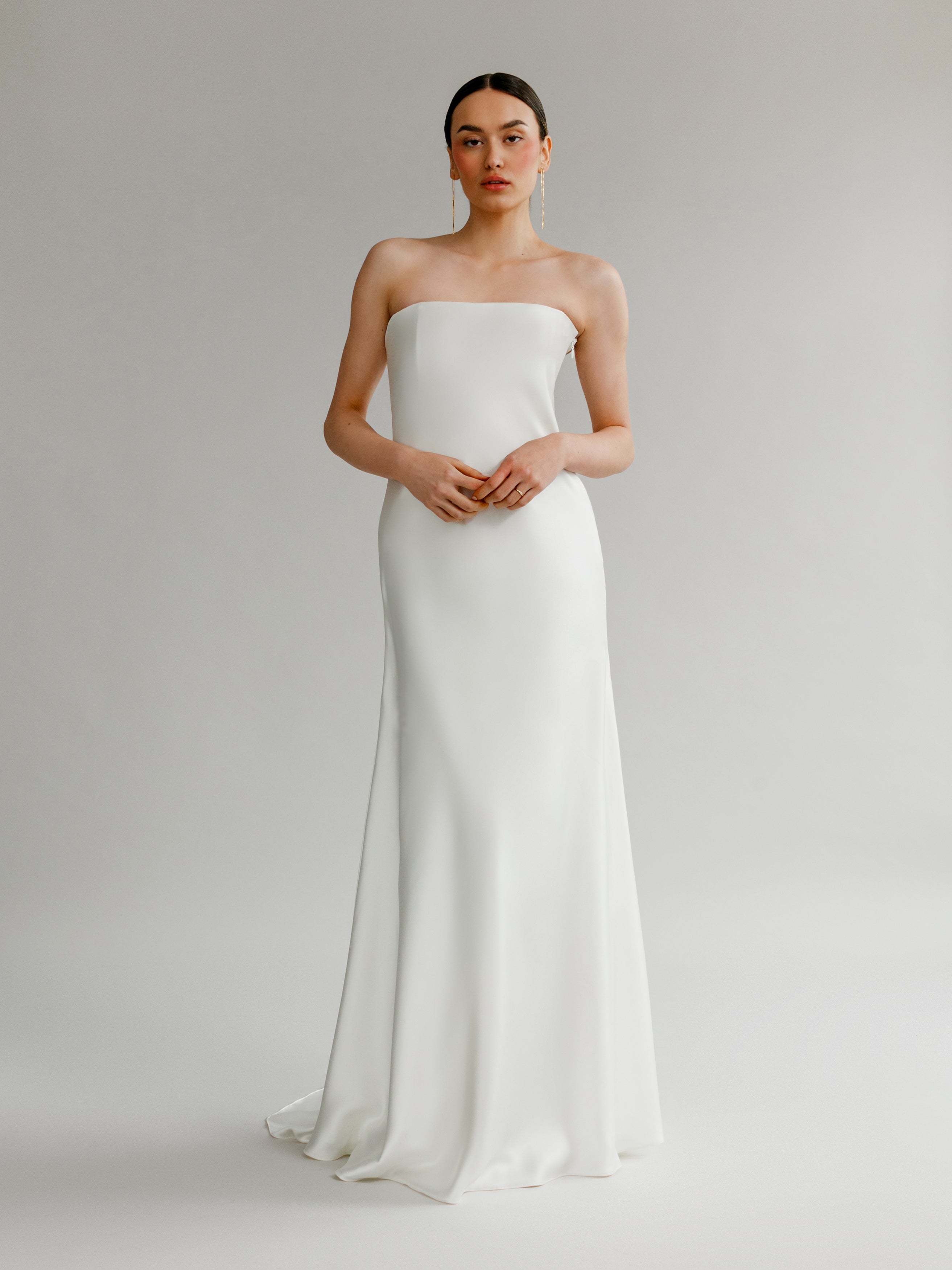 Leonora is an elegant gown featuring a comfortable body-skimming bias-cut silhouette. It has a structured lining for support, and is available in a liquid satin or crepe. Leonora pairs beautifully with our Pearl Cape; if you are interested in the set, the gown and cape are available together here.