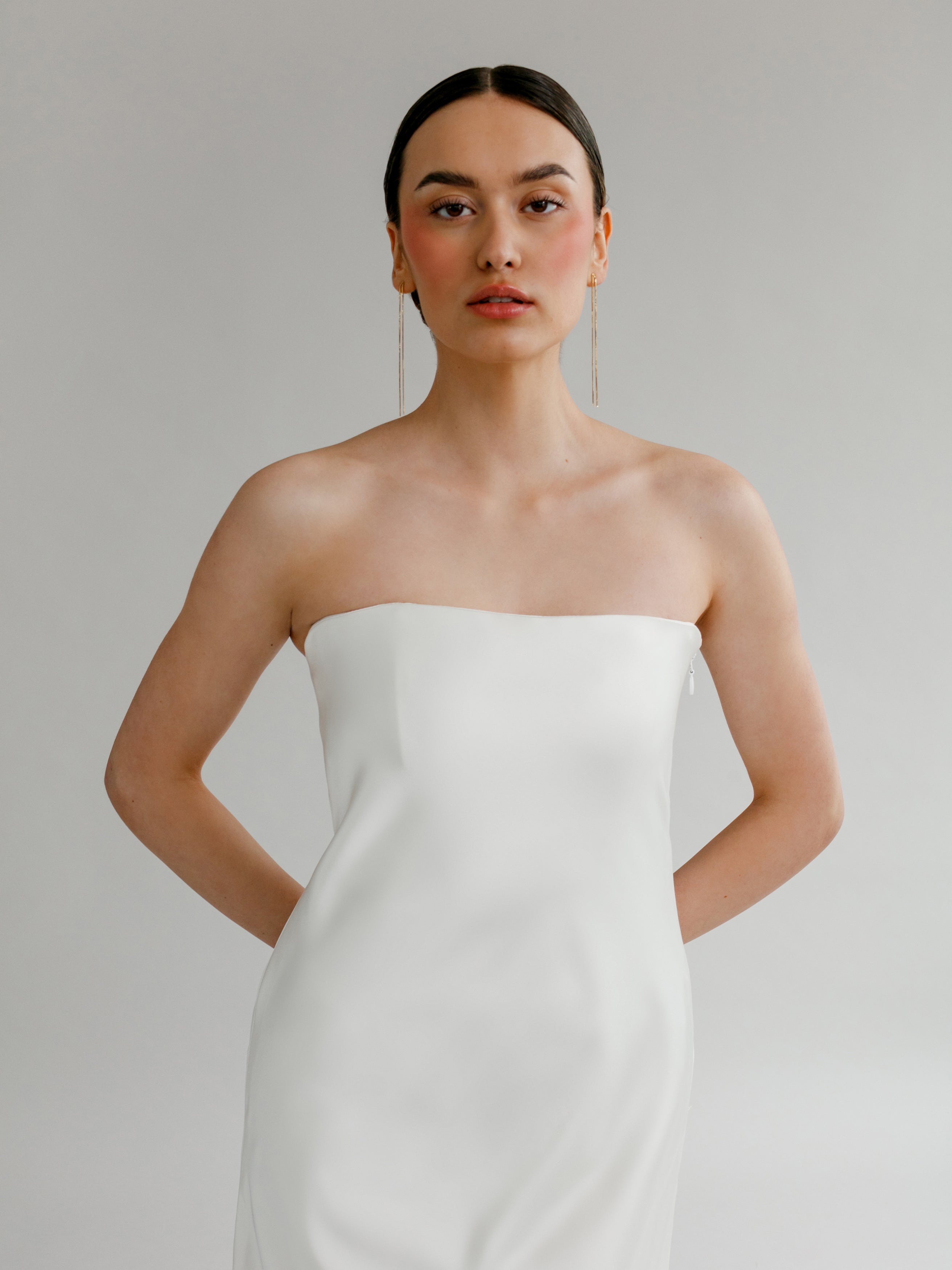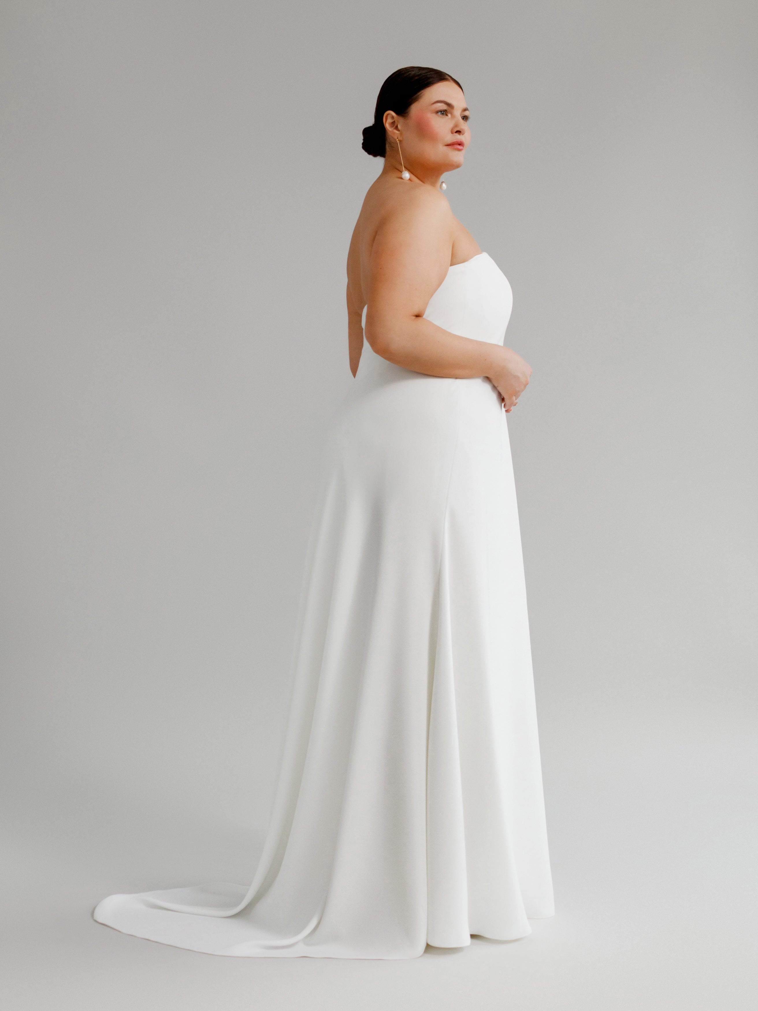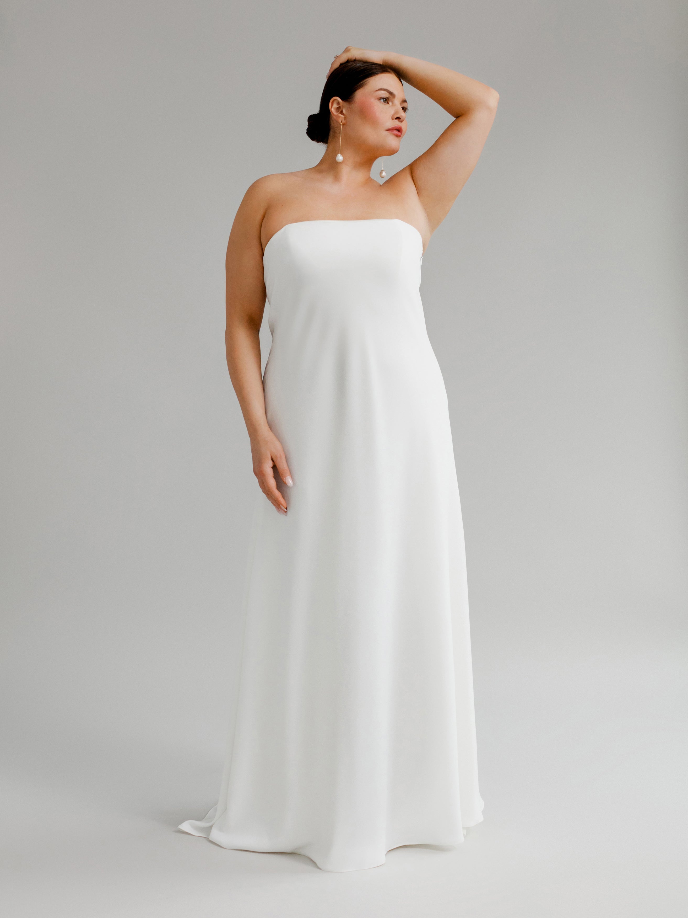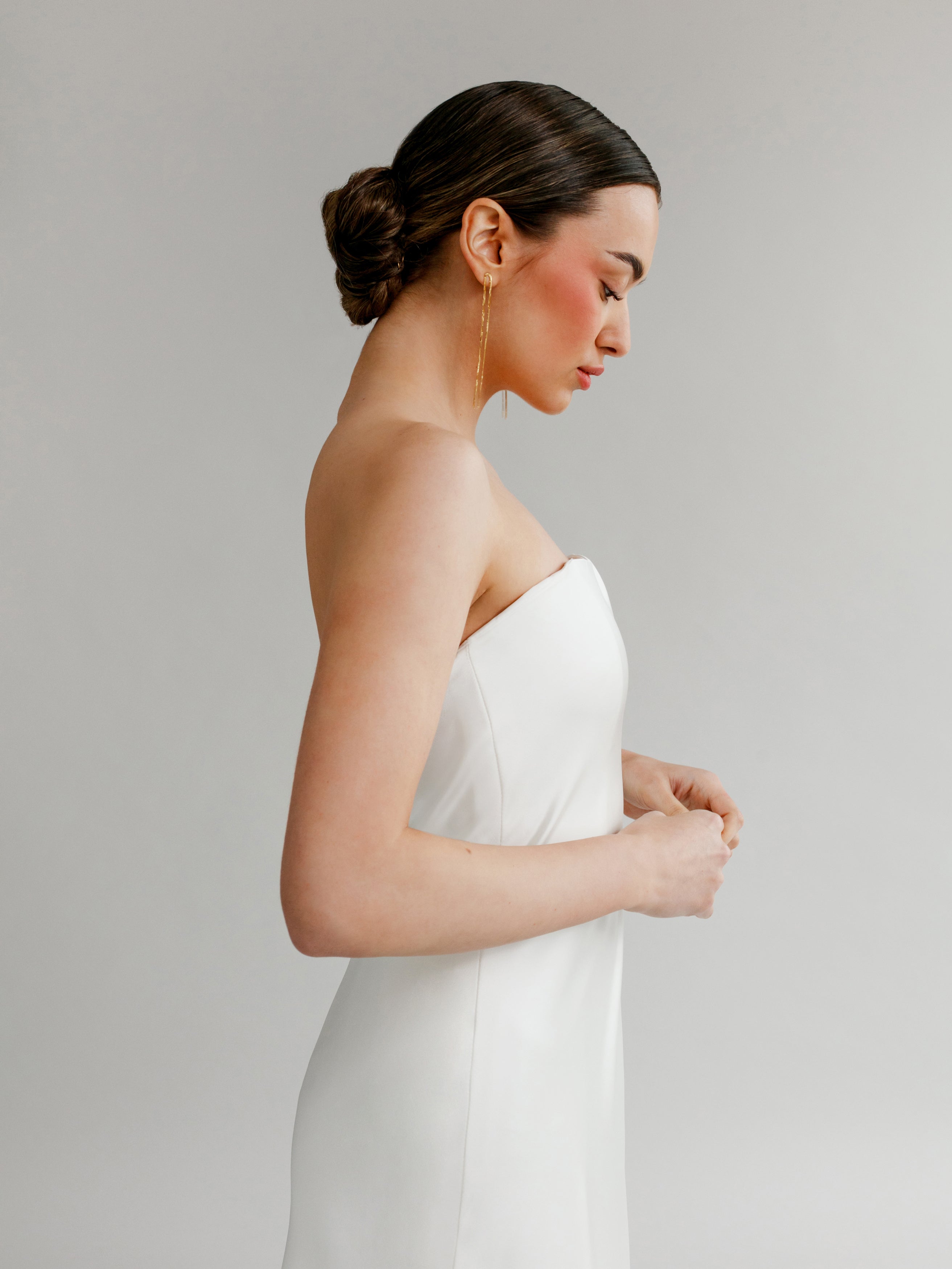 Leonora is an elegant gown featuring a comfortable body-skimming bias-cut silhouette. It has a structured lining for support, and is available in a liquid satin or crepe. Leonora pairs beautifully with our Pearl Cape; if you are interested in the set, the gown and cape are available together here.