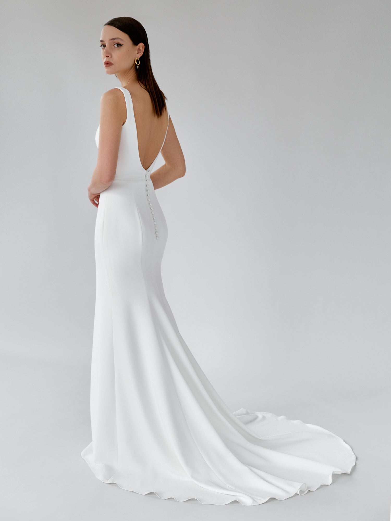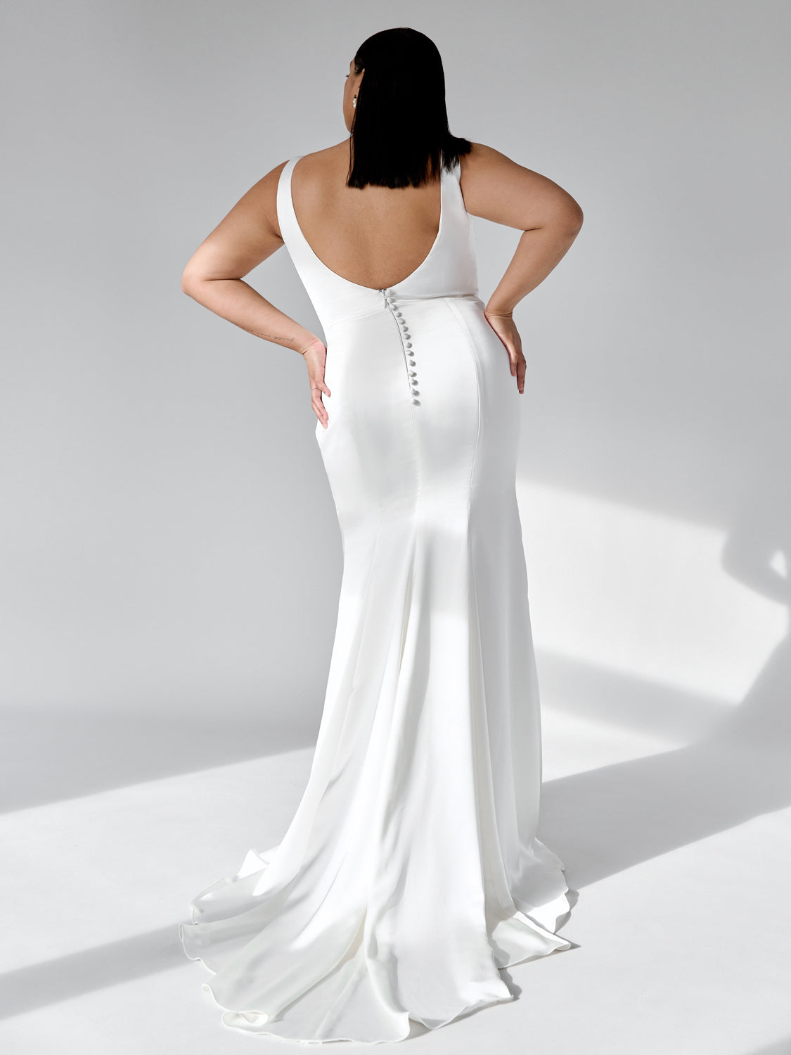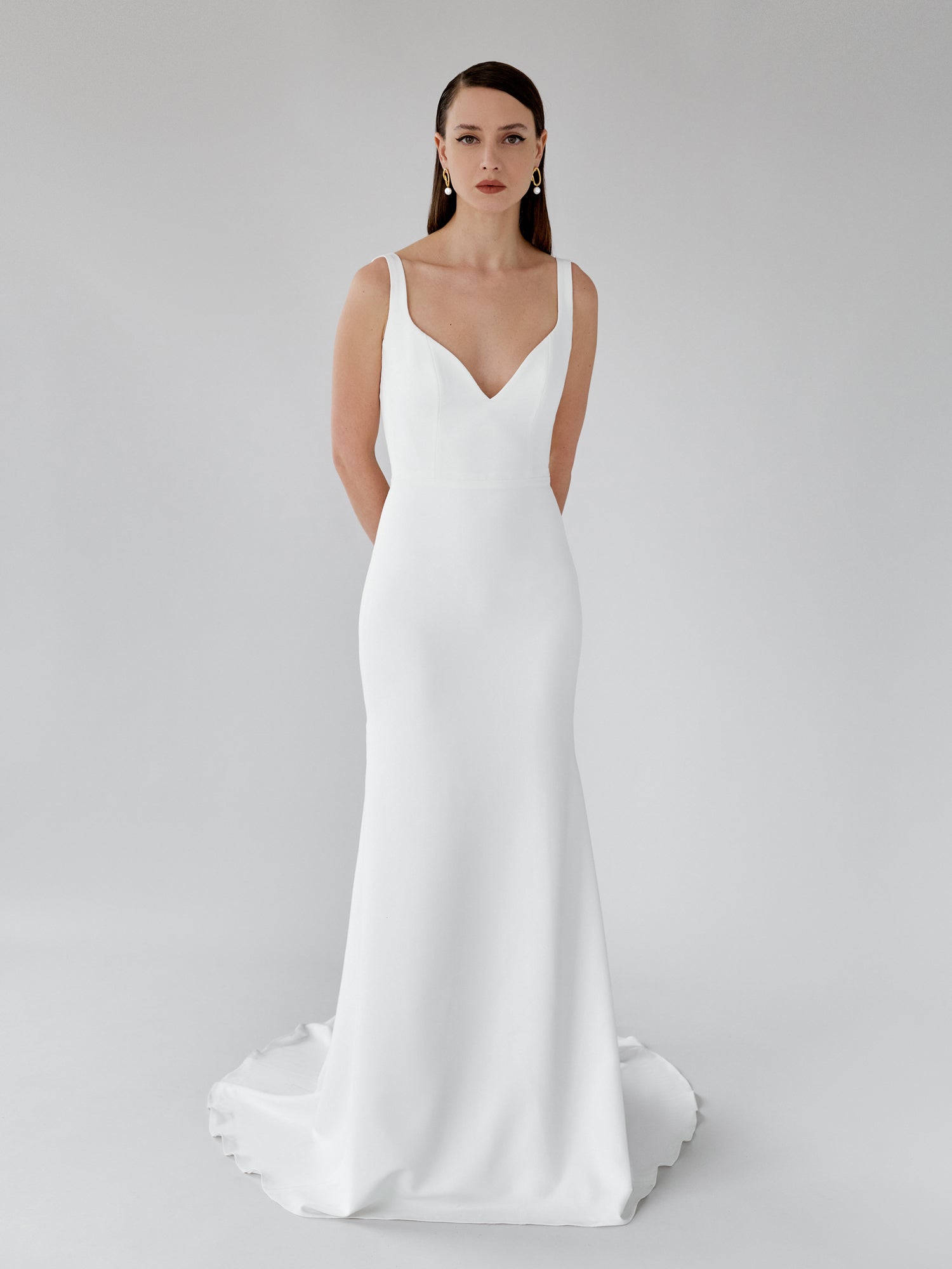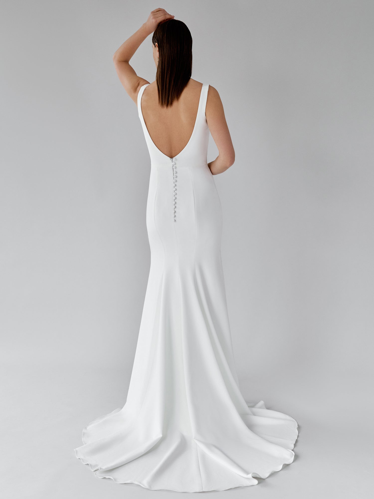 Marion is an elegant wedding gown featuring a wide V-neckline with 1-inch straps and a low scoop back finished with buttons. Made of crepe or satin, lined with Italian stretch lining, with a 65-inch modern mermaid skirt. Marion is designed to pair with all Aesling sleeves; click here to view the many options.