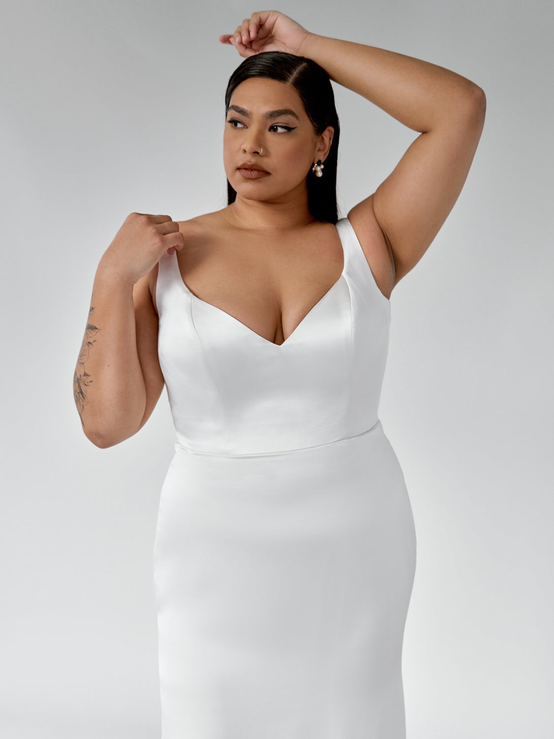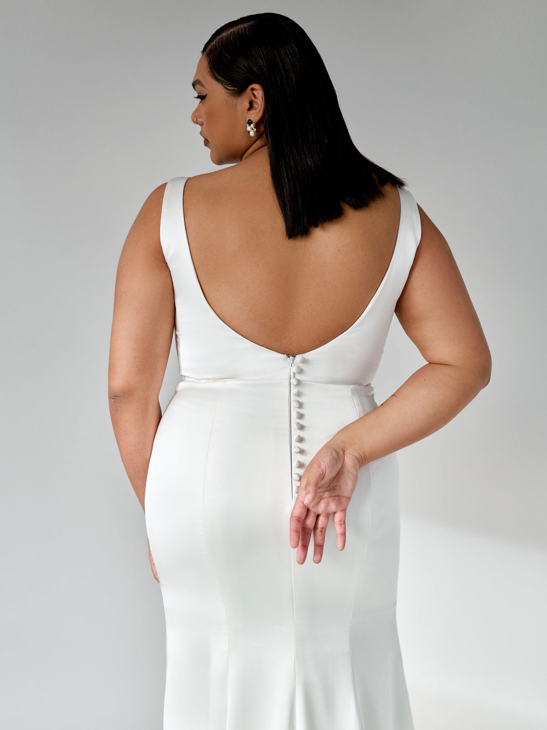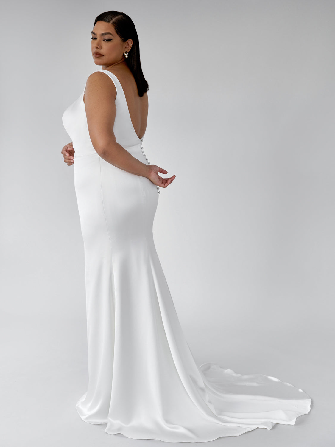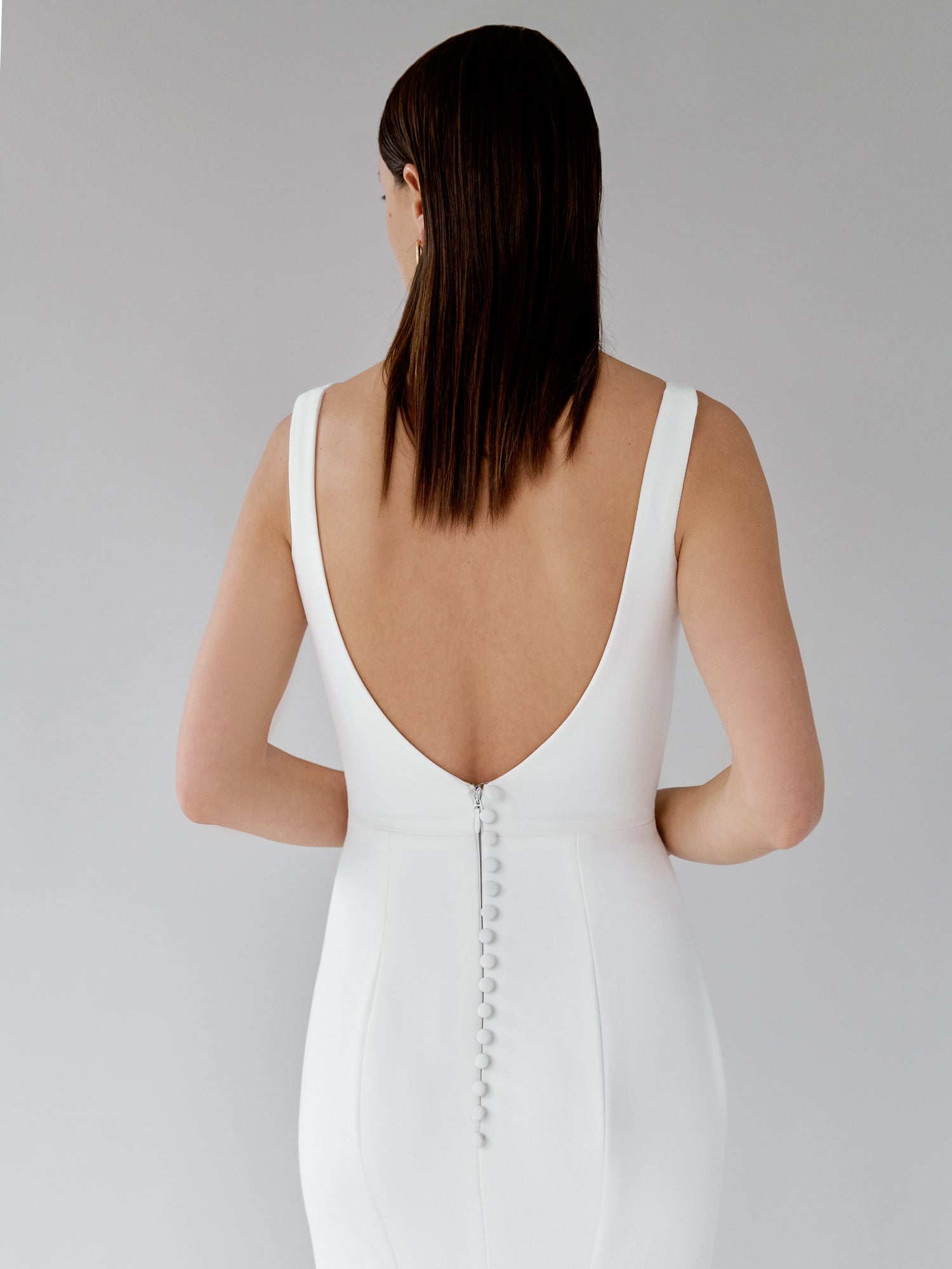 Marion is an elegant wedding gown featuring a wide V-neckline with 1-inch straps and a low scoop back finished with buttons. Made of crepe or satin, lined with Italian stretch lining, with a 65-inch modern mermaid skirt. Marion is designed to pair with all Aesling sleeves; click here to view the many options.