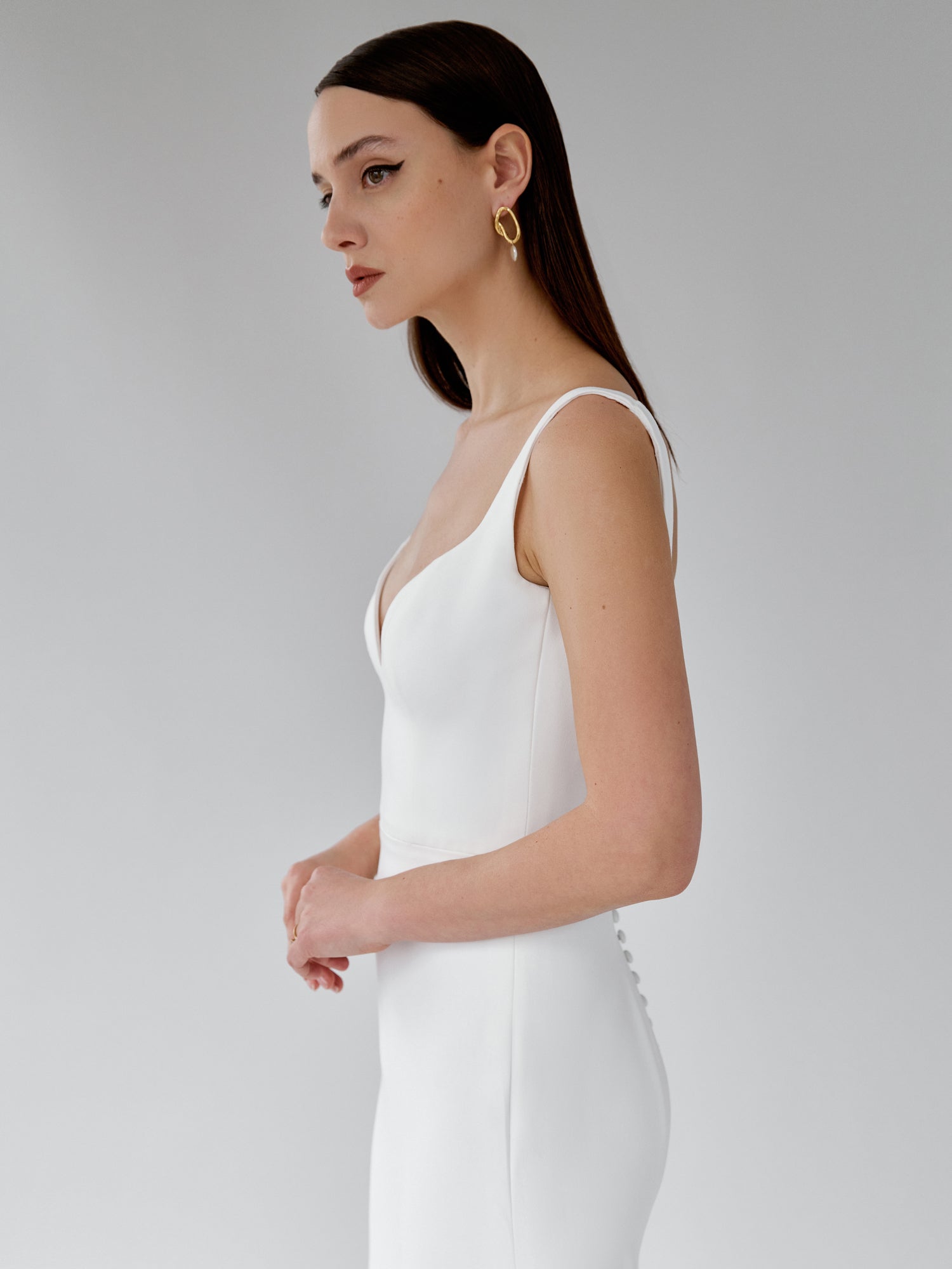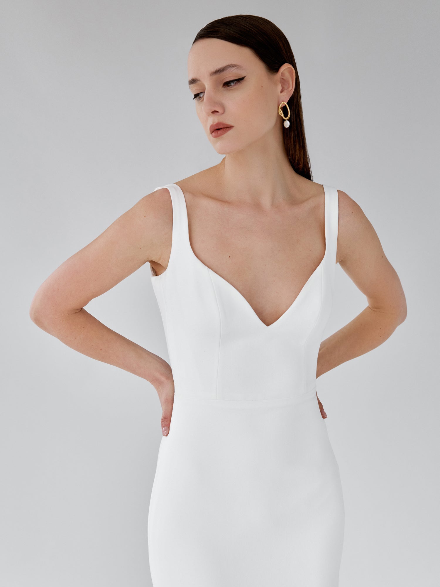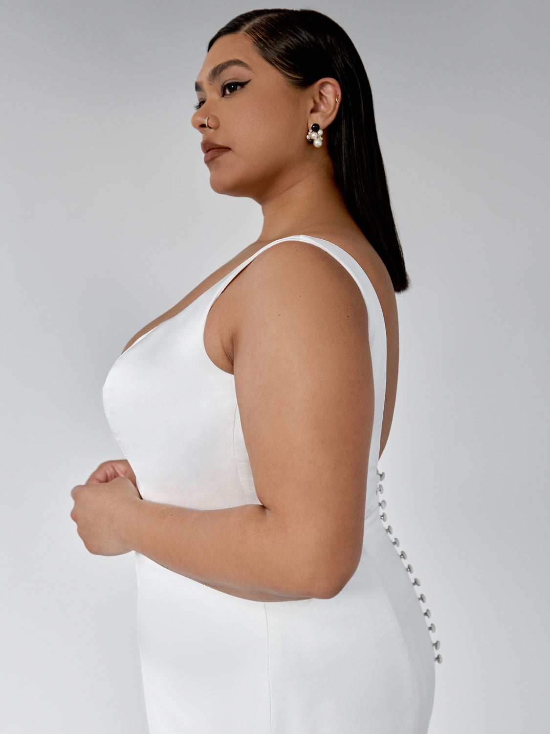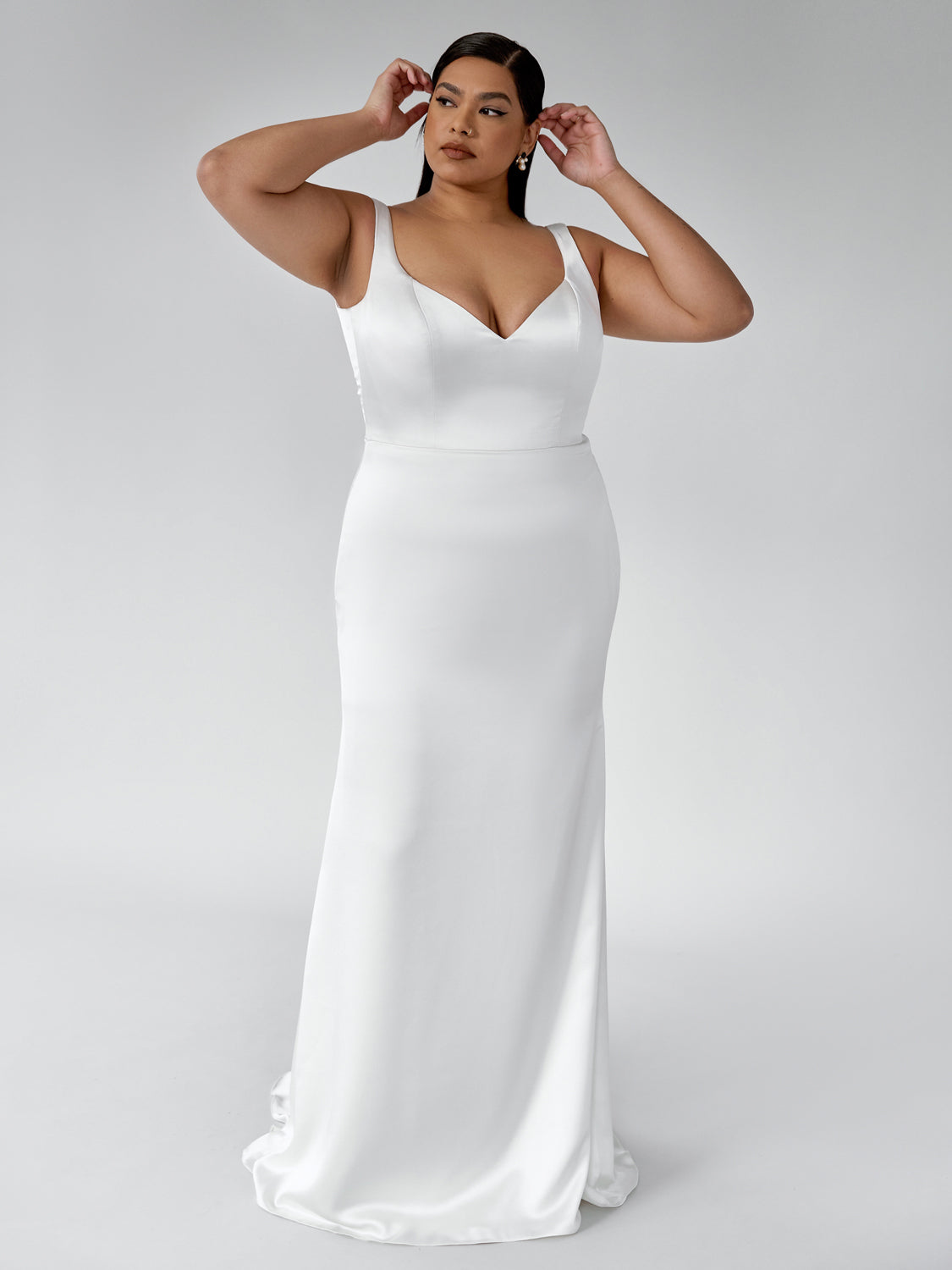 Marion is an elegant wedding gown featuring a wide V-neckline with 1-inch straps and a low scoop back finished with buttons. Made of crepe or satin, lined with Italian stretch lining, with a 65-inch modern mermaid skirt. Marion is designed to pair with all Aesling sleeves; click here to view the many options.