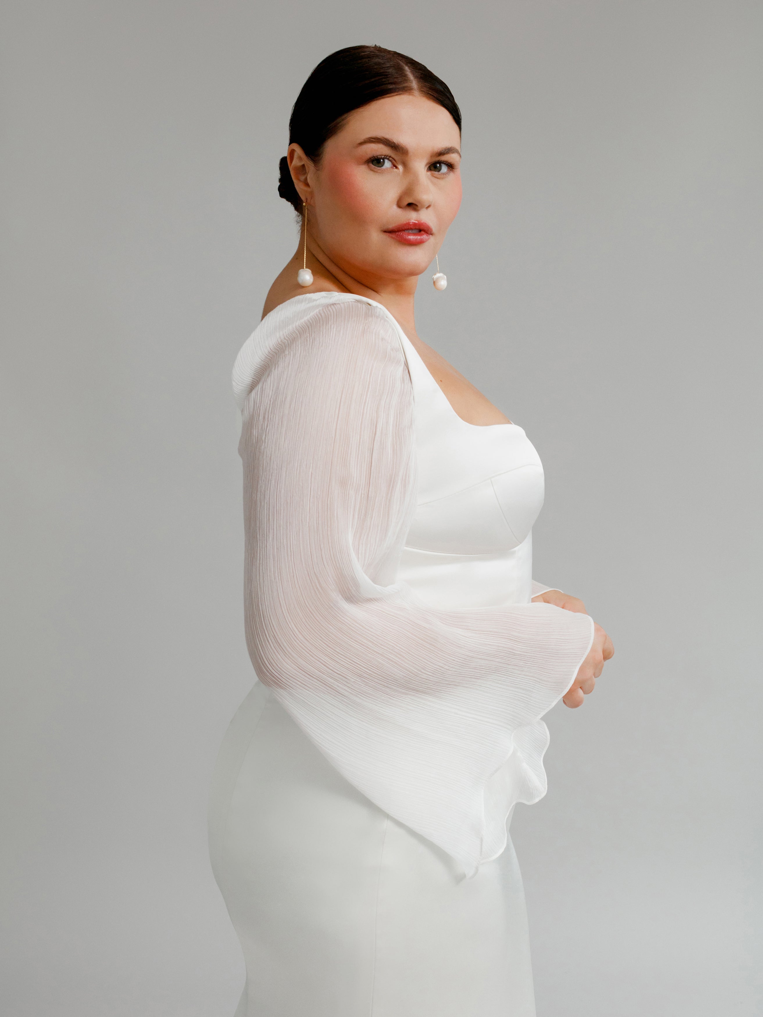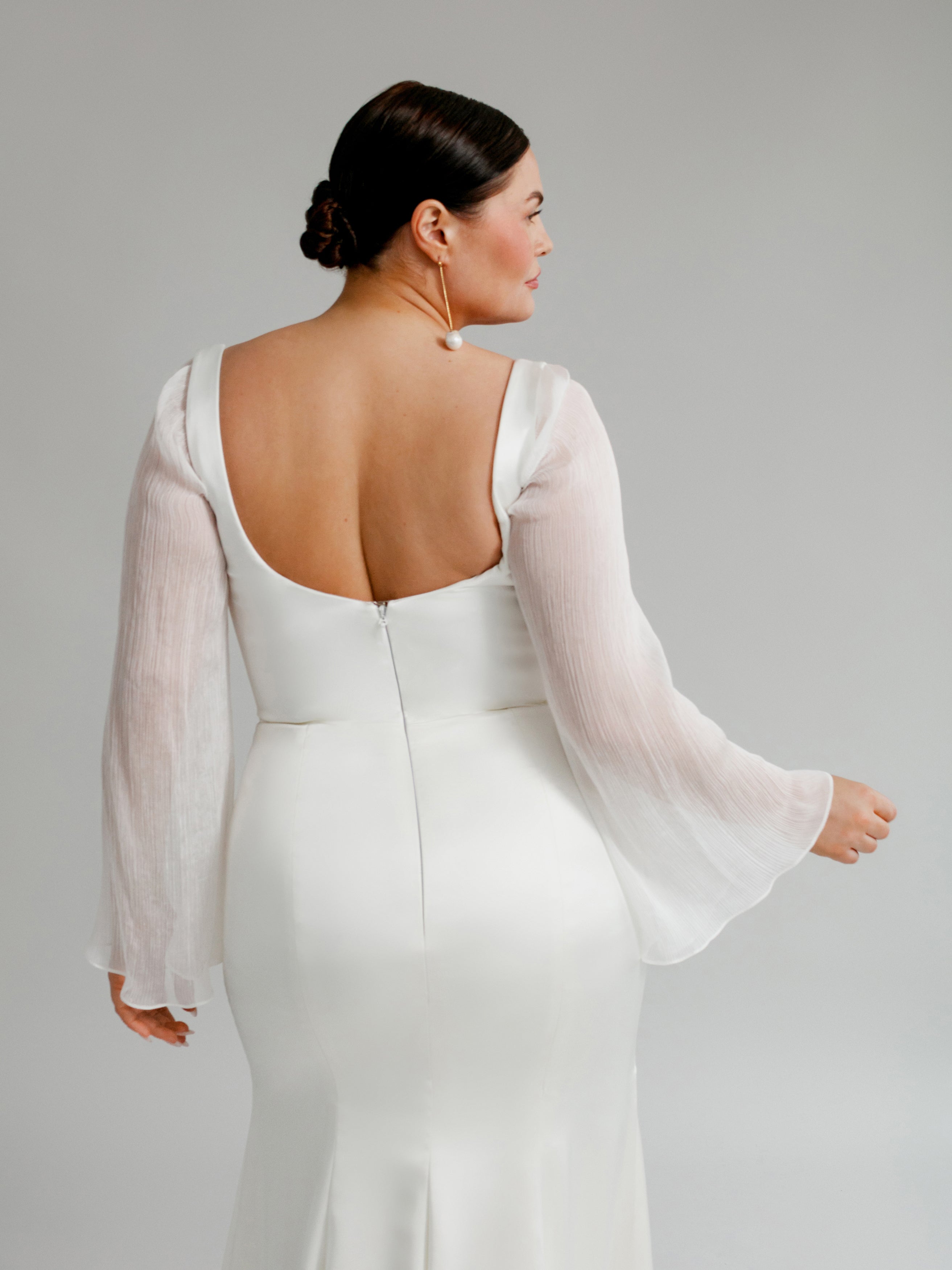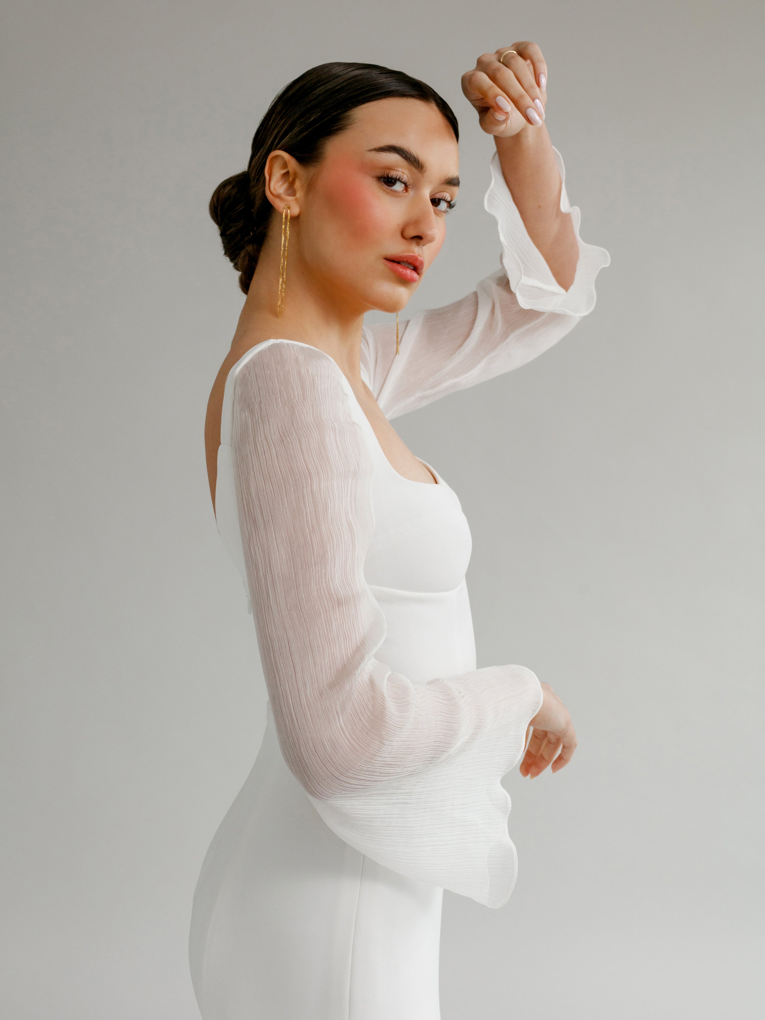 A statement bell sleeve made from fine creponne chiffon. Made with bound shoulder seams and comes with clear snaps. Made to pair with many Aesling styles, including Angelica, Adrian, Morgan, Willis, and Marion. Pictured on Angelica.