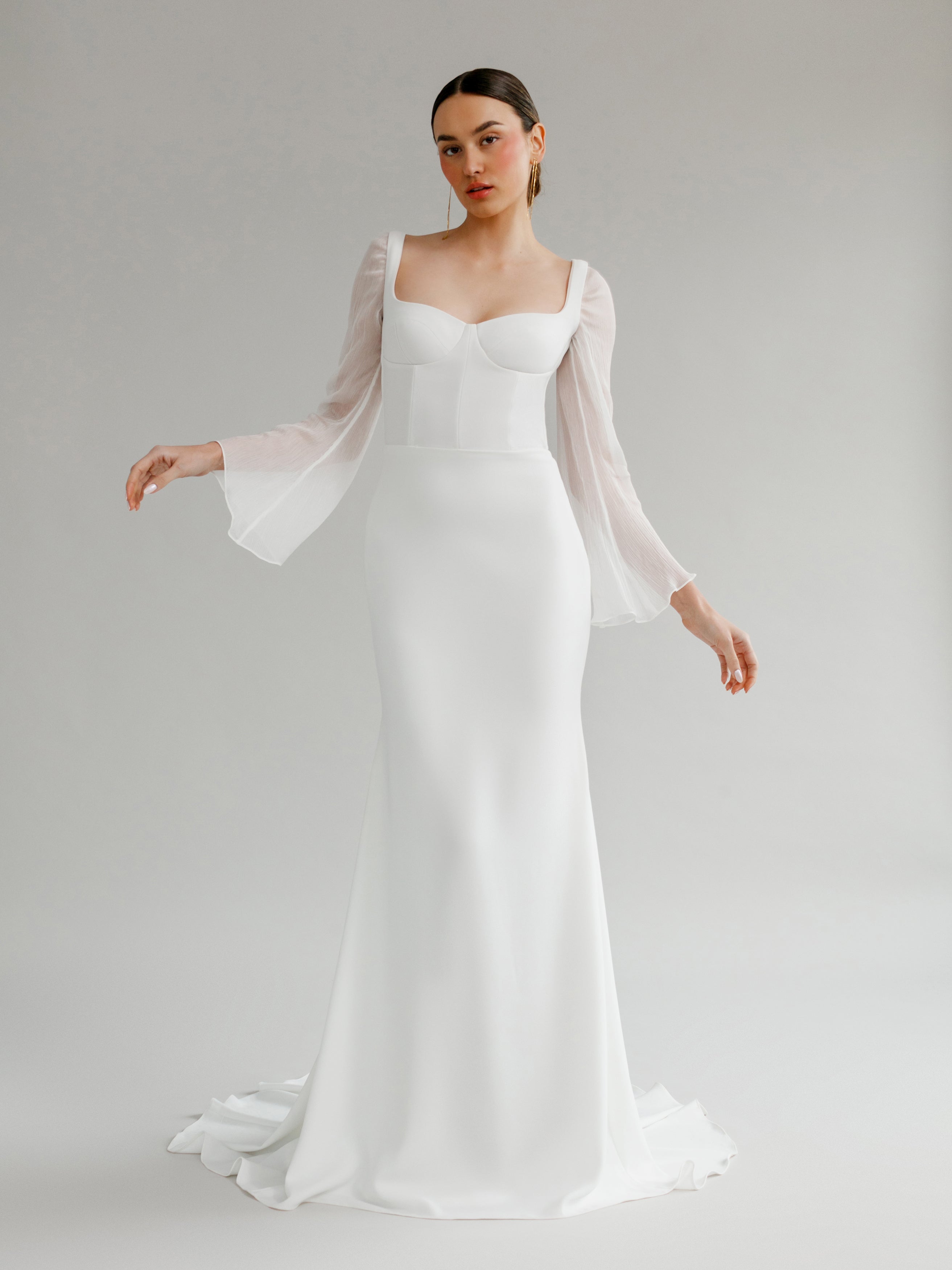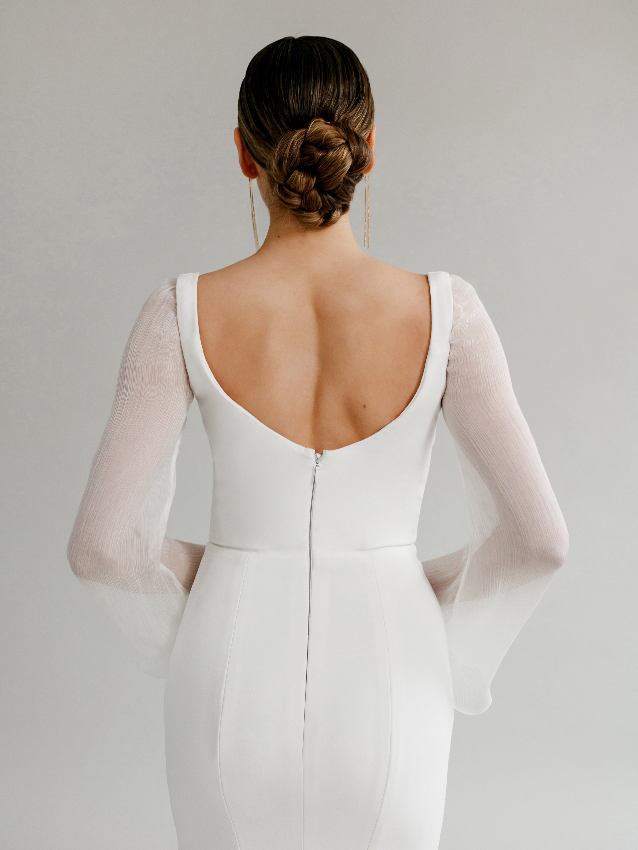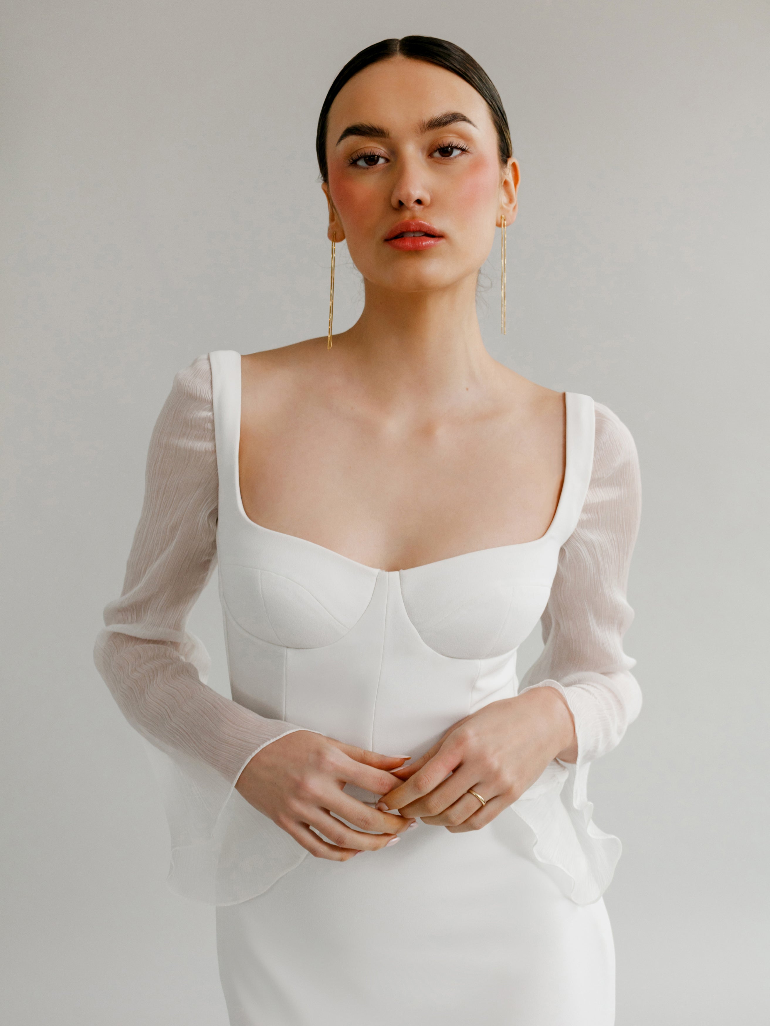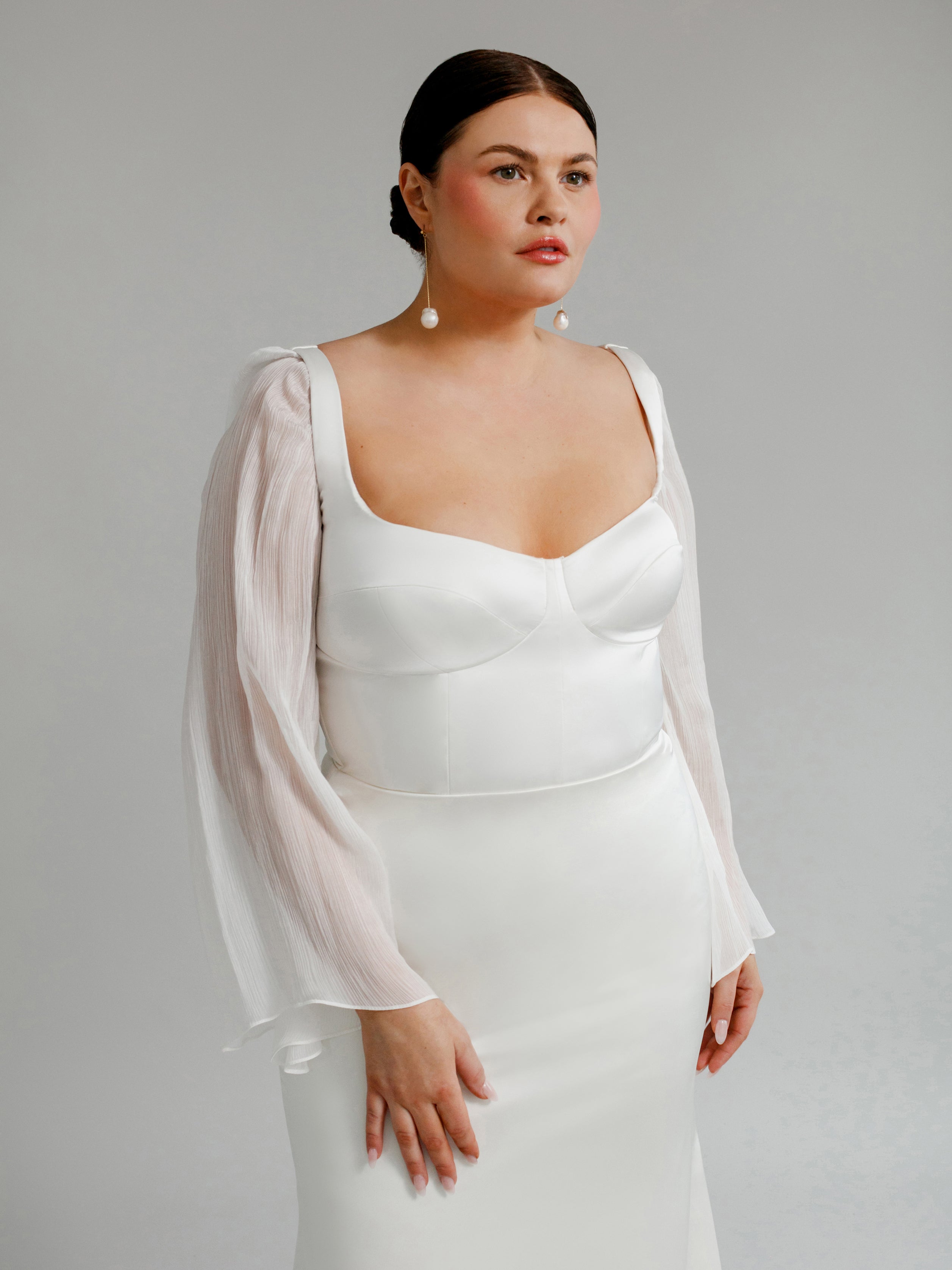 A statement bell sleeve made from fine creponne chiffon. Made with bound shoulder seams and comes with clear snaps. Made to pair with many Aesling styles, including Angelica, Adrian, Morgan, Willis, and Marion. Pictured on Angelica.