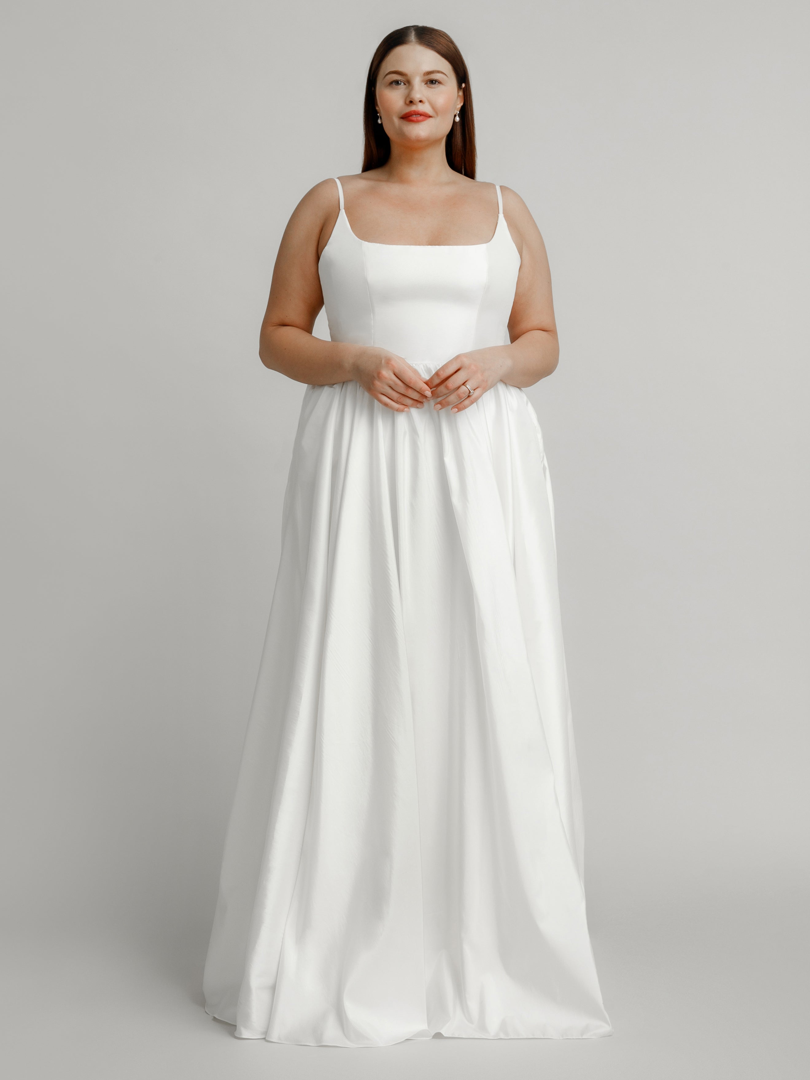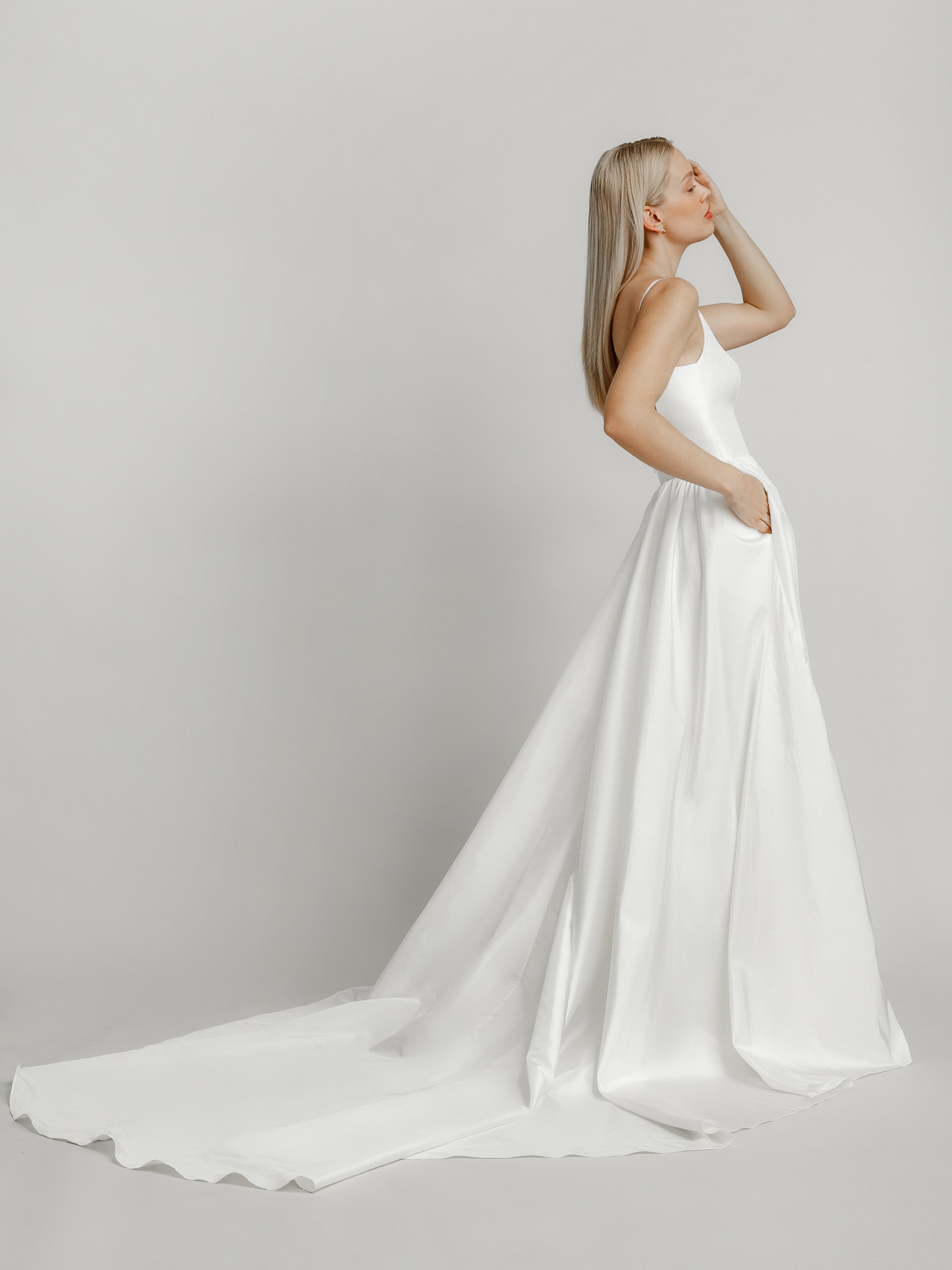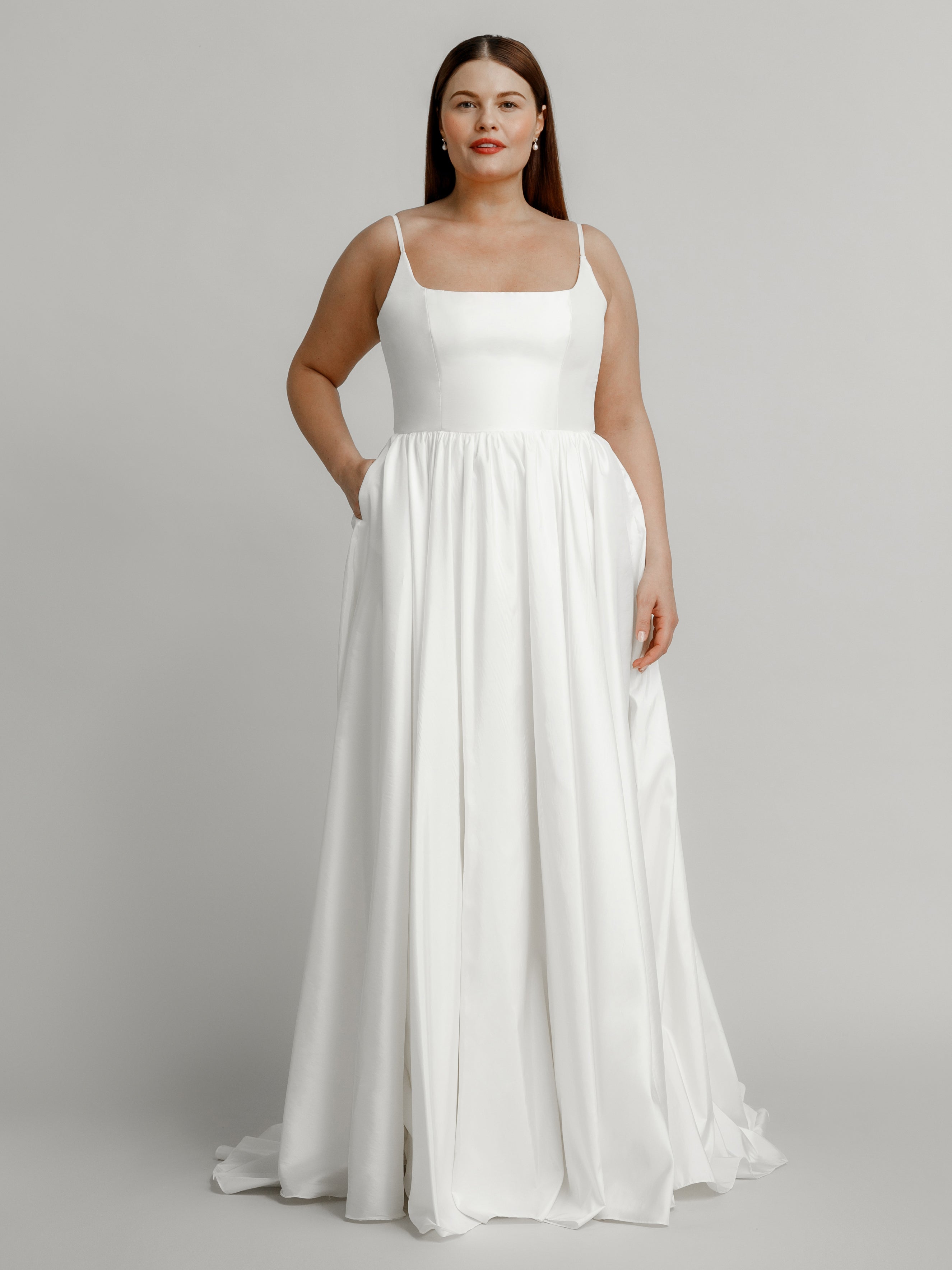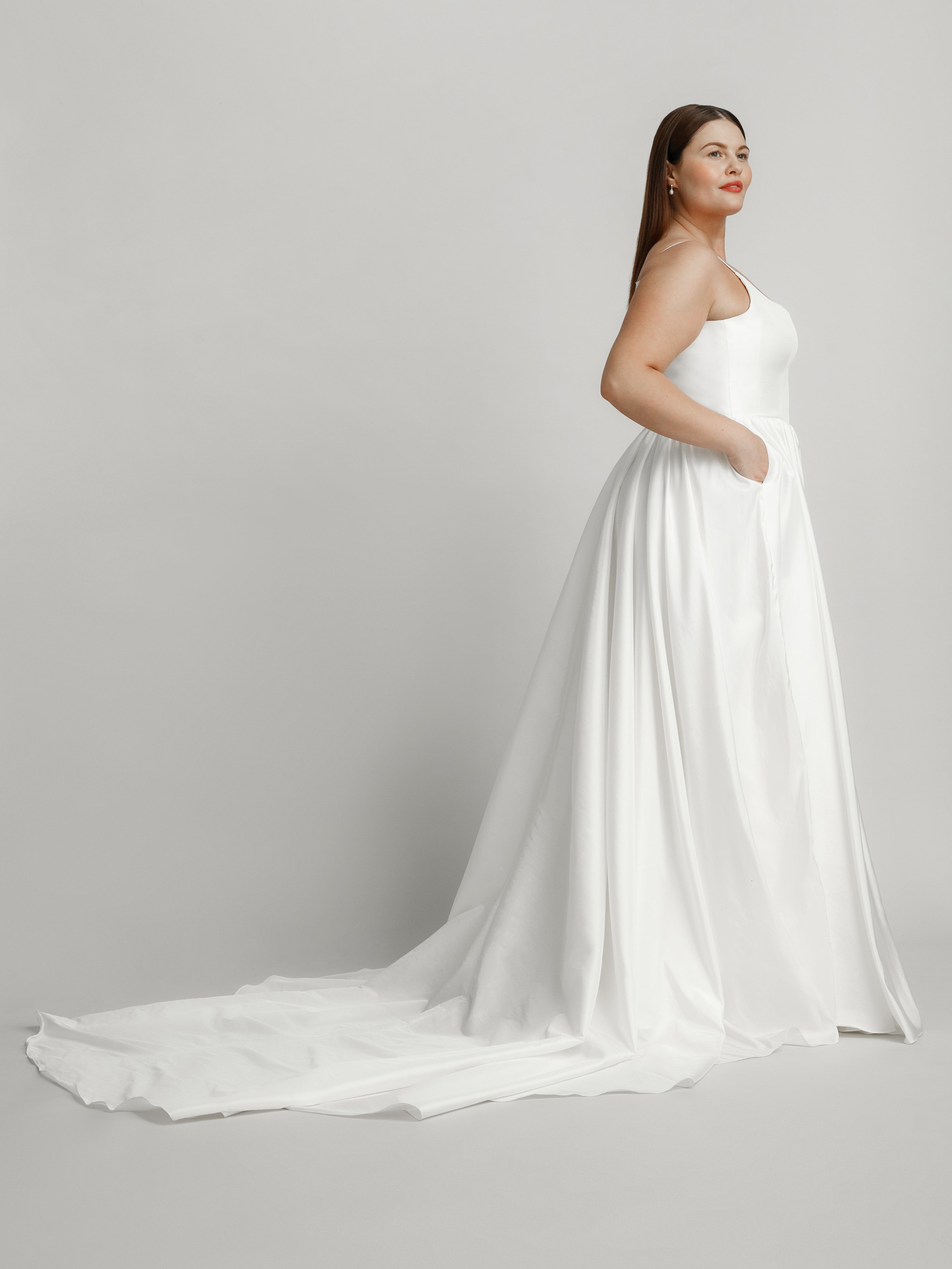 Amelie’s square neck bodice is made modern with subtly rounded corners and barely there straps. The skirt has an 80" train and pockets. Amelie is the chic silhouette you deserve to look and feel your best. This style is available in original classic taffeta, liquid satin, or pleated taffeta. To view this style with a basque waist, click here.