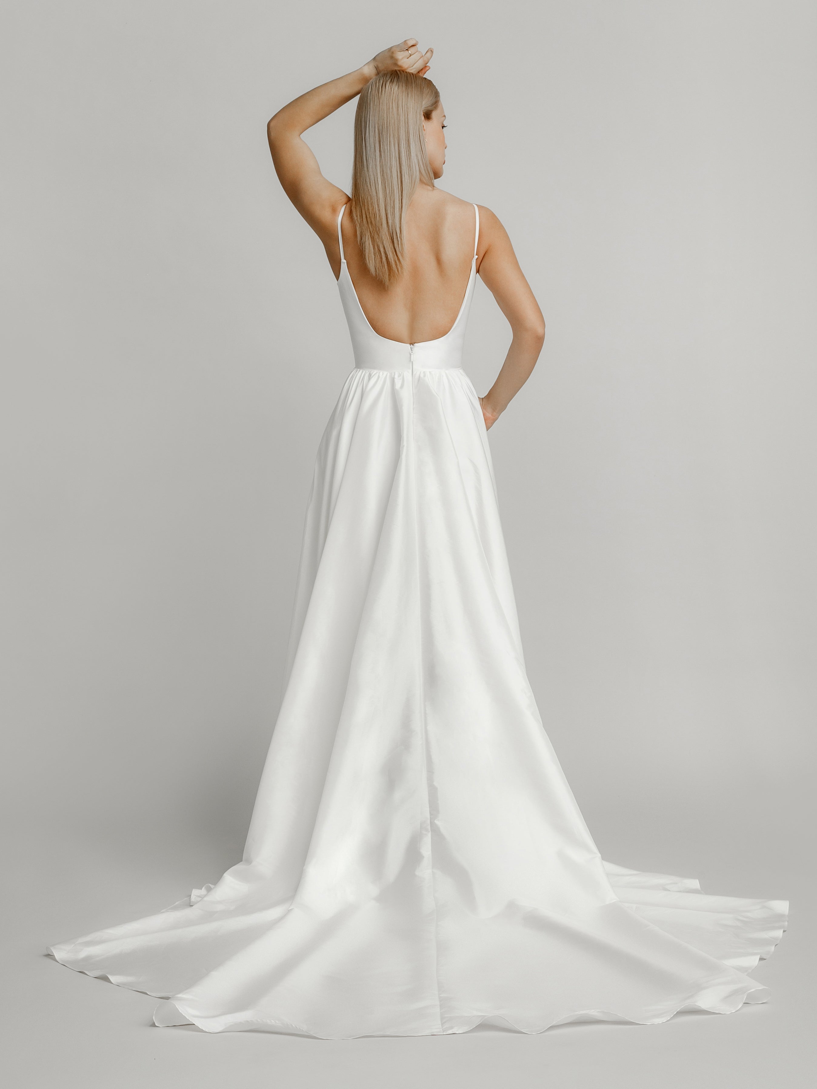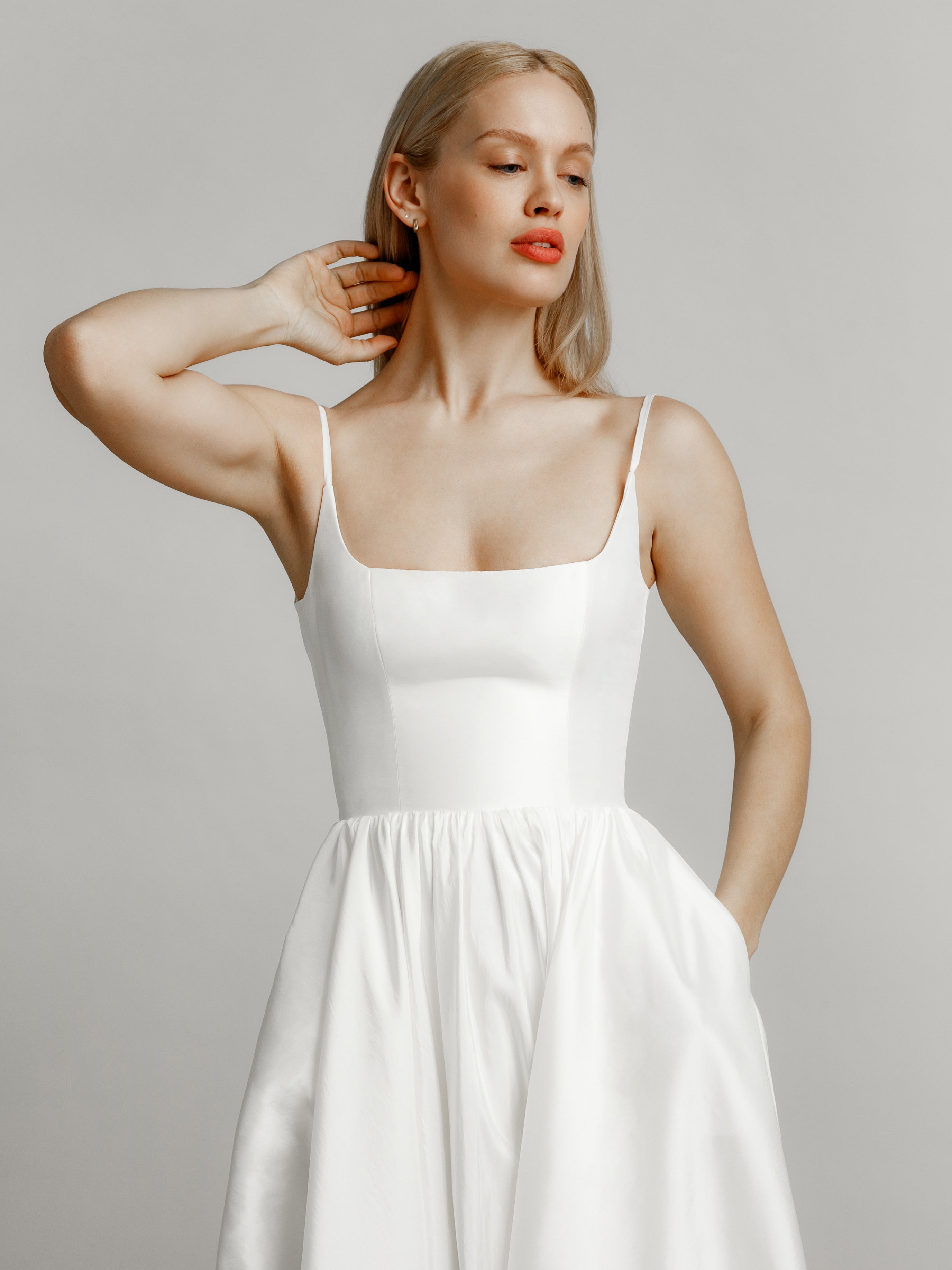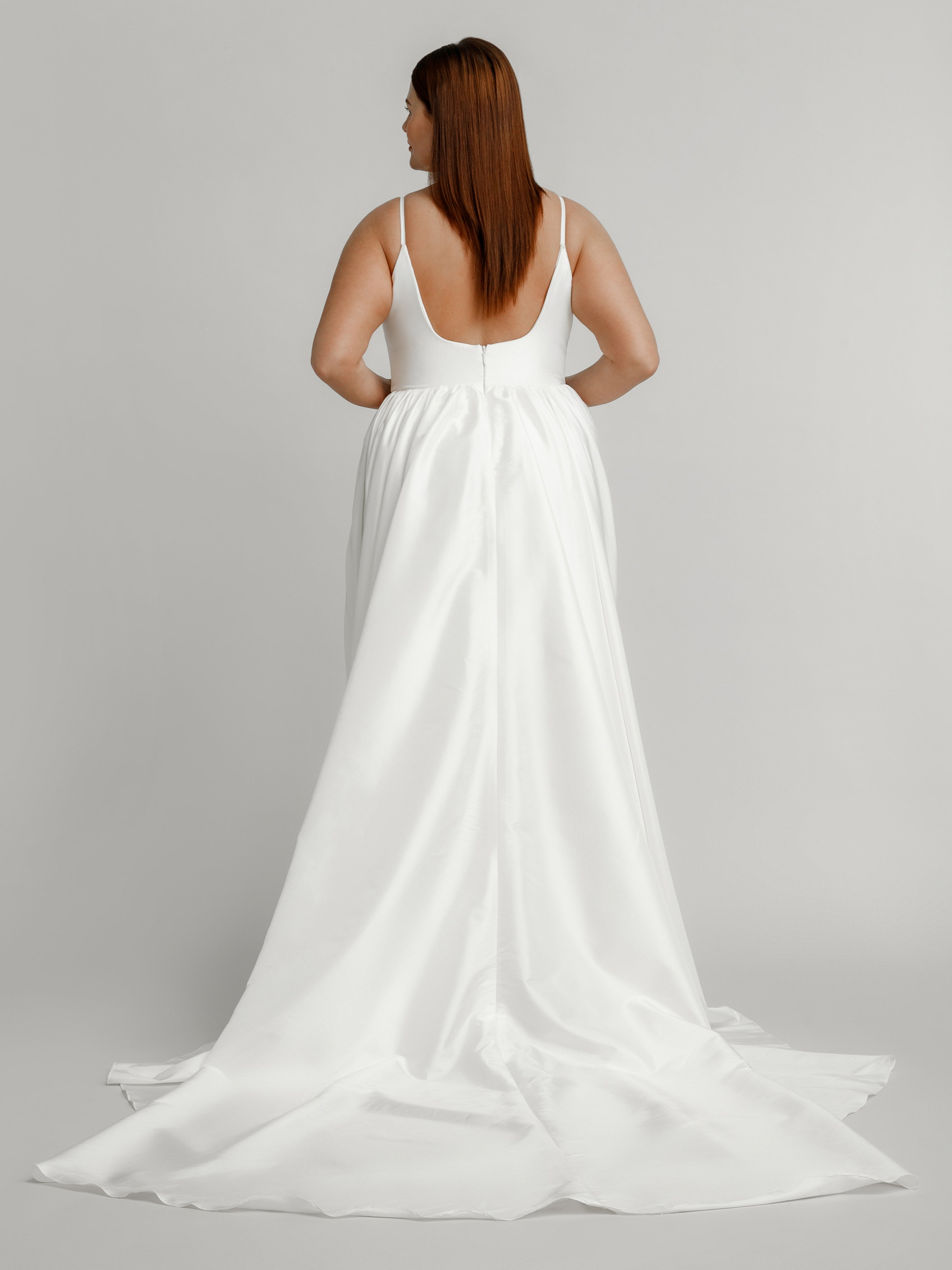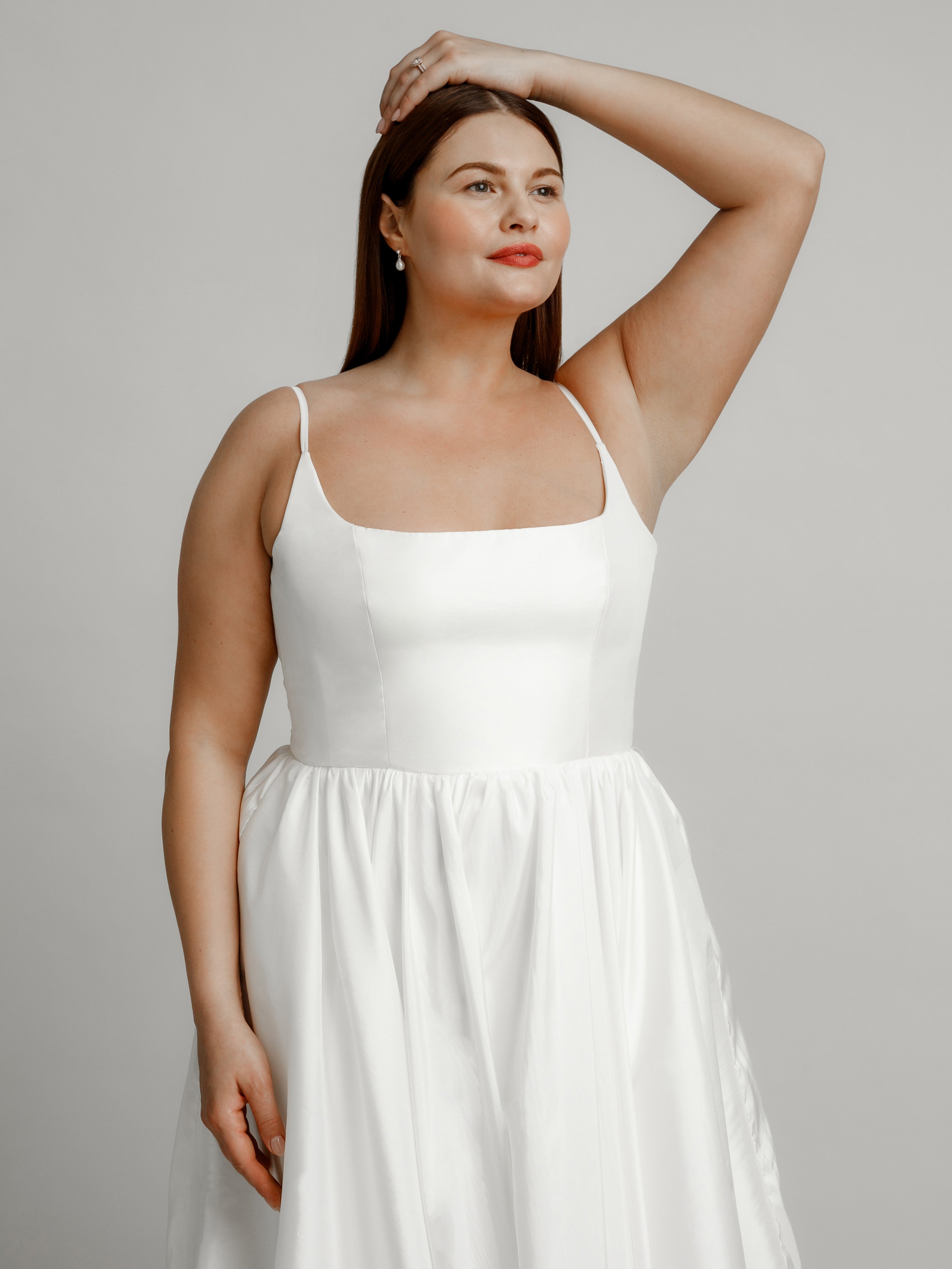 Amelie’s square neck bodice is made modern with subtly rounded corners and barely there straps. The skirt has an 80" train and pockets. Amelie is the chic silhouette you deserve to look and feel your best. This style is available in original classic taffeta, liquid satin, or pleated taffeta. To view this style with a basque waist, click here.