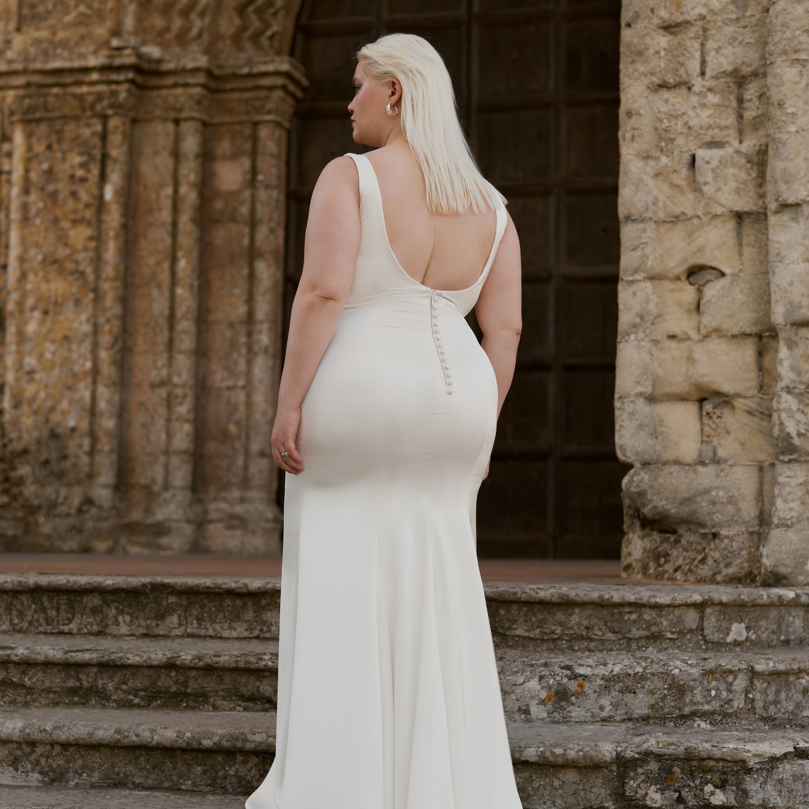 Marion is an elegant wedding gown featuring a wide V-neckline with 1-inch straps and a low scoop back finished with buttons. Made of crepe or satin, lined with Italian stretch lining, with a 65-inch modern mermaid skirt. Marion is designed to pair with all Aesling sleeves; click here to view the many options.