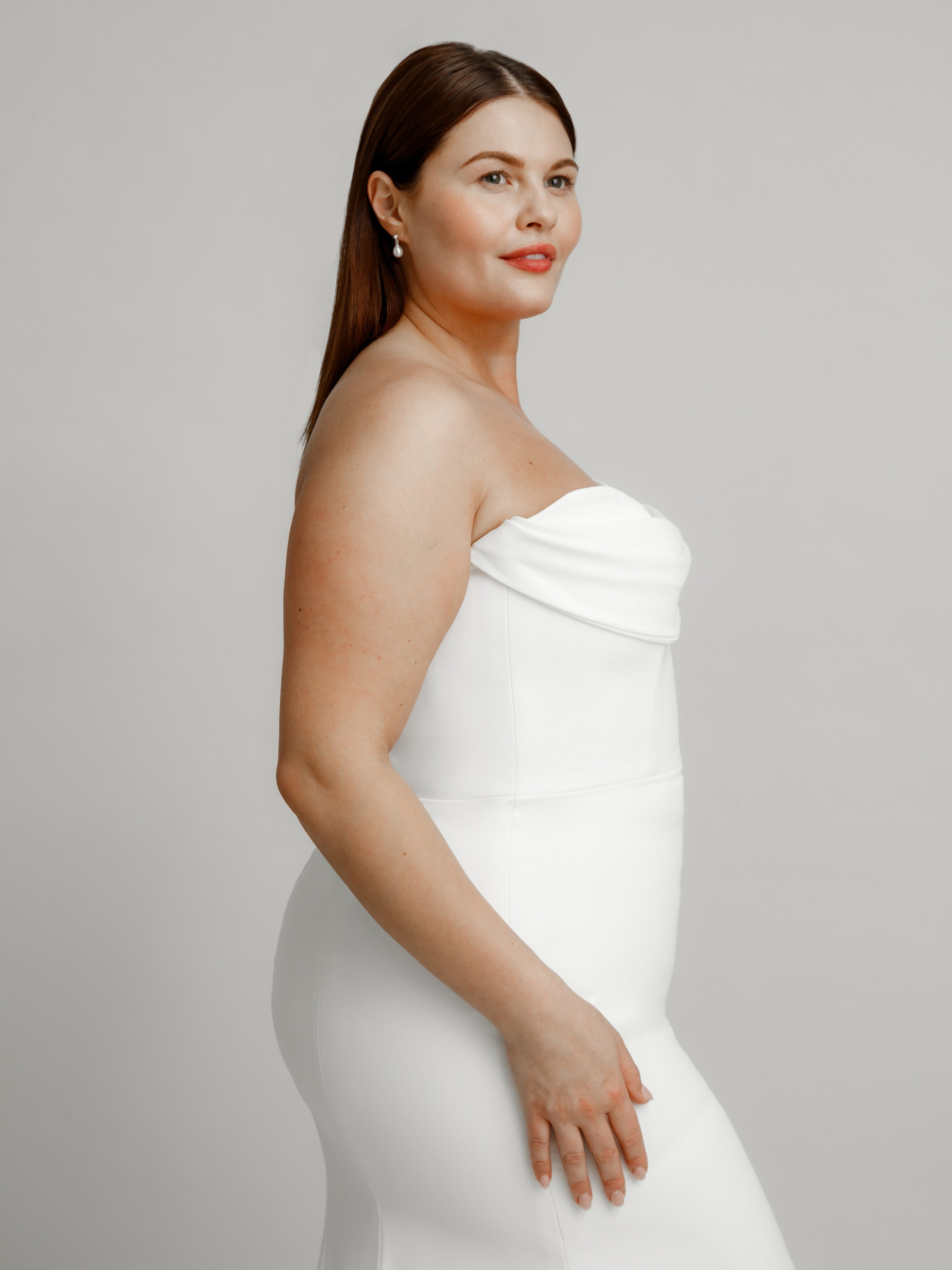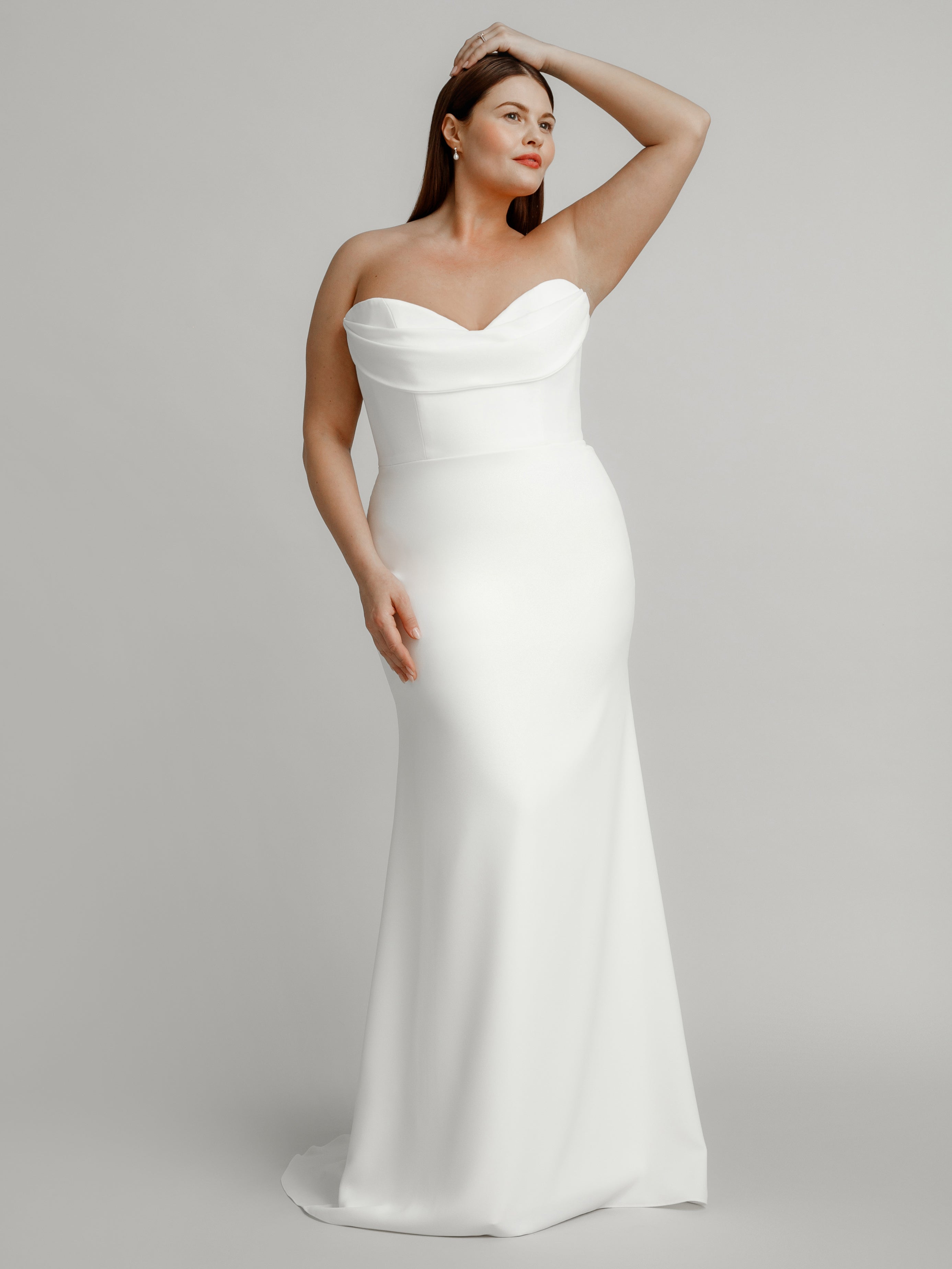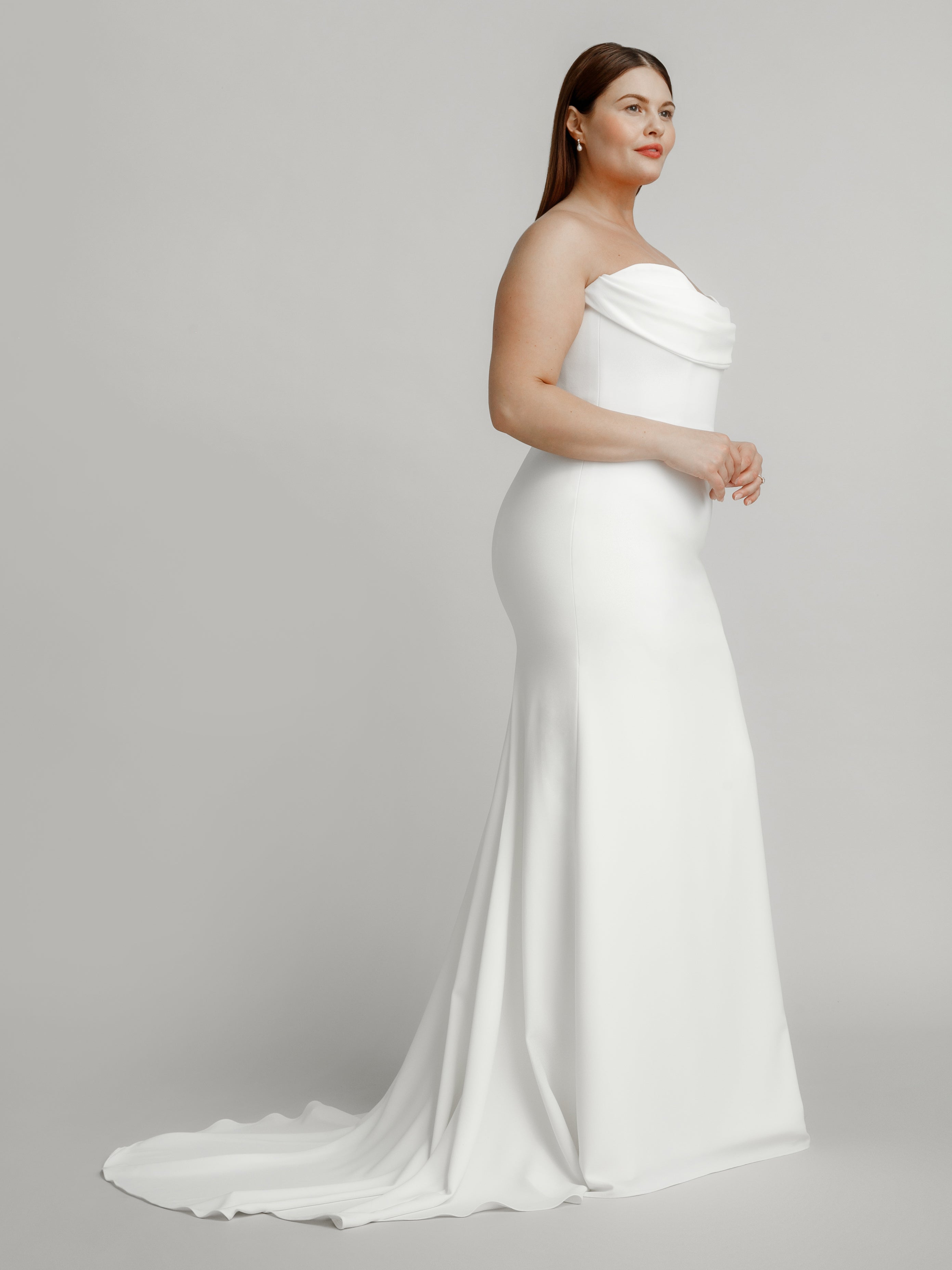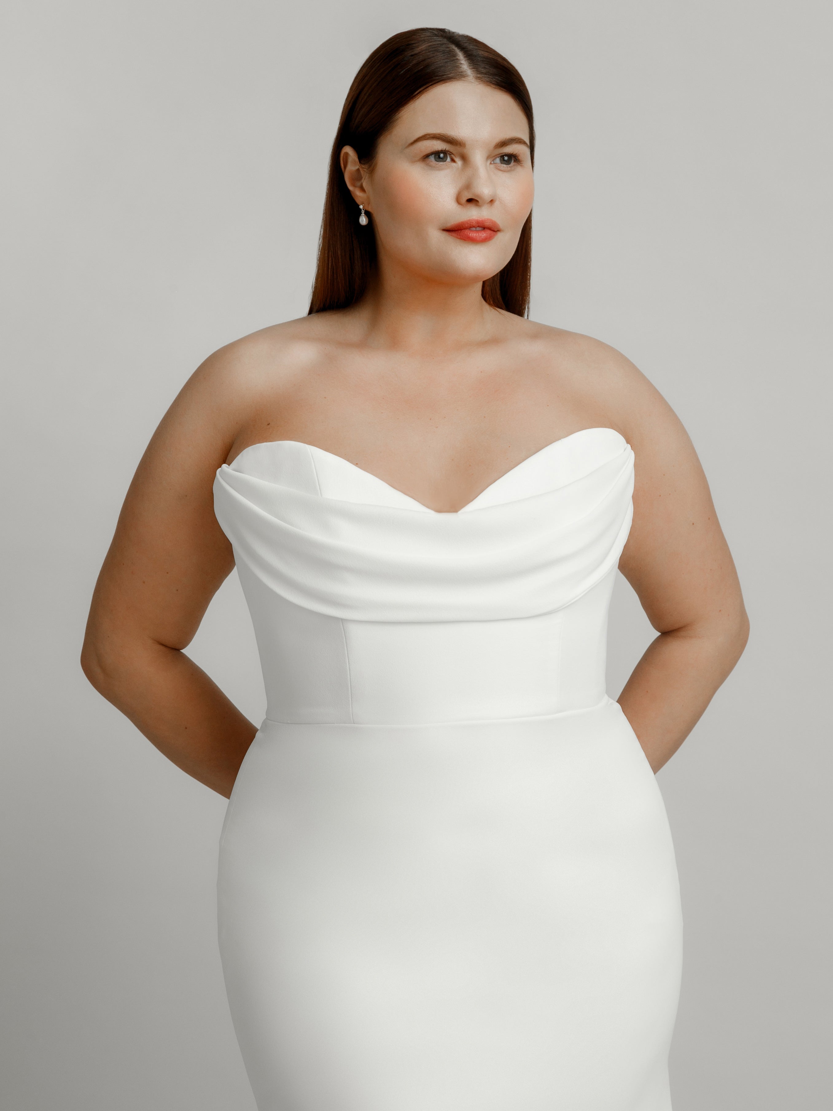 Venus is elegance in a clean, feminine silhouette. The flattering sweetheart neckline frames the collarbones while the cowl detailing and fabric — textured satin, liquid satin, or crepe — keep this classic bodice feeling contemporary and fresh. Venus is finished with a modern mermaid skirt and 65" train, and is lined in off-white midori. Our straight size model wears Venus in textured satin, and our curve model wears crepe.