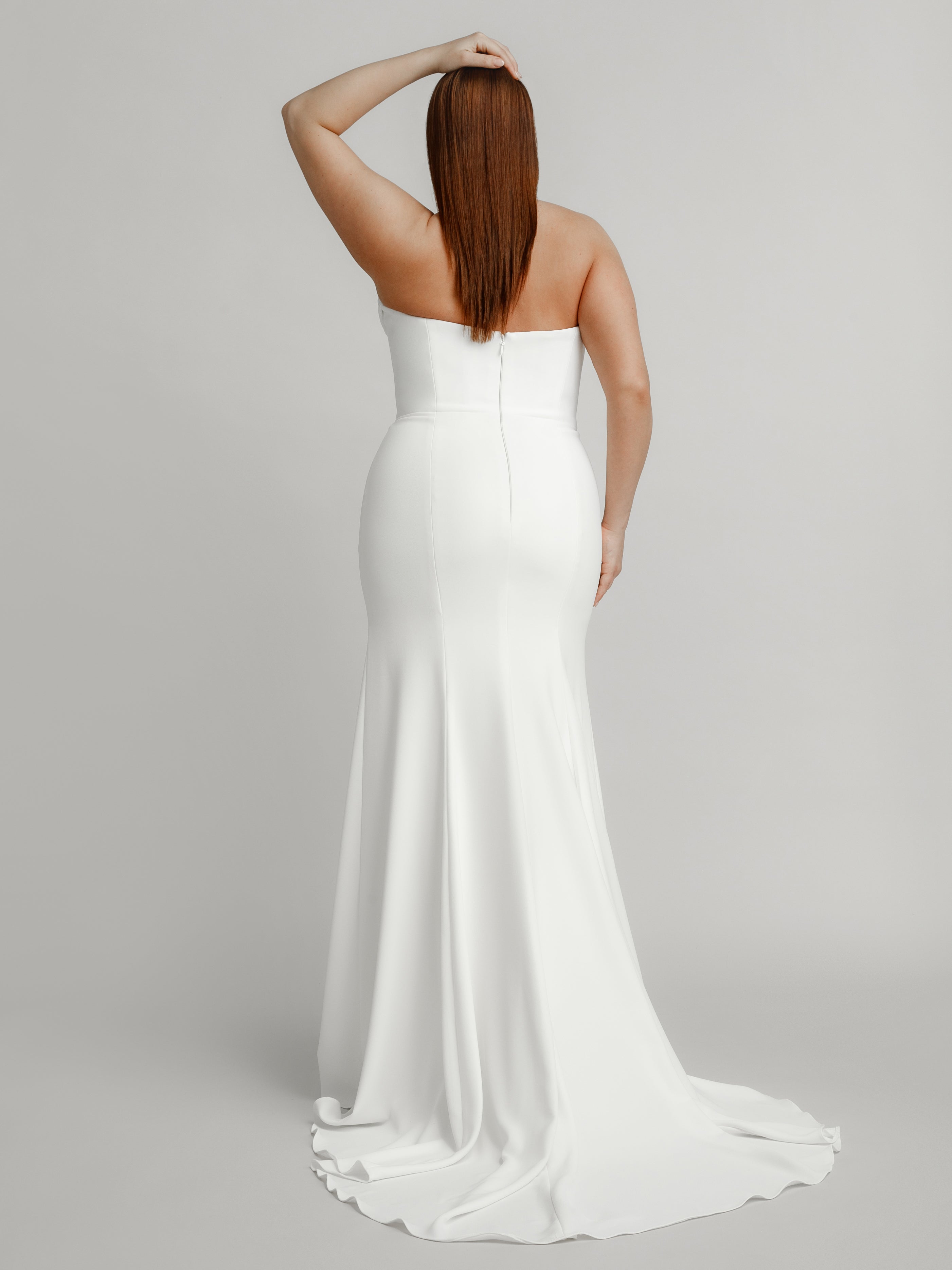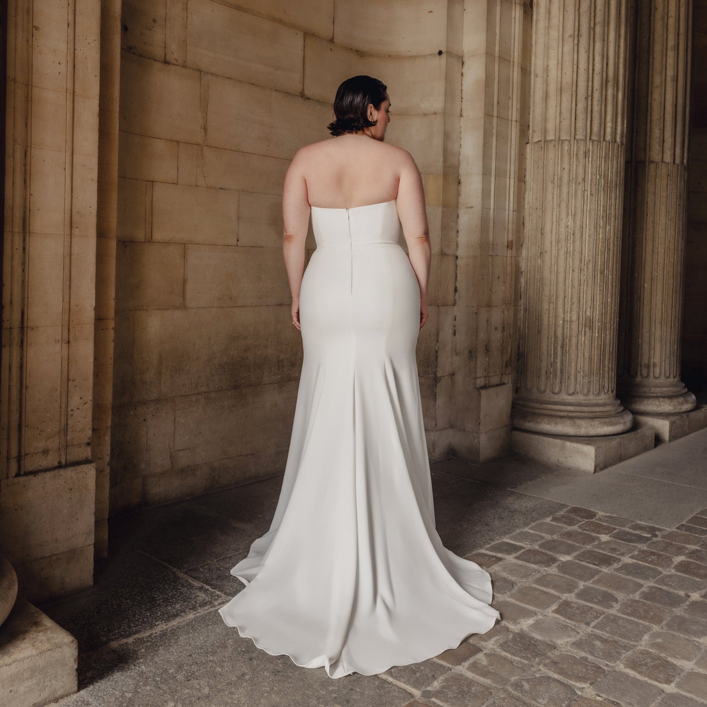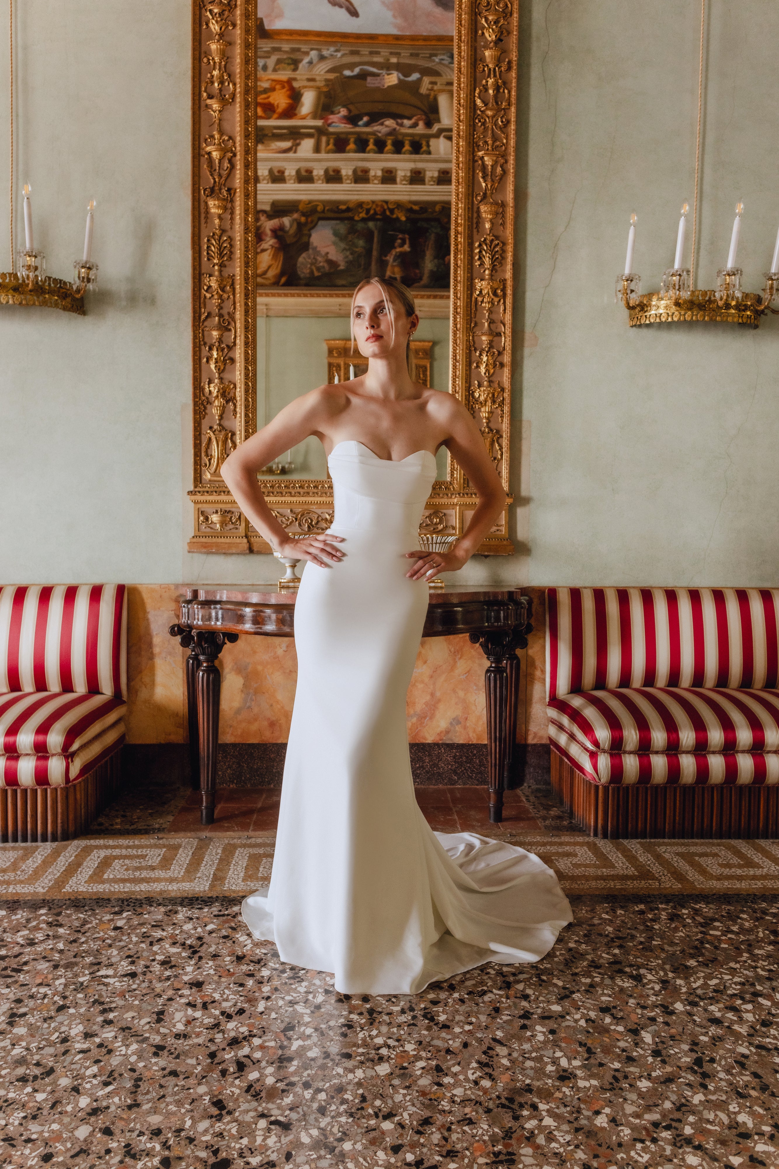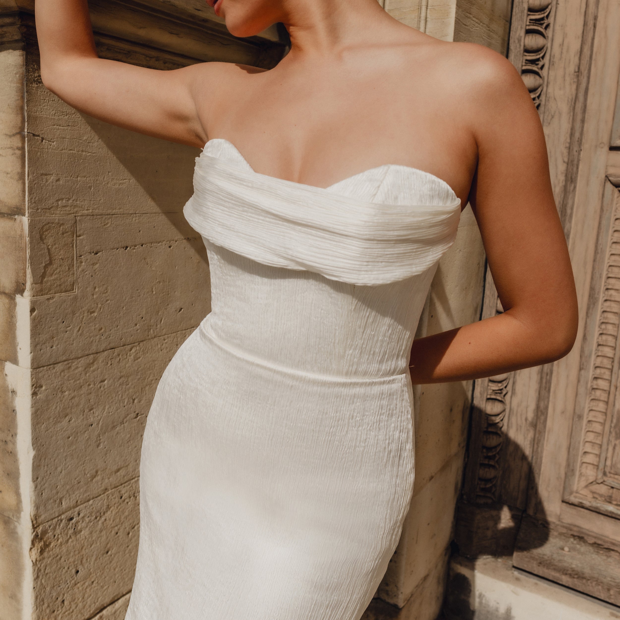 Venus is elegance in a clean, feminine silhouette. The flattering sweetheart neckline frames the collarbones while the cowl detailing and fabric — textured satin, liquid satin, or crepe — keep this classic bodice feeling contemporary and fresh. Venus is finished with a modern mermaid skirt and 65" train, and is lined in off-white midori. Our straight size model wears Venus in textured satin, and our curve model wears crepe.