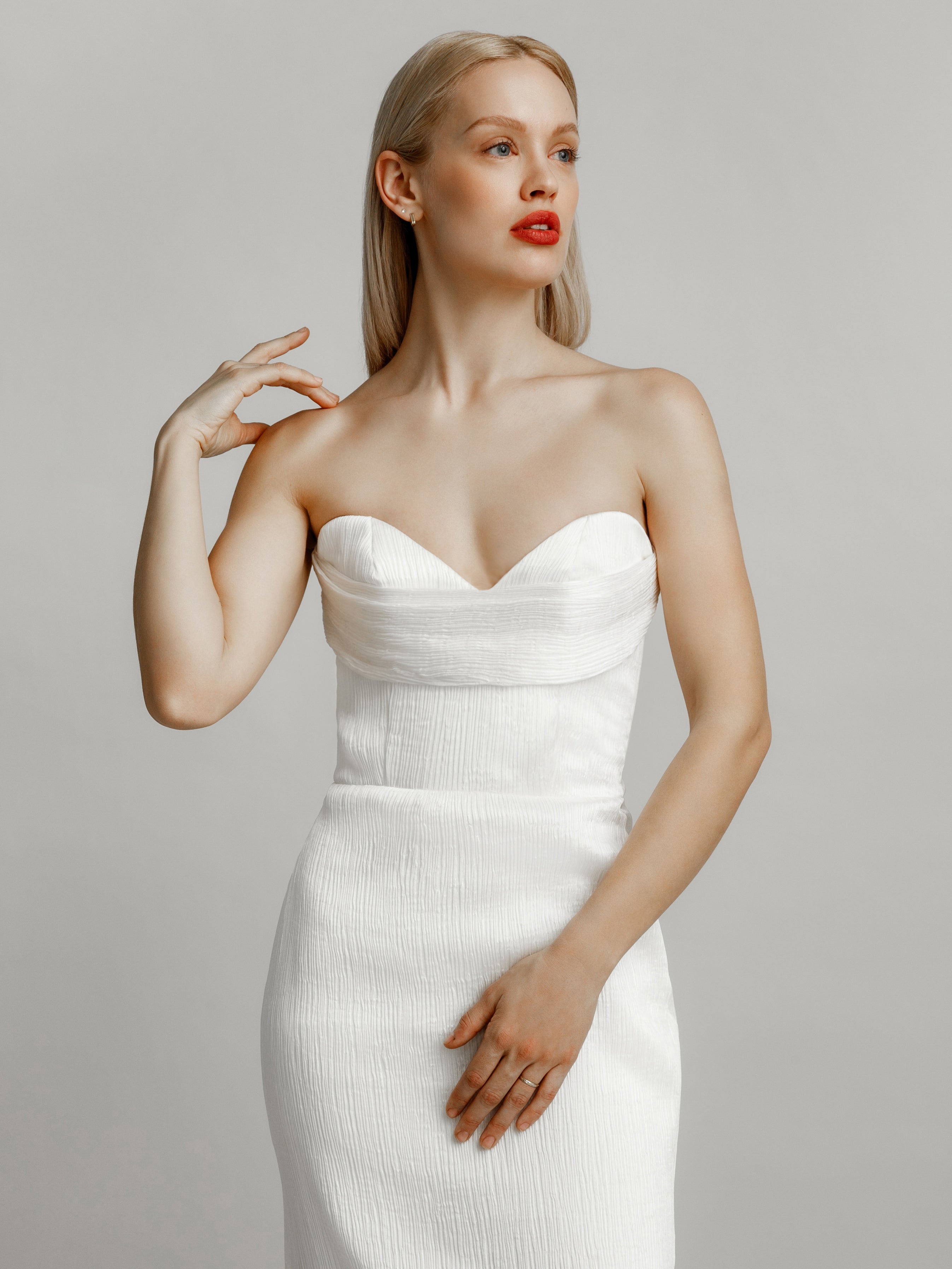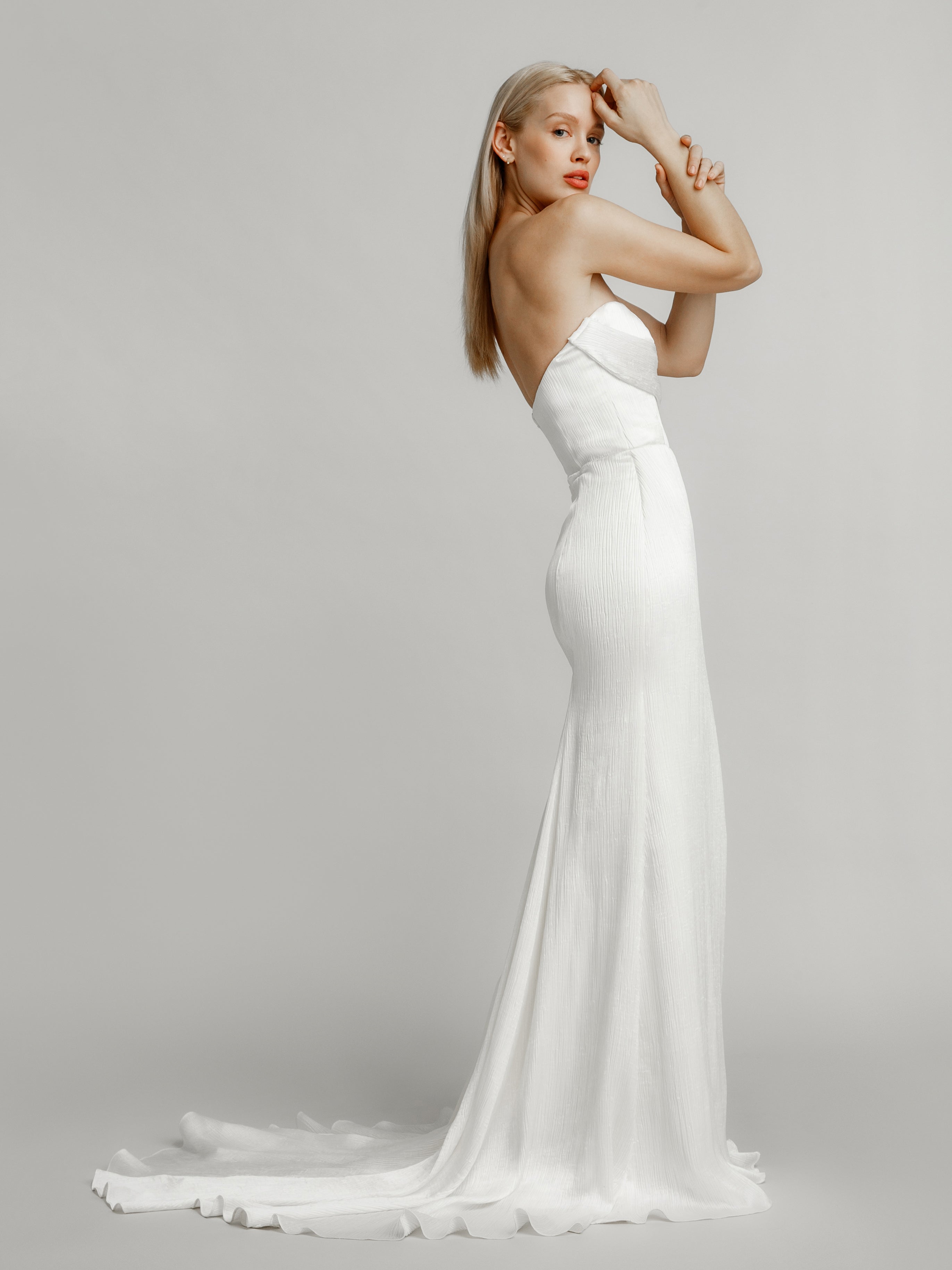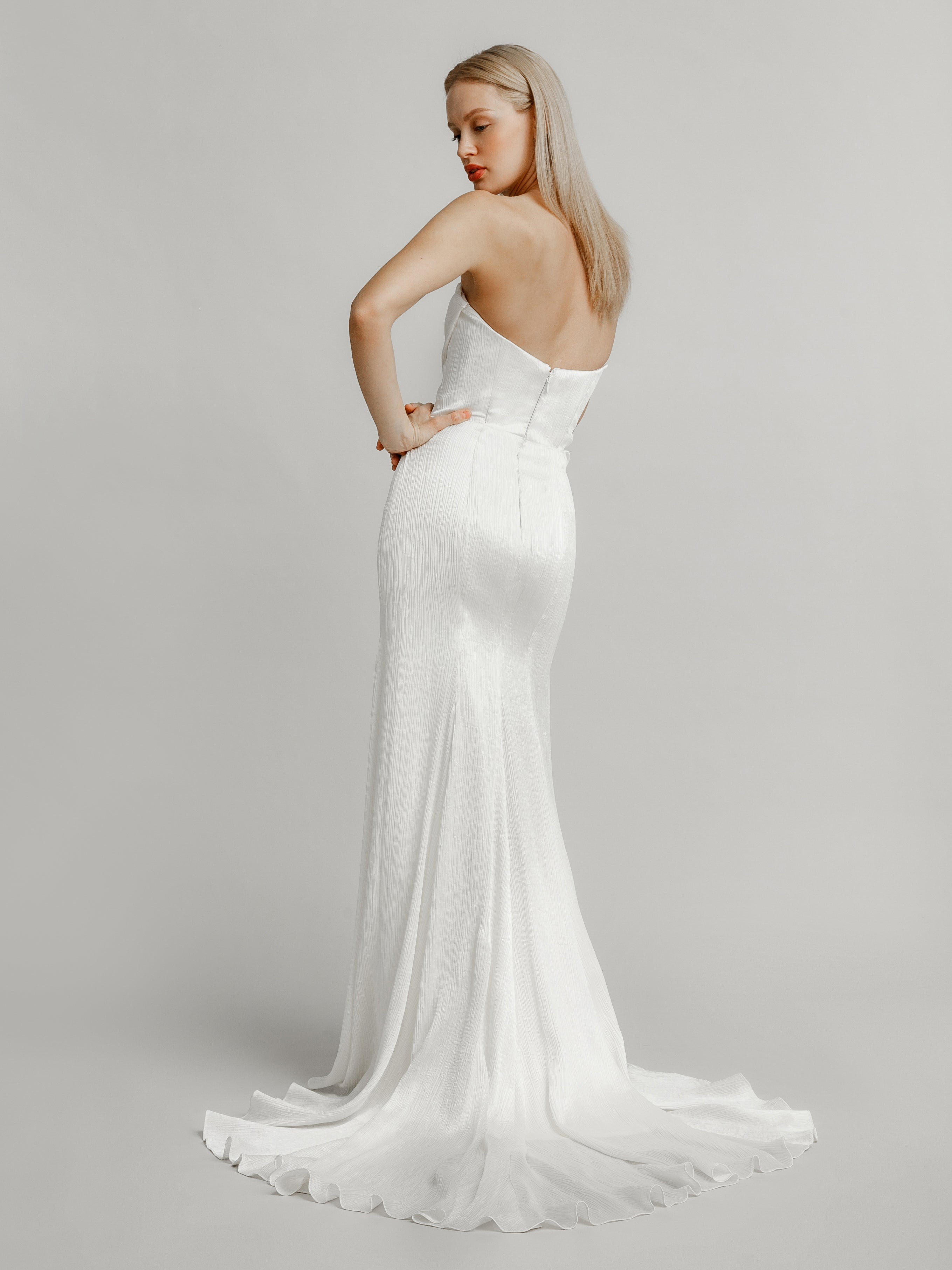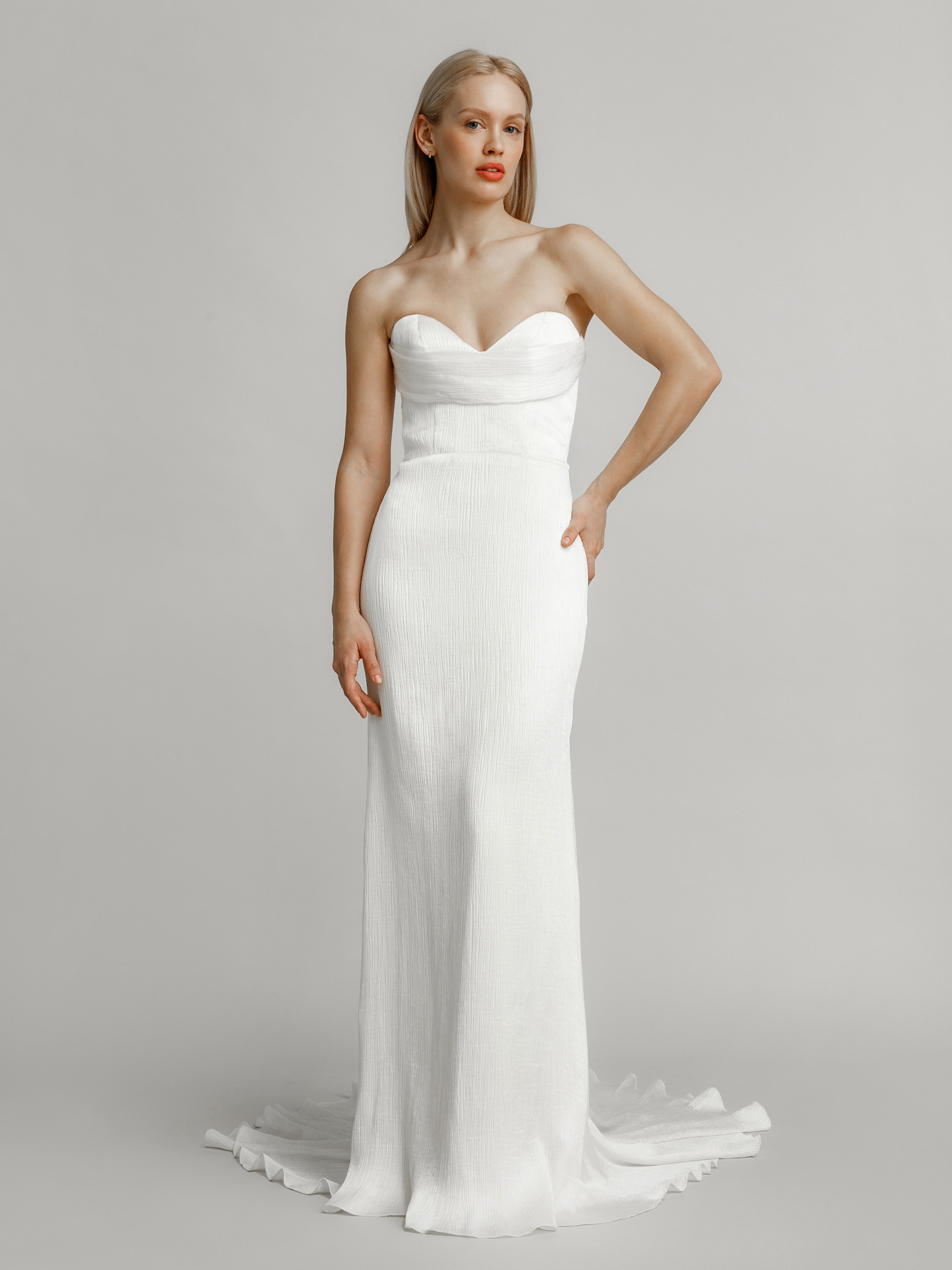 Venus is elegance in a clean, feminine silhouette. The flattering sweetheart neckline frames the collarbones while the cowl detailing and fabric — textured satin, liquid satin, or crepe — keep this classic bodice feeling contemporary and fresh. Venus is finished with a modern mermaid skirt and 65" train, and is lined in off-white midori. Our straight size model wears Venus in textured satin, and our curve model wears crepe.